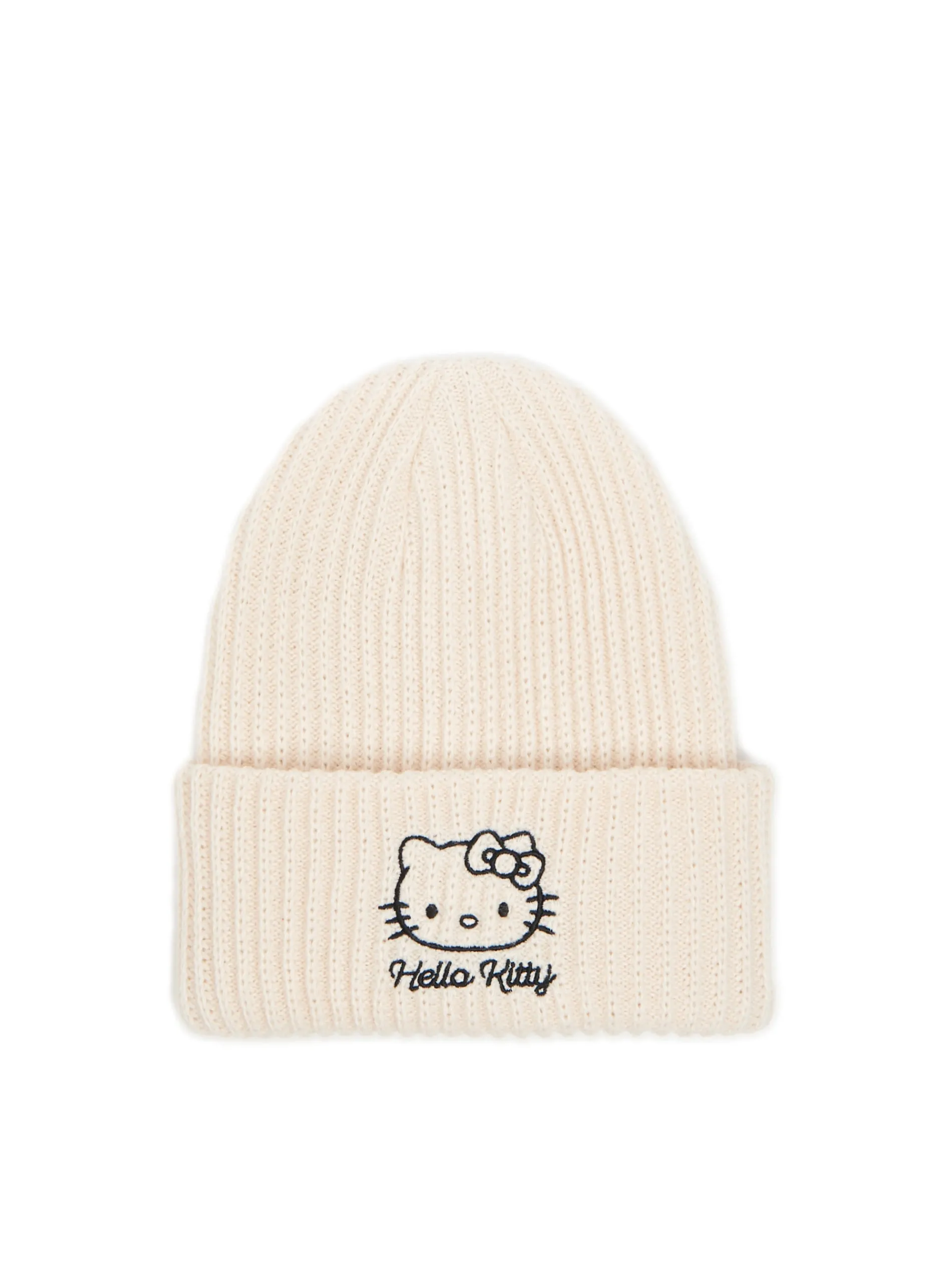 Damska zimowa czapka beanie, uszyta z kremowej dzianiny o prążkowanej fakturze. Z przodu haft z motywem słodkiej Hello Kitty. ©2013, 2023 SANRIO CO., LTD.
