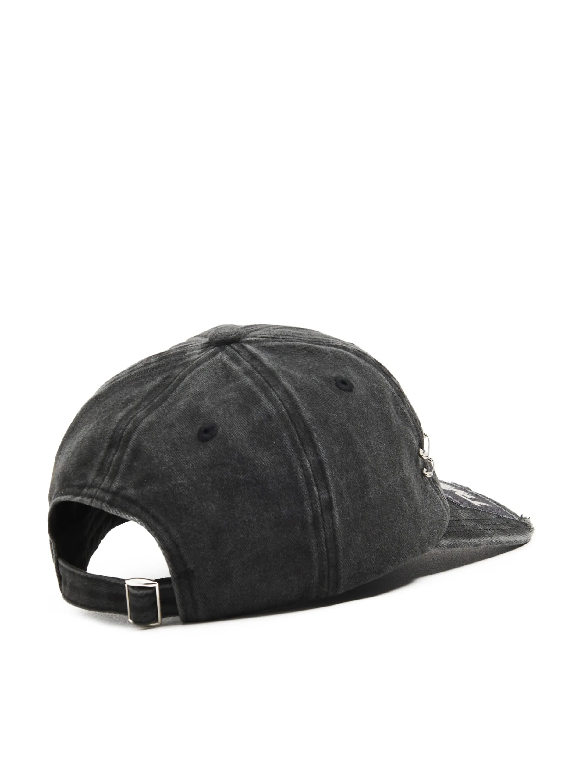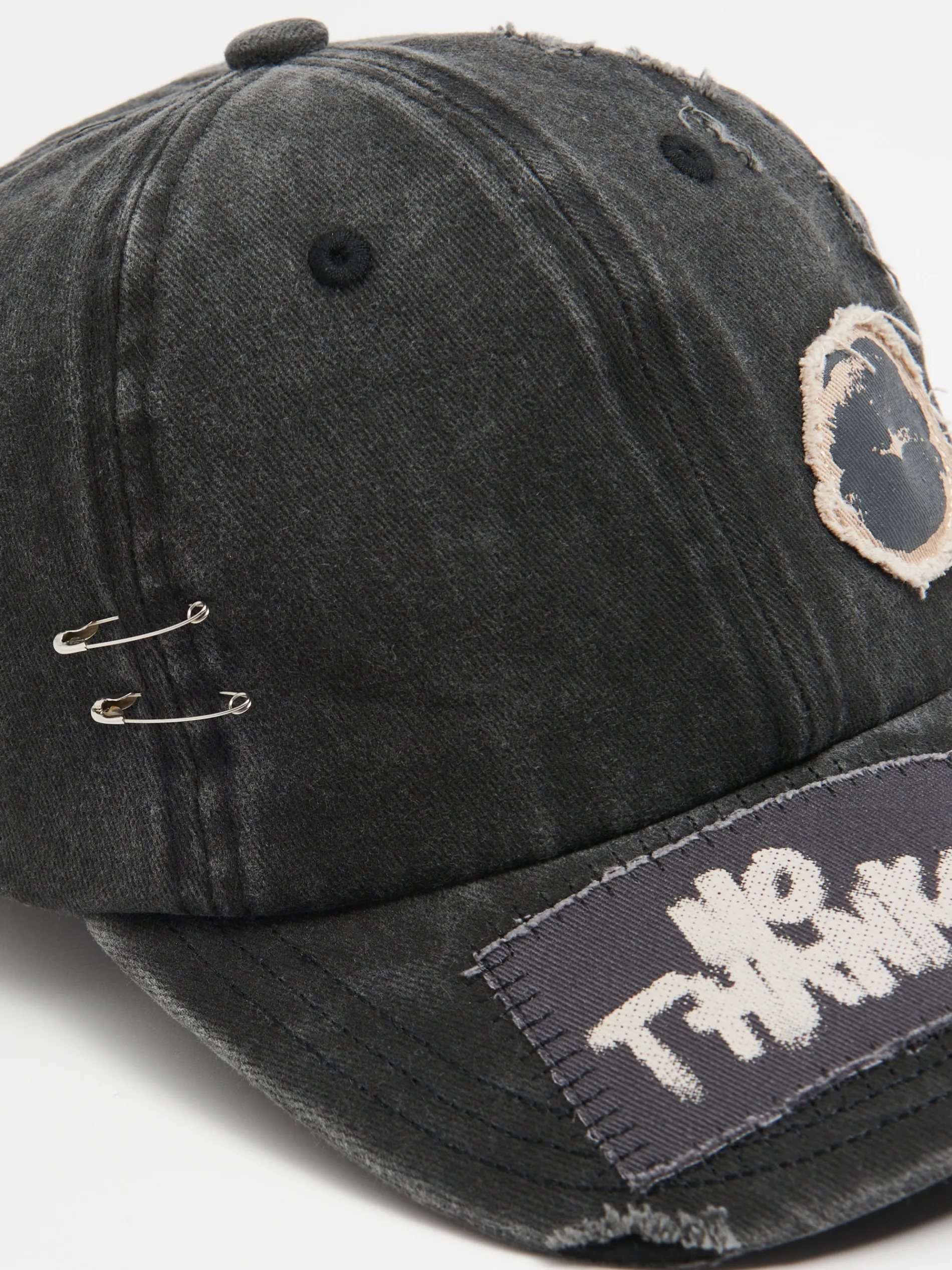 Damska czapka z daszkiem typu bejsbolówka, uszyta w 100% z bawełny. profilowany daszek z postrzępieniami z tyłu regulacja za pomocą paska ozdobne naszywki, agrafki i rozdarcia efekt sprania materiału