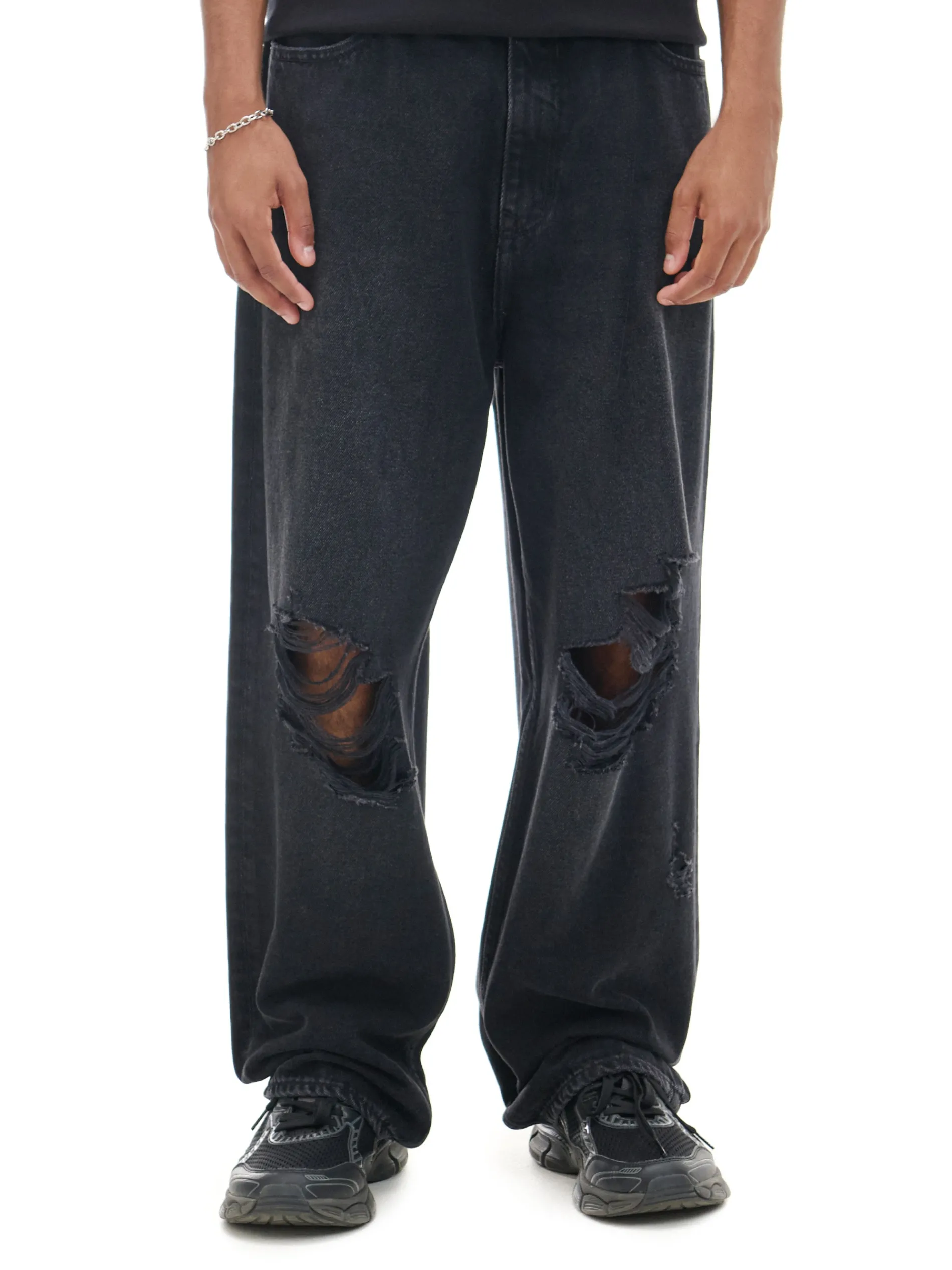 Spodnie męskie uszyte z denimowej tkaniny w kolorze czarnym z efektem sprania. Ten casual z ozdobnymi postrzępieniami będzie świetnym dodatkiem do Twoich stylizacji. 100% bawełny obszerny krój super baggy zapięcie na zamek i guzik długie, bardzo szerokie nogawki pięć kieszeni szlufki na pasek ozdobne postrzępienia efekt sprania na całości