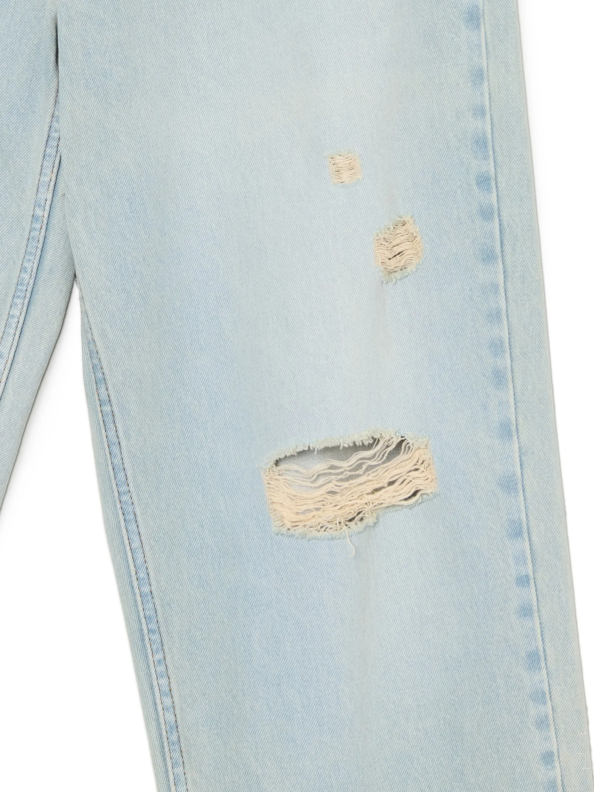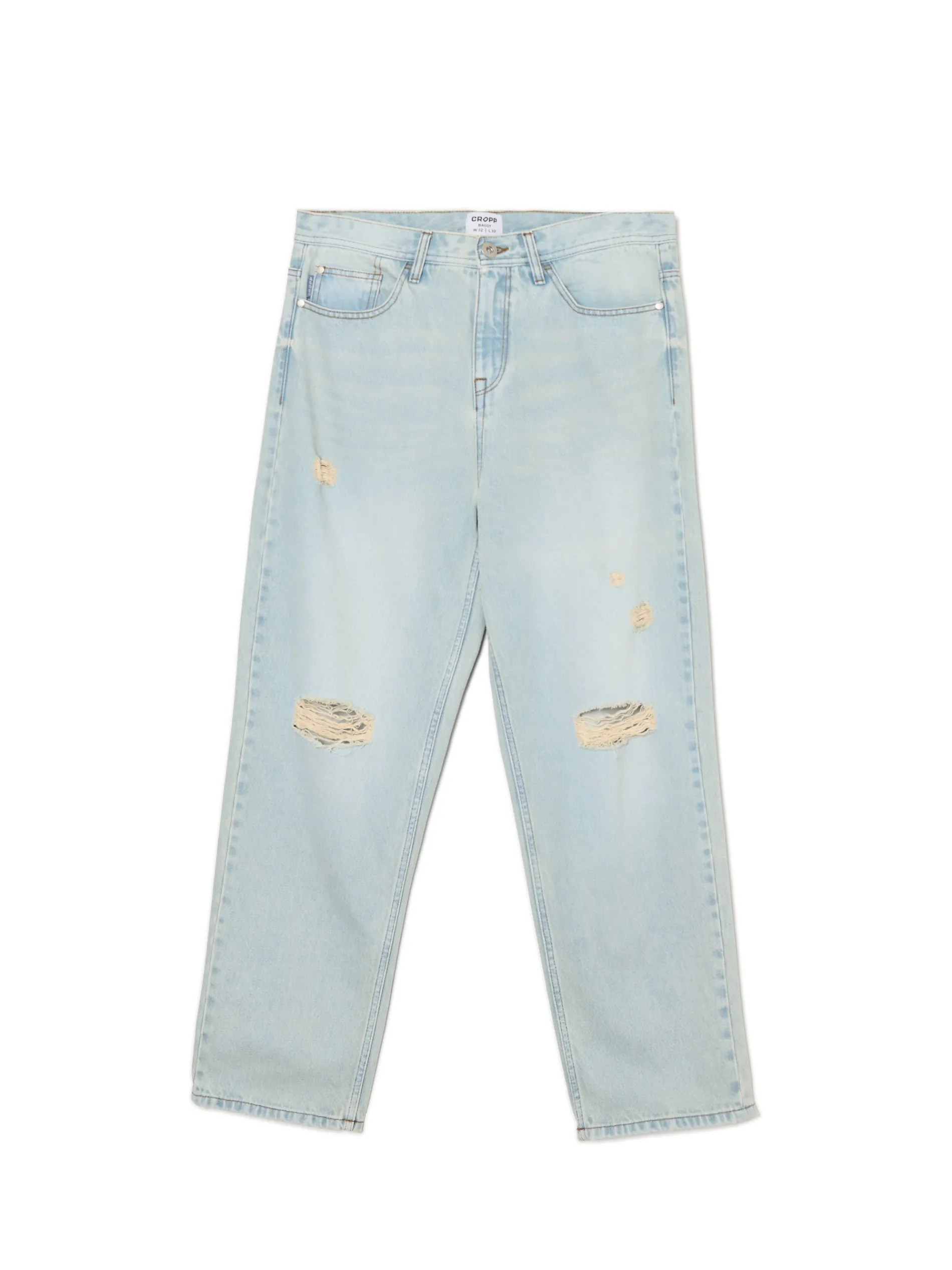 Ten męski model baggy w kolorze jasnego jeansu łączy w sobie klasykę z nowoczesnością. 100% bawełny w składzie regularny krój typu loose dwie kieszenie z przodu i z tyłu ozdobne przetarcia na kolanach szlufki blisko siebie – praktyczne rozwiązanie na pasek i ręce zmęczone po całym dniu Model prezentuje produkt w rozmiarze M. Wzrost modela: 185 cm