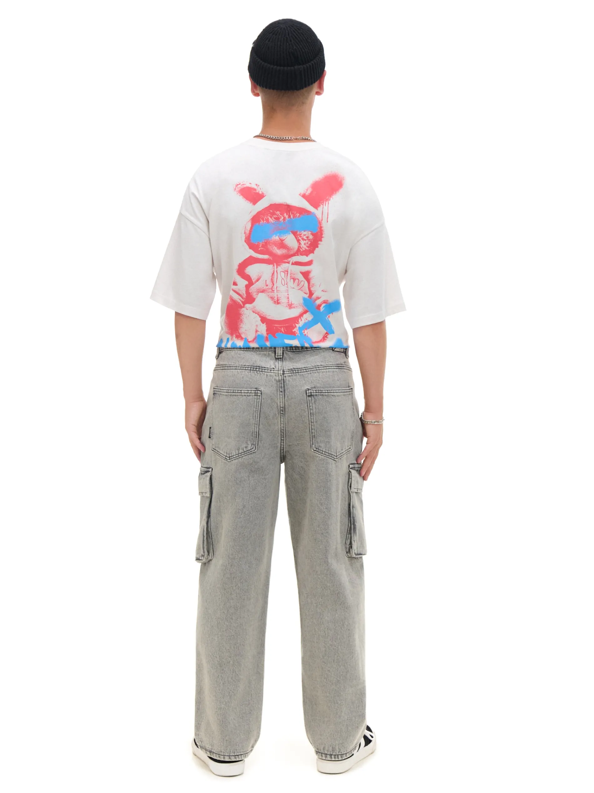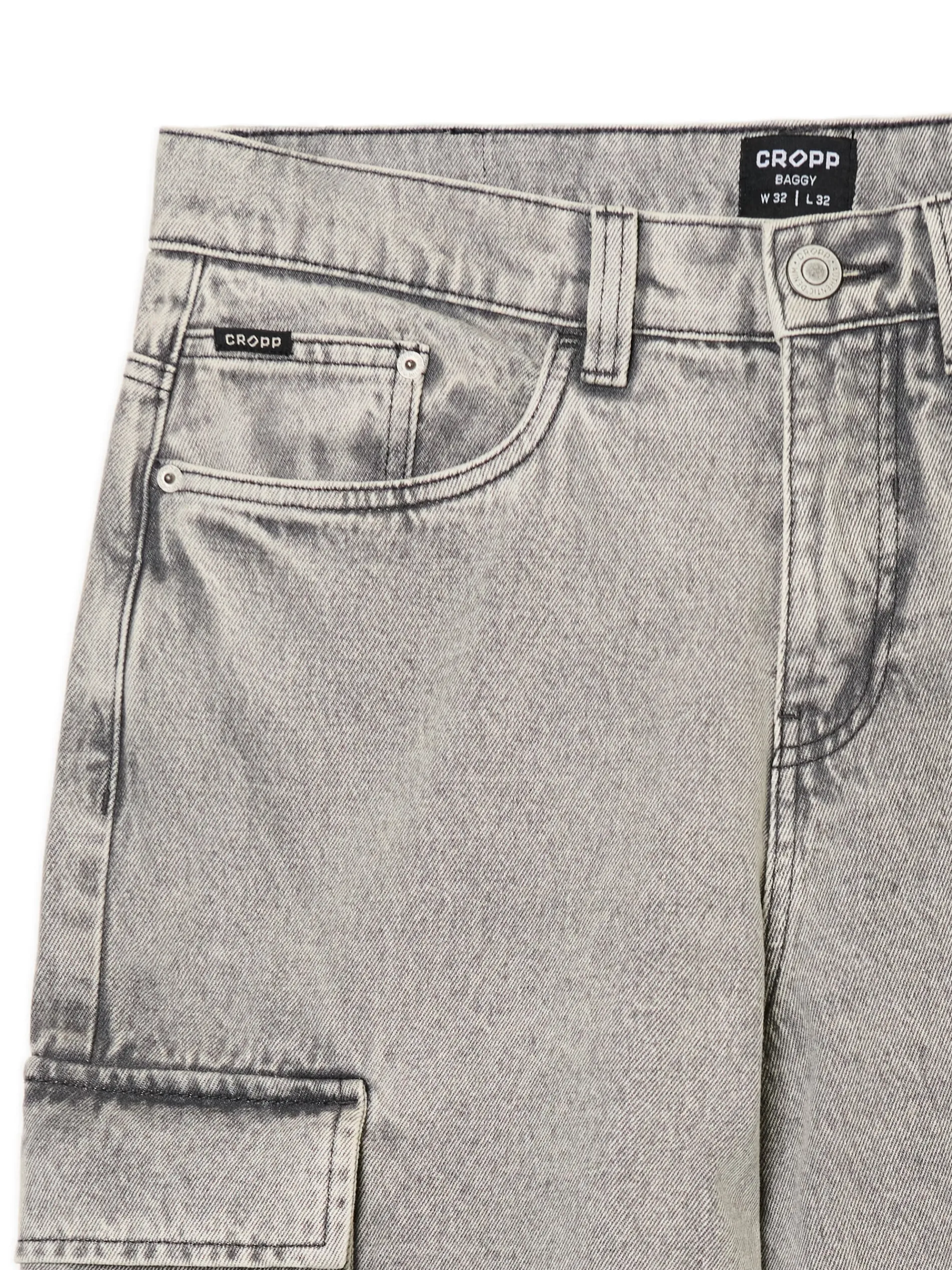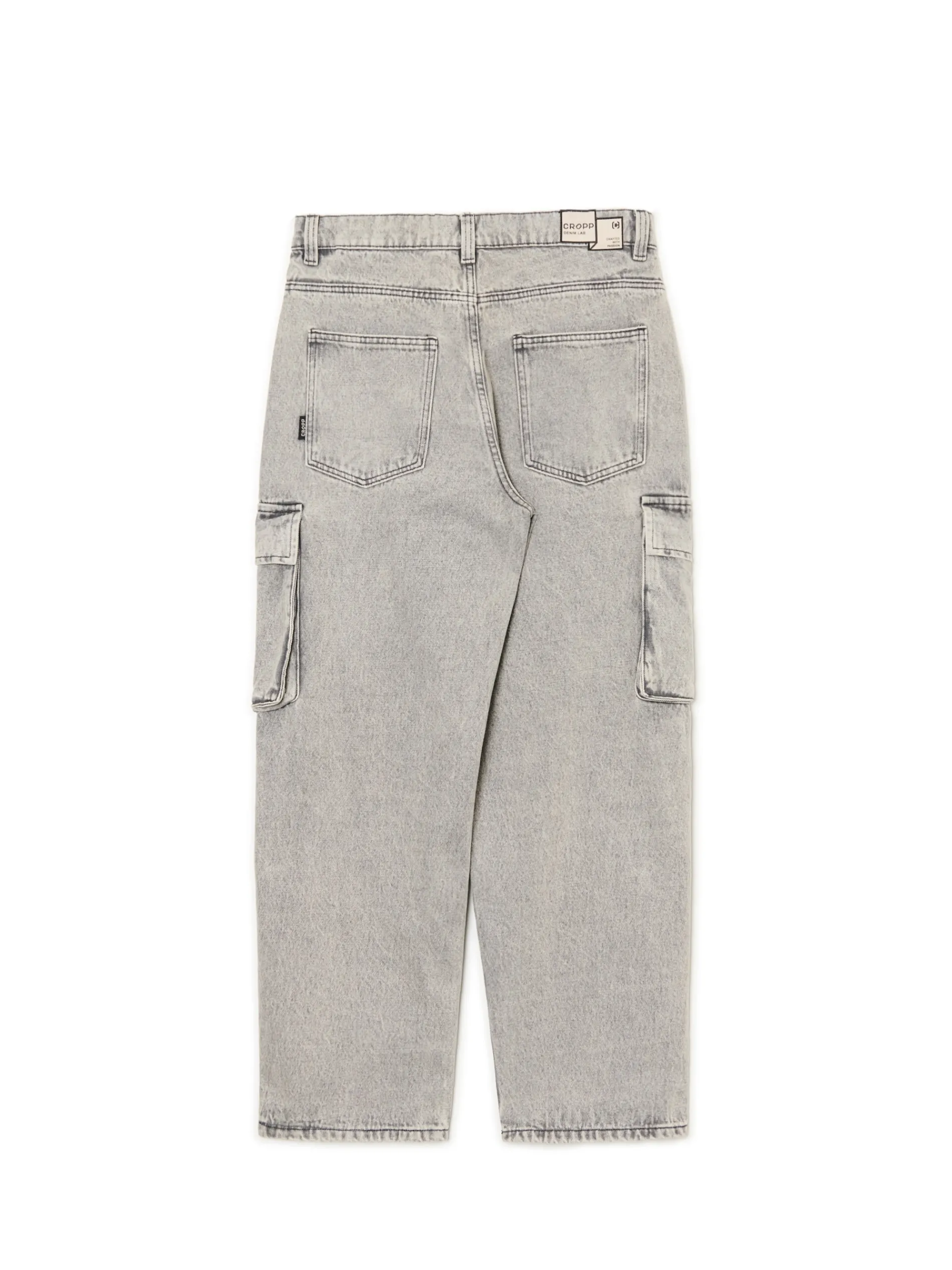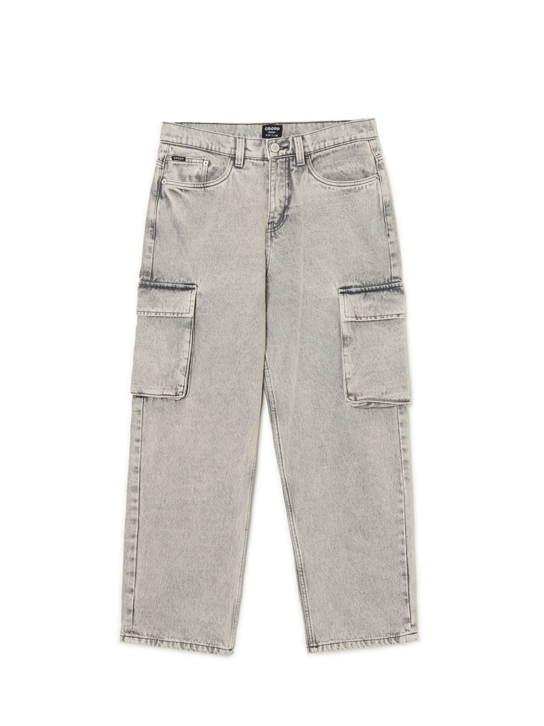 Męskie spodnie typu baggy uszyte z bawełnianej tkaniny. Dodatkowe kieszenie cargo z patkami i delikatny efekt sprania na całej powierzchni materiału nadają temu klasycznemu modelowi nowoczesności. 100% bawełny obszerny krój baggy zapięcie na zamek i guzik pięć kieszeni dodatkowe kieszenie cargo na nogawkach naszywka z napisem Cropp Wzrost modela: 185 cm
