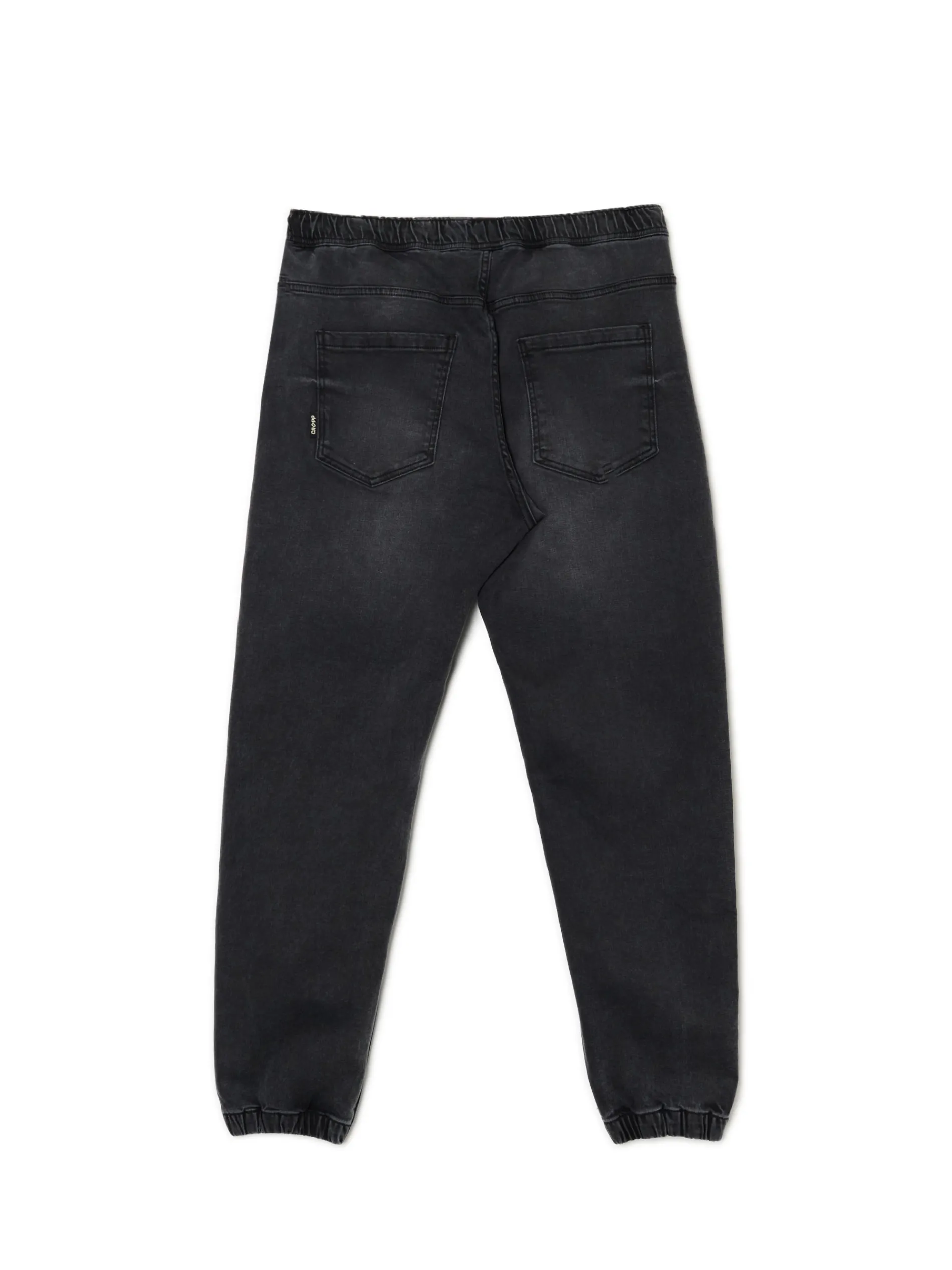Męskie jeansy typu jogger o sportowym kroju, idealne dla osób ceniących sobie wygodę. Uszyte z mieszanki tkanin o bardzo wysokiej zawartości bawełny. regularna nogawka, zakończona ściągaczem z wszytą elastyczną gumką w pasie elastyczna gumka i sznurek do regulacji pięć kieszeni imitacja rozporka efekt sprania materiału