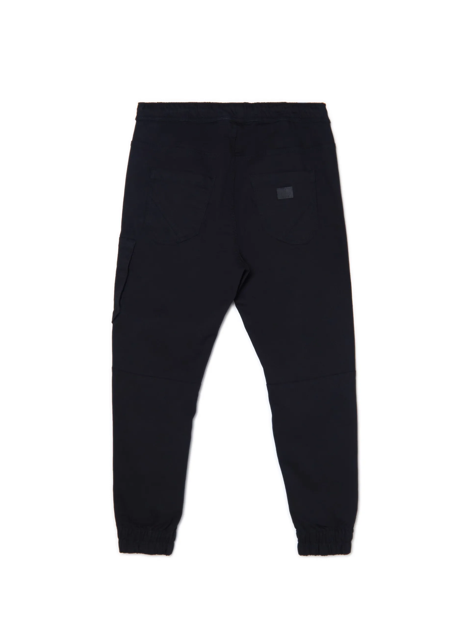 Czarne spodnie jeansowe o kroju jogger chino, uszyte z tkaniny o wysokiej zawartości bawełny. regularny stan, w pasie gumka i sznurek do regulacji pięć kieszeni, w tym jedna cargo, zapinana na suwak imitacja rozporka wąska nogawka z ukośnymi przeszyciami, zakończona ściągaczem Wzrost modela: 184 cm