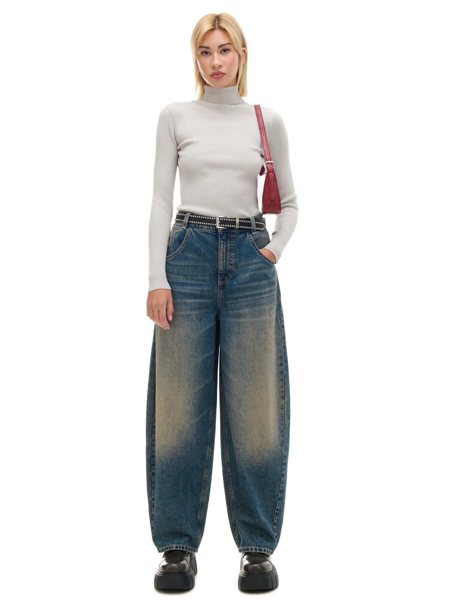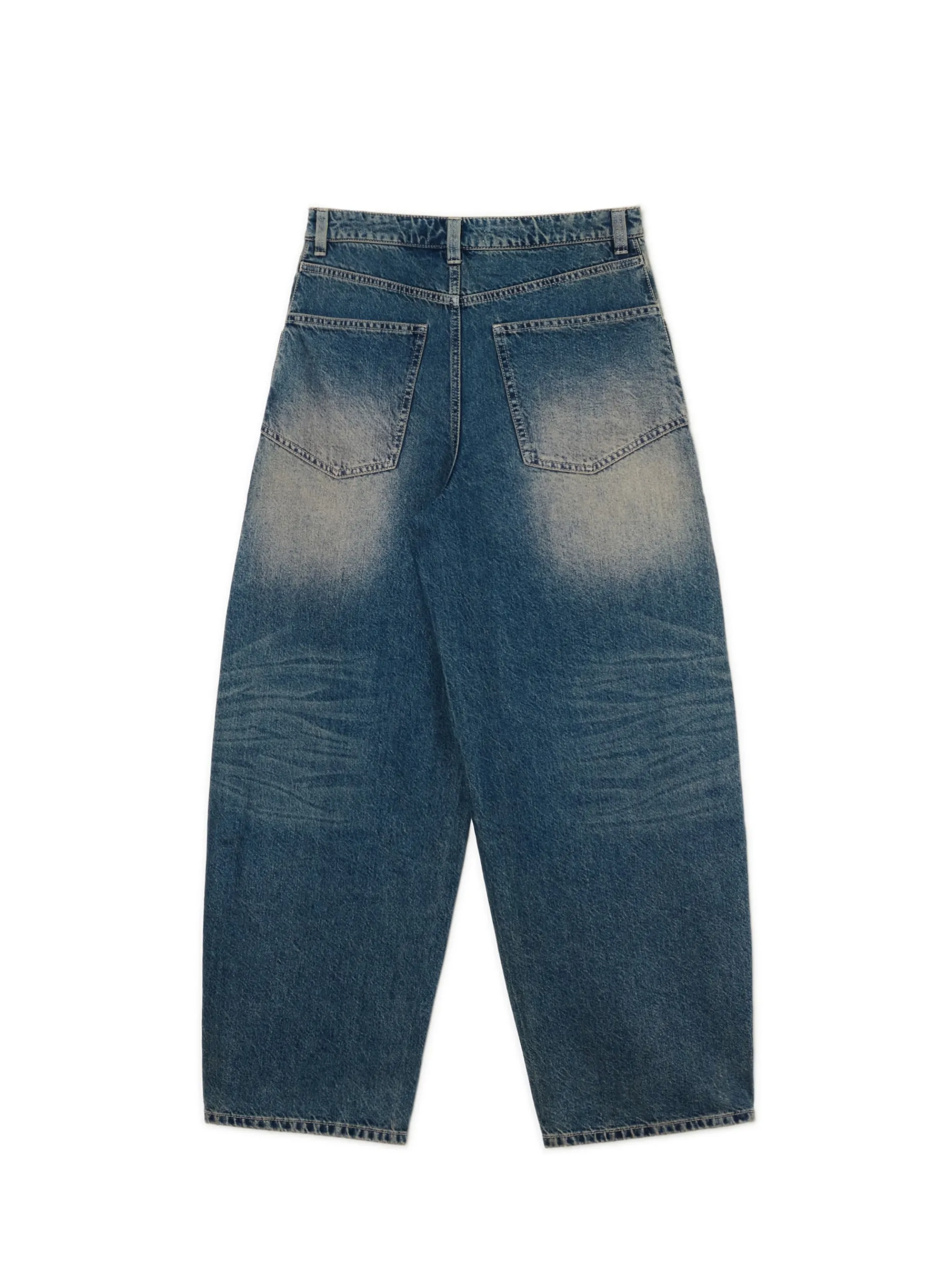 Damskie spodnie jeansowe o luźnym kroju, uszyte z bawełnianej tkaniny. Po obu stronach nieregularny efekt sprania. Item dobrze trzyma się na biodrach i fituje z dopasowanymi topami. 100% bawełny denimowe spodnie o kroju skater zapięcie na zamek i guzik długie, szerokie nogawki cztery kieszenie szlufki na pasek efekt sprania na całości Wzrost modelki: 177 cm