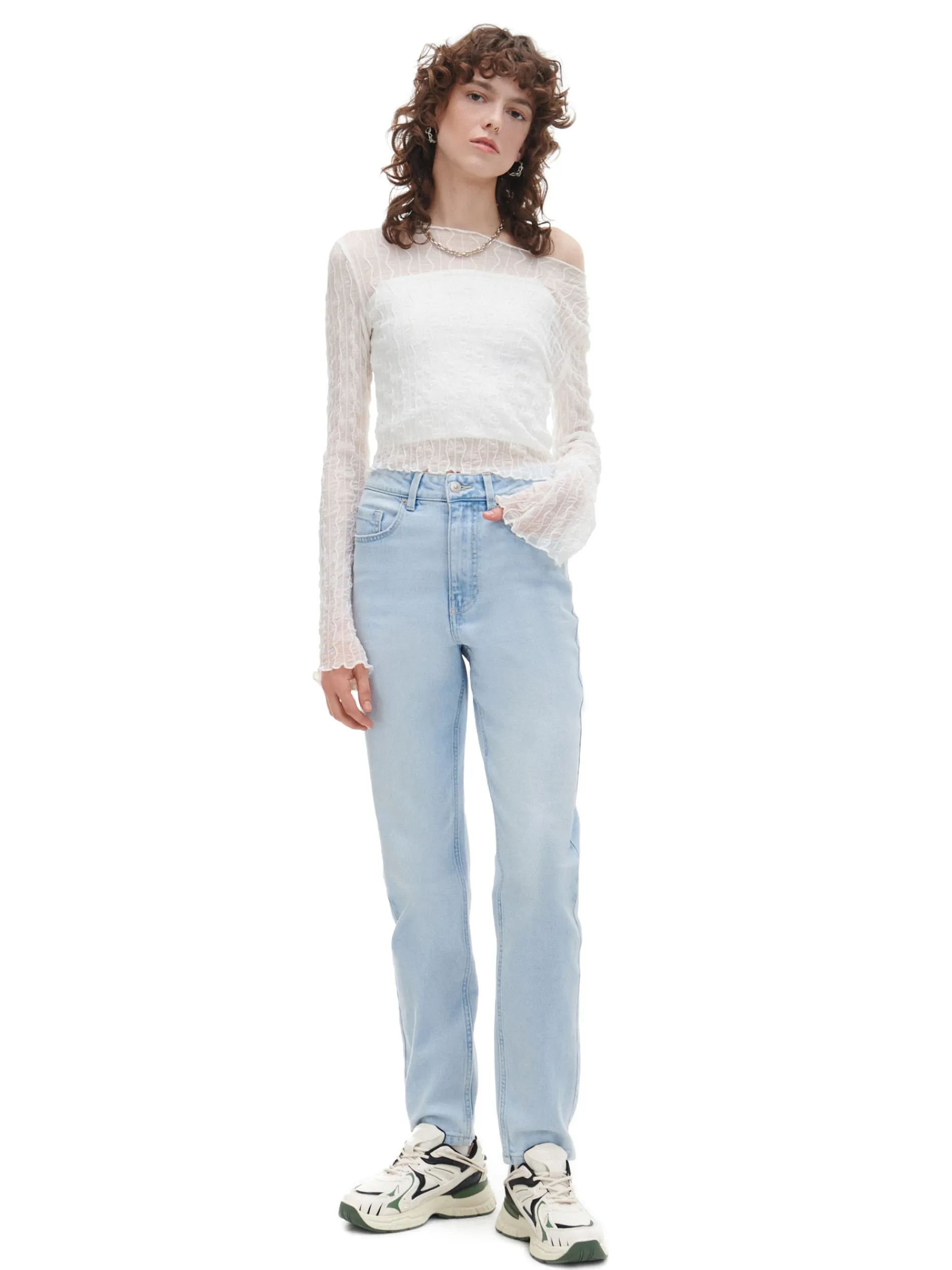 Damskie spodnie jeansowe o kroju mom slim, uszyte z bawełny z dodatkiem elastanu. wysoki stan zapięcie na zamek i guzik 5 kieszeni zwężana u dołu, dłuższa niż standardowa nogawka na całości efekt sprania