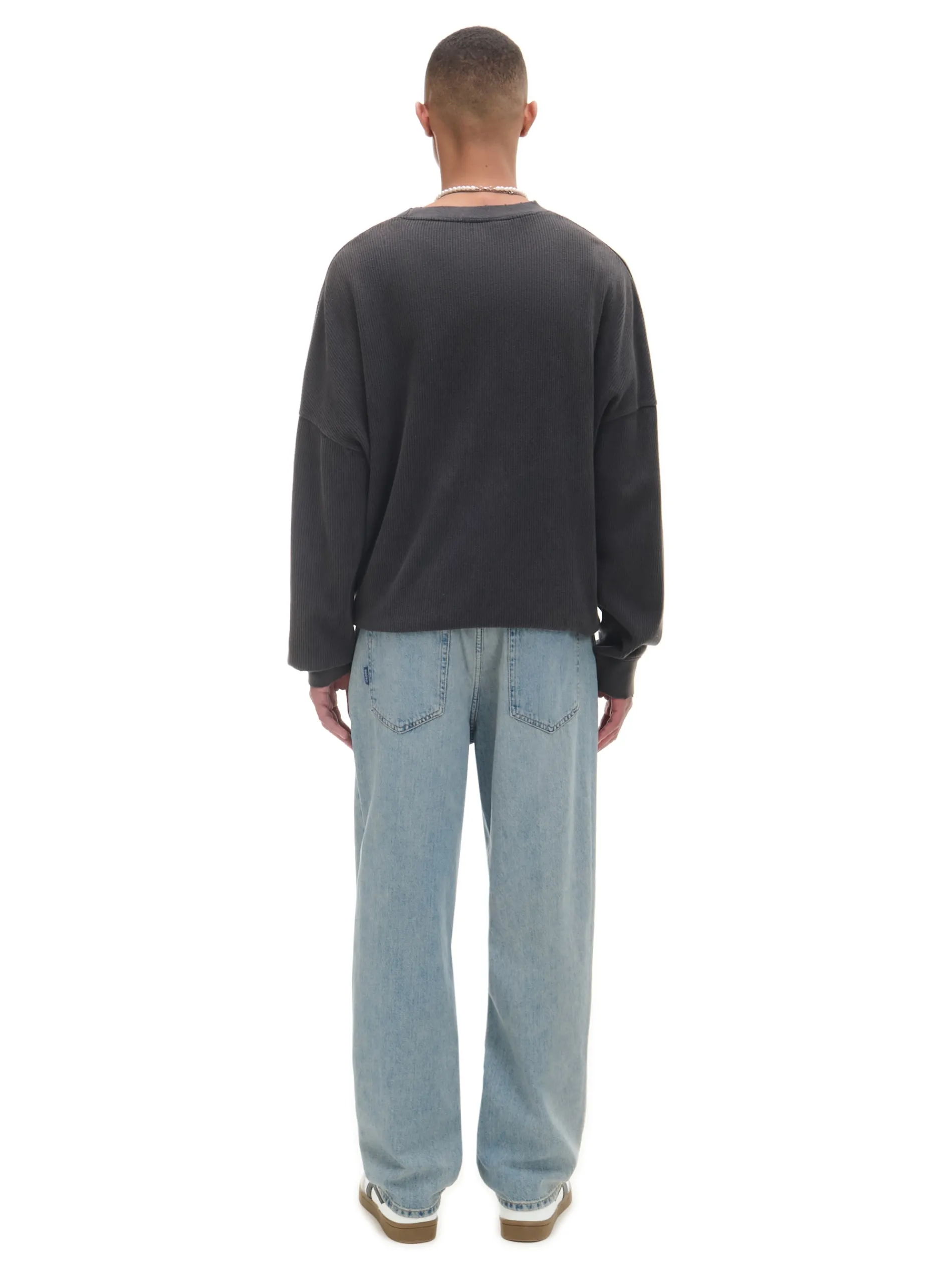 Męskie spodnie jeansowe typu relaxed, uszyte z bawełnianej tkaniny. Szlufki blisko siebie to praktyczne rozwiązanie na zmęczone ręce po całym dniu. Zrelaksuj się! 100% bawełny prosty krój zapięcie na zamek i guzik wąskie szlufki na pasek pięć kieszeni delikatny efekt sprania Wzrost modela: 185 cm