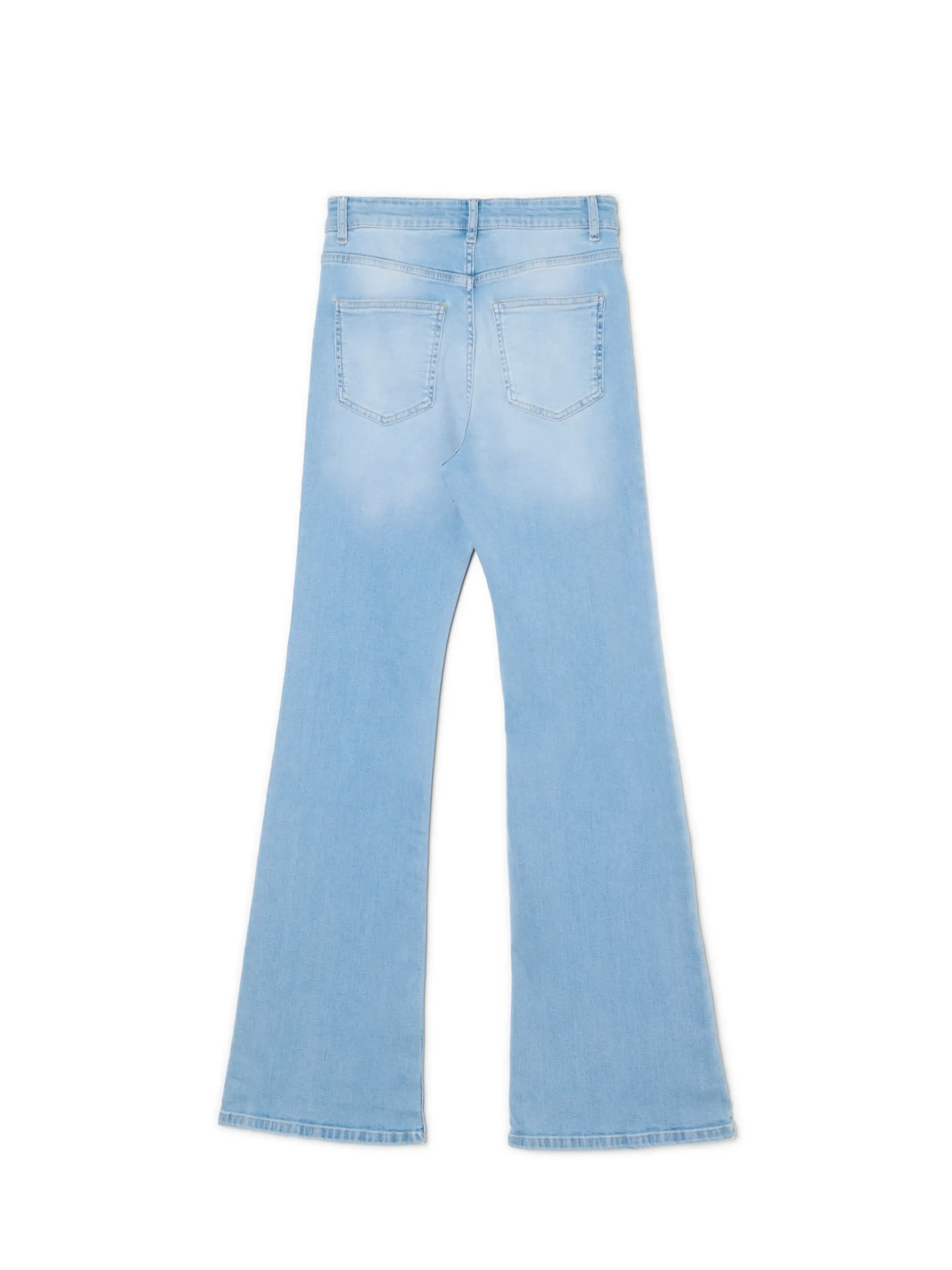 Spodnie damskie o kroju slim flare, uszyte z elastycznego denimu. Delikatny efekt sprania i rozszerzane nogawki wyróżniają ten model. denim o szarym odcieniu z delikatnym efektem sprania zapięcie na zamek i guzik długie nogawki rozszerzane u dołu pięć kieszeni szlufki na pasek Wzrost modelki: 172 cm