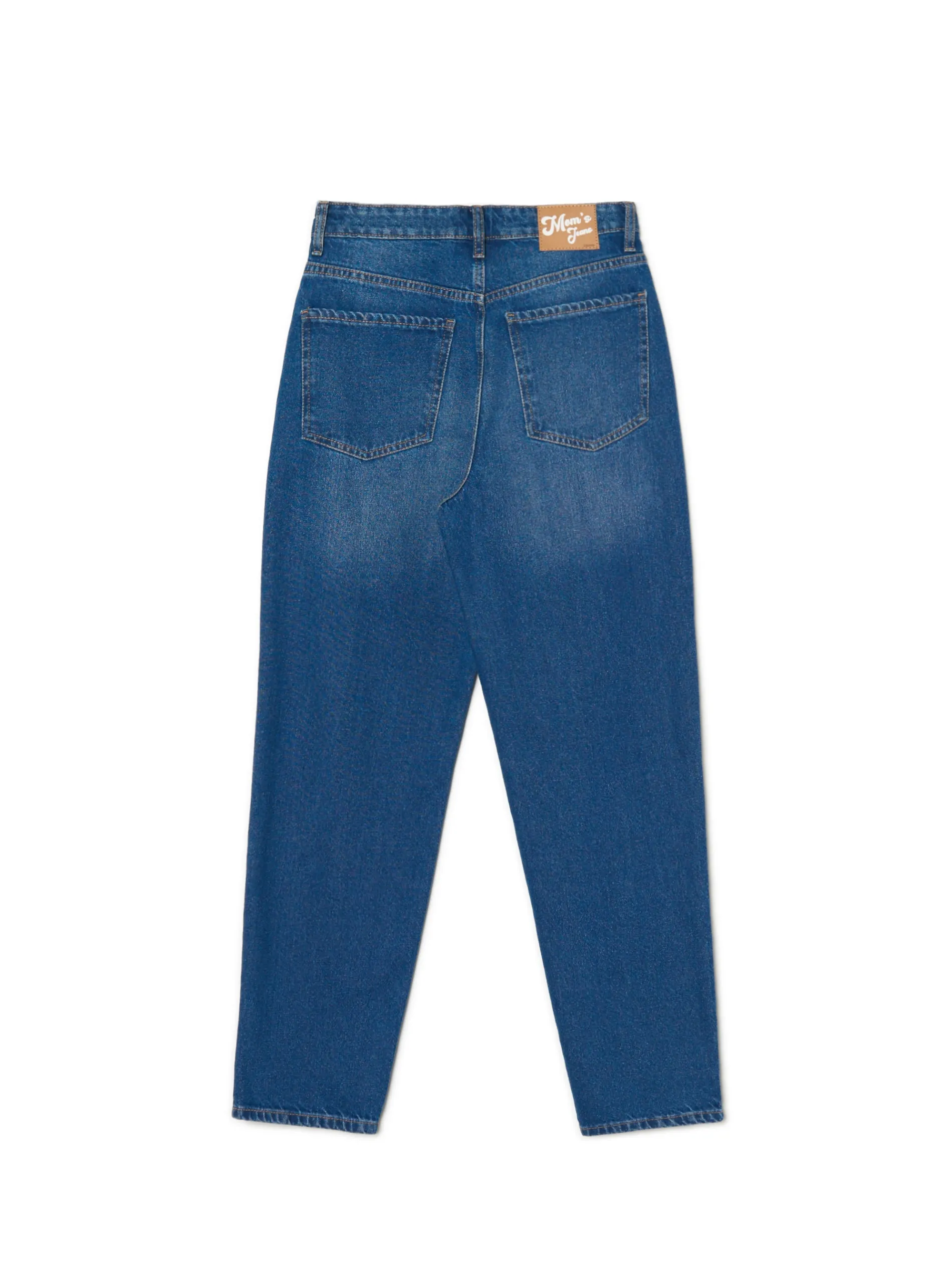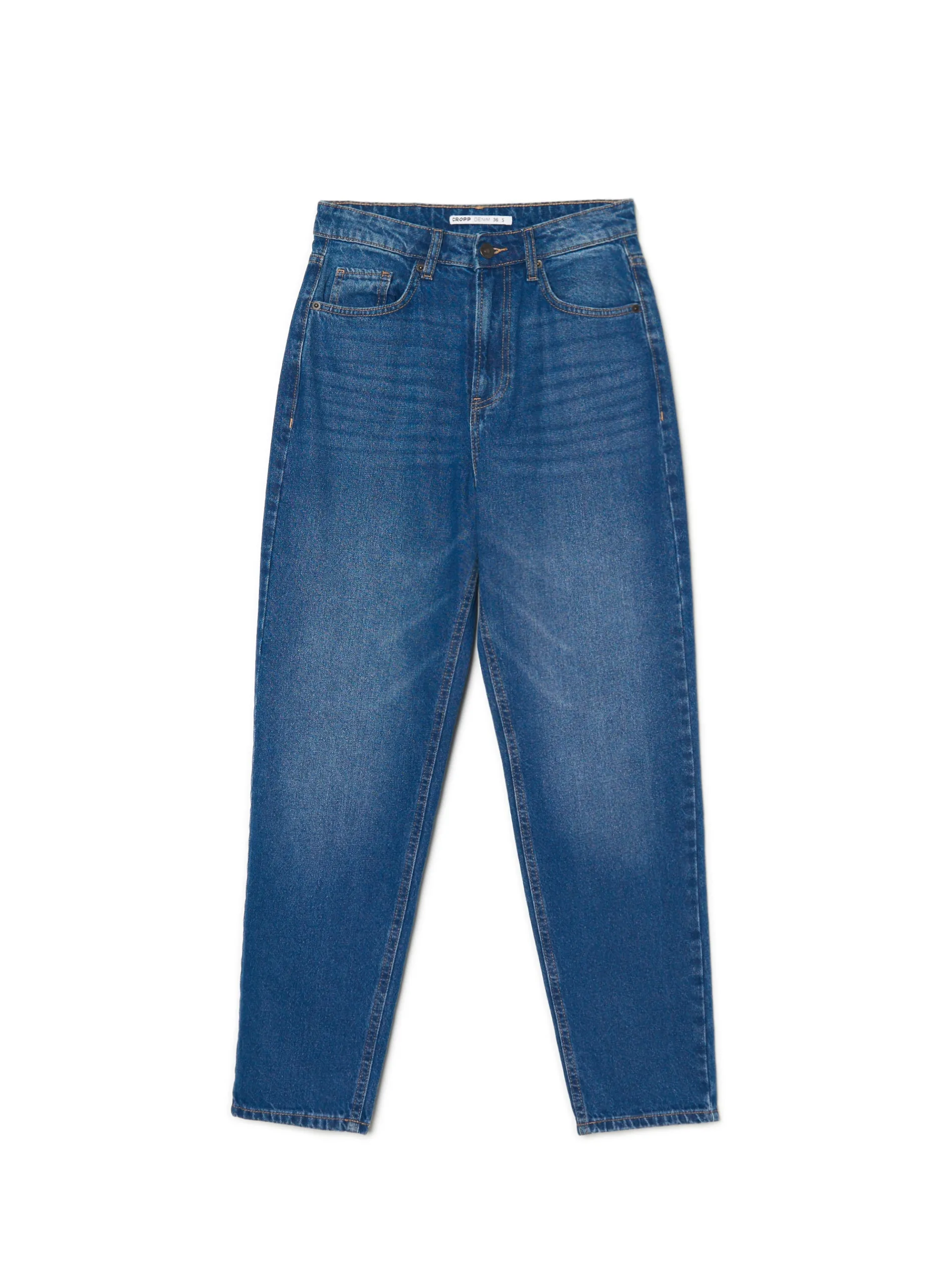 Damskie niebieskie spodnie jeansowe o kroju mom, uszyte z bawełny. wysoki stan zapięcie na zamek i guzik 5 kieszeni szeroka nogawka zwężana u dołu dostępne inne warianty kolorystyczne