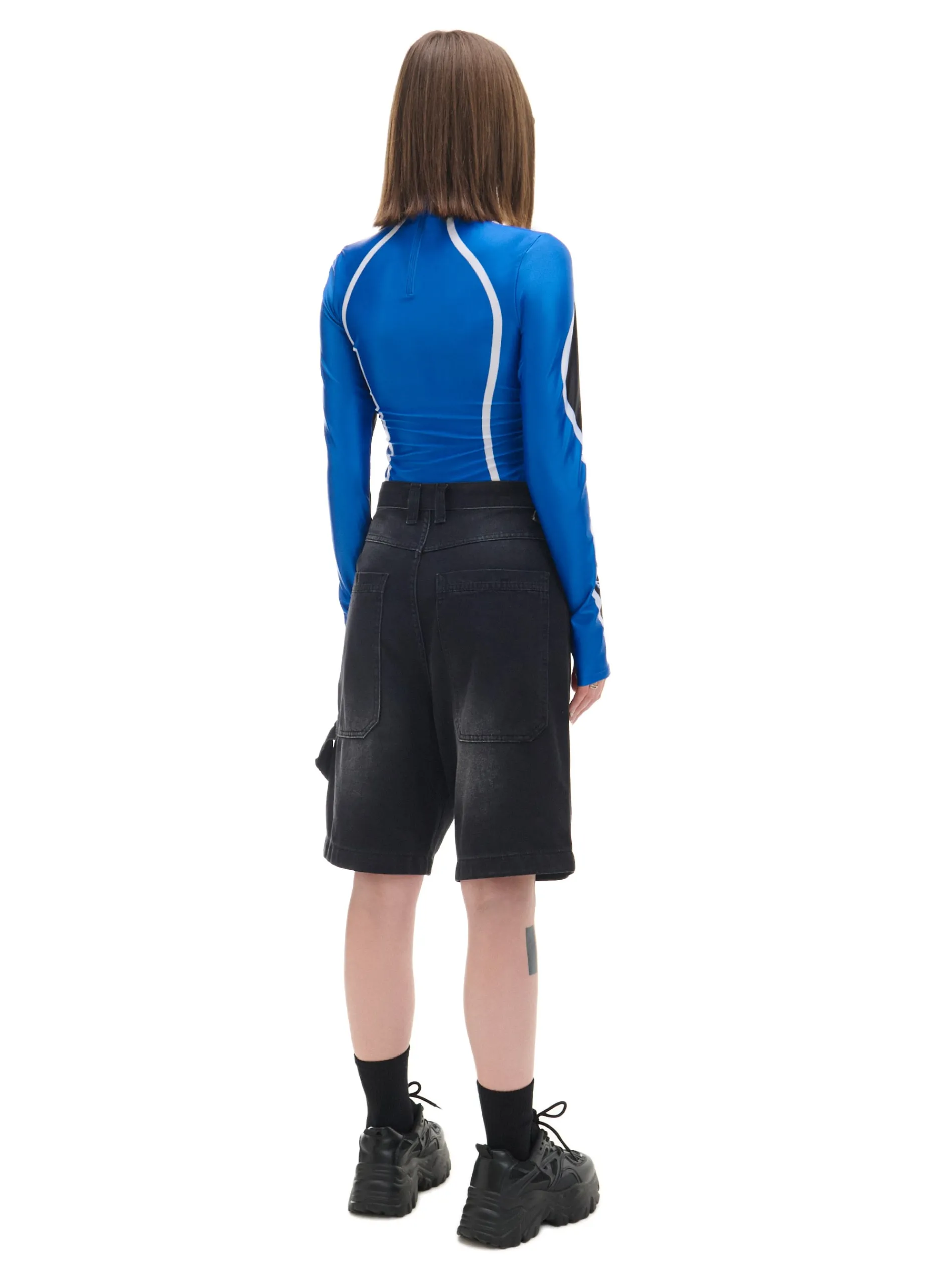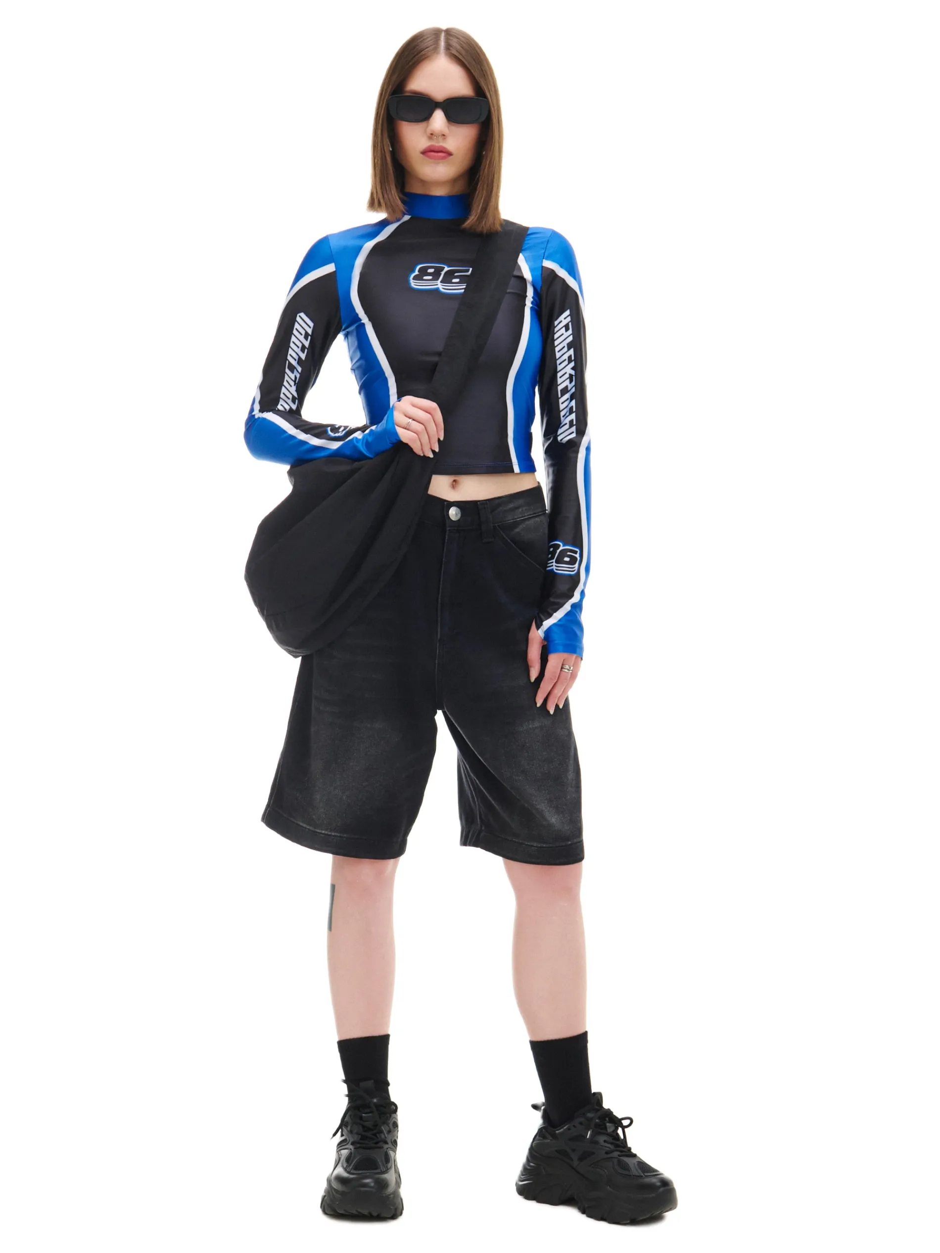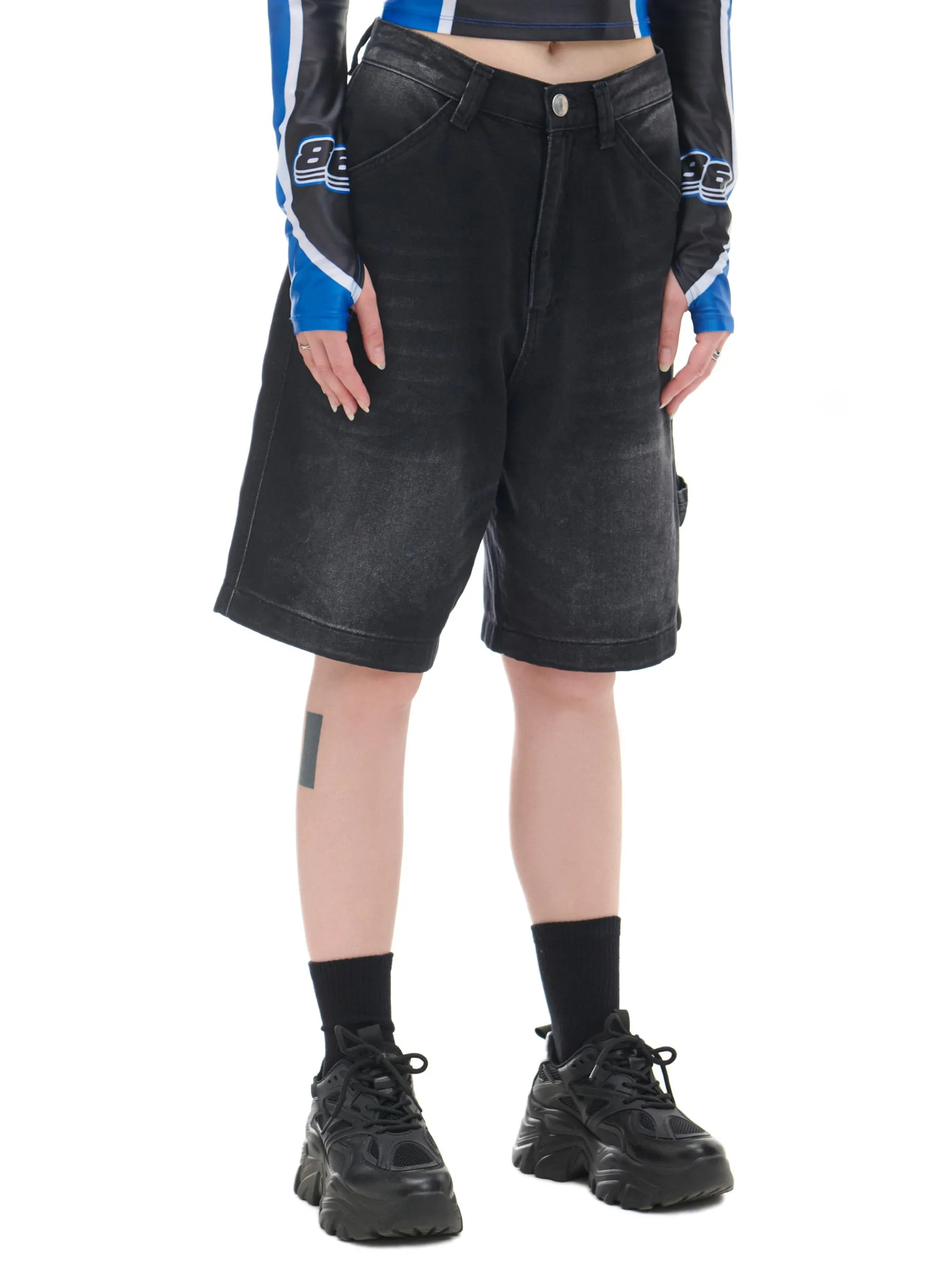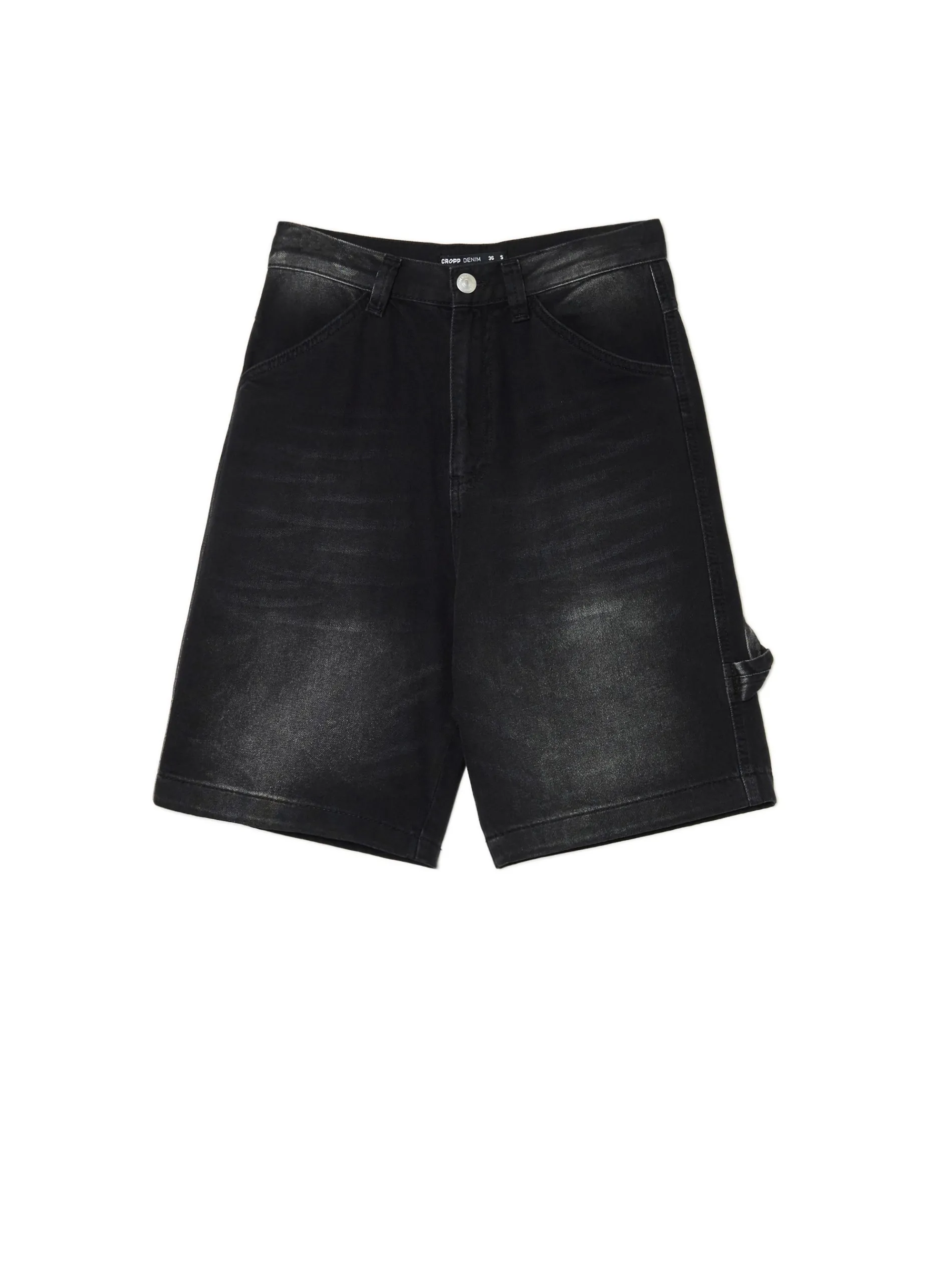 Damskie luźne bermudy uszyte z denimu. Dobierz do nich ulubione topy i w drogę! 100% bawełny luźny, swobodny krój zapięcie na suwak i guzik dwie kieszenie z przodu dwie naszyte kieszenie tylnie hammer loop na lewej nogawce ozdobne nity i pinezki Wzrost modelki: 172 cm