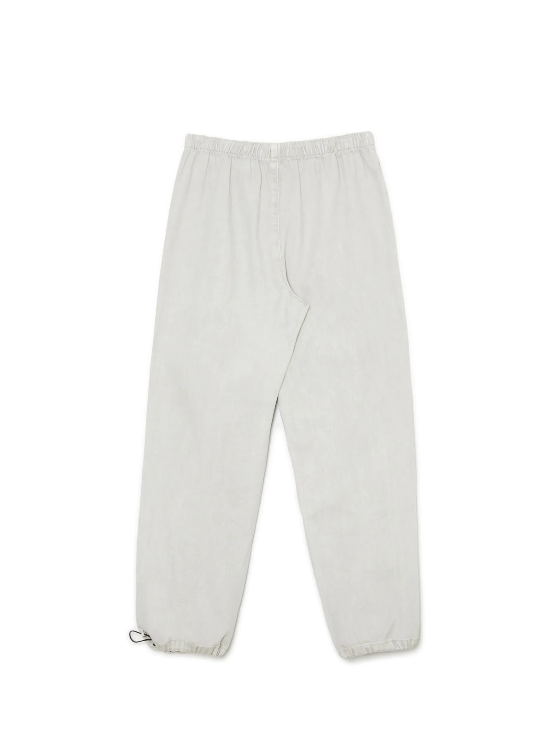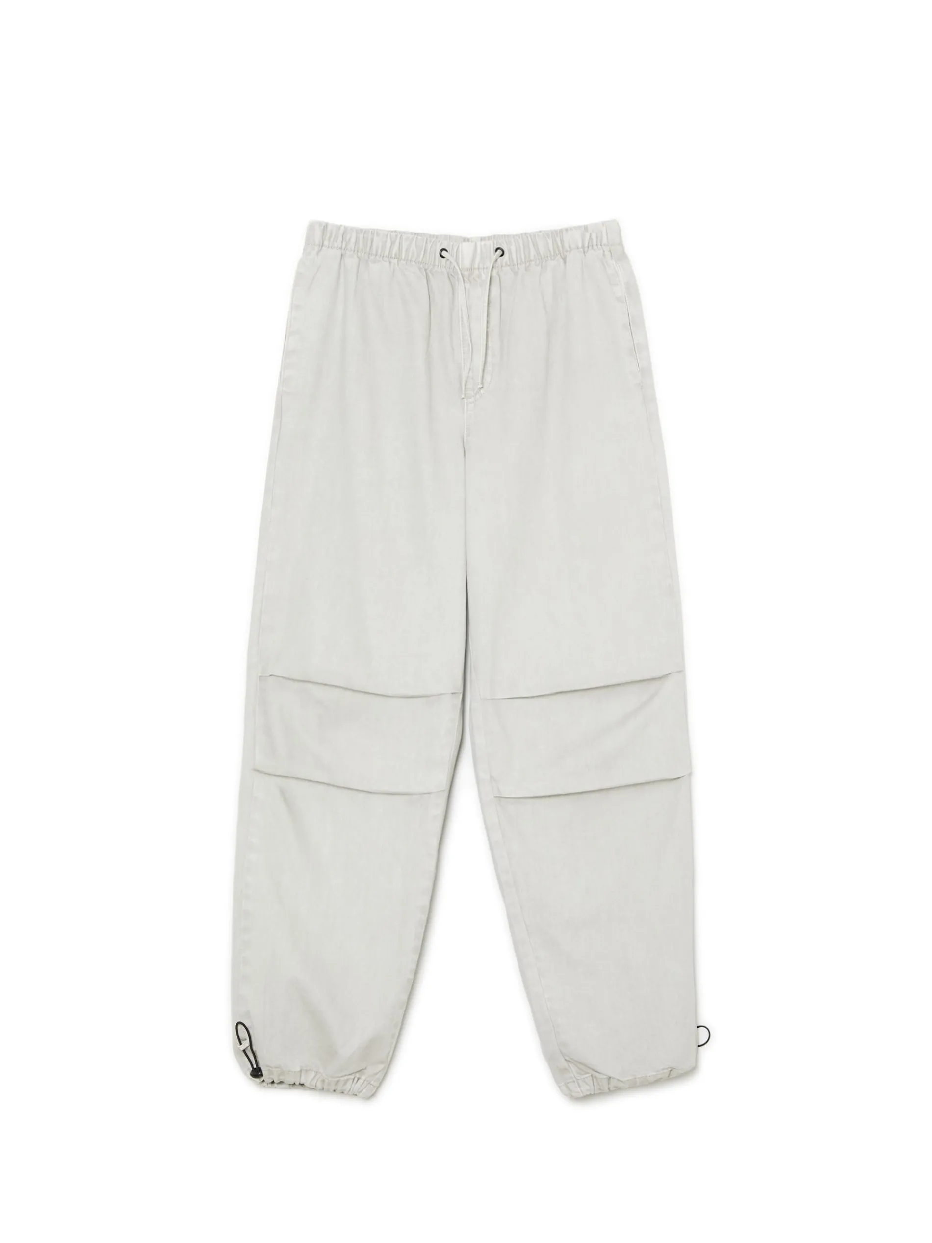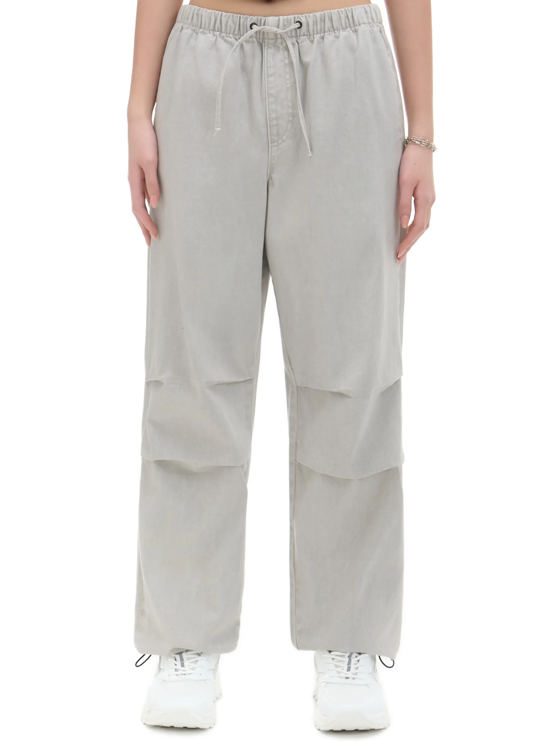 Damskie spodnie jeansowe o swobodnym fasonie parachute, uszyte z bawełny. W pasie gumka i sznurek do regulacji, boczne kieszenie, szeroka nogawka z regulacją u dołu. Wzrost modelki: 168 cm