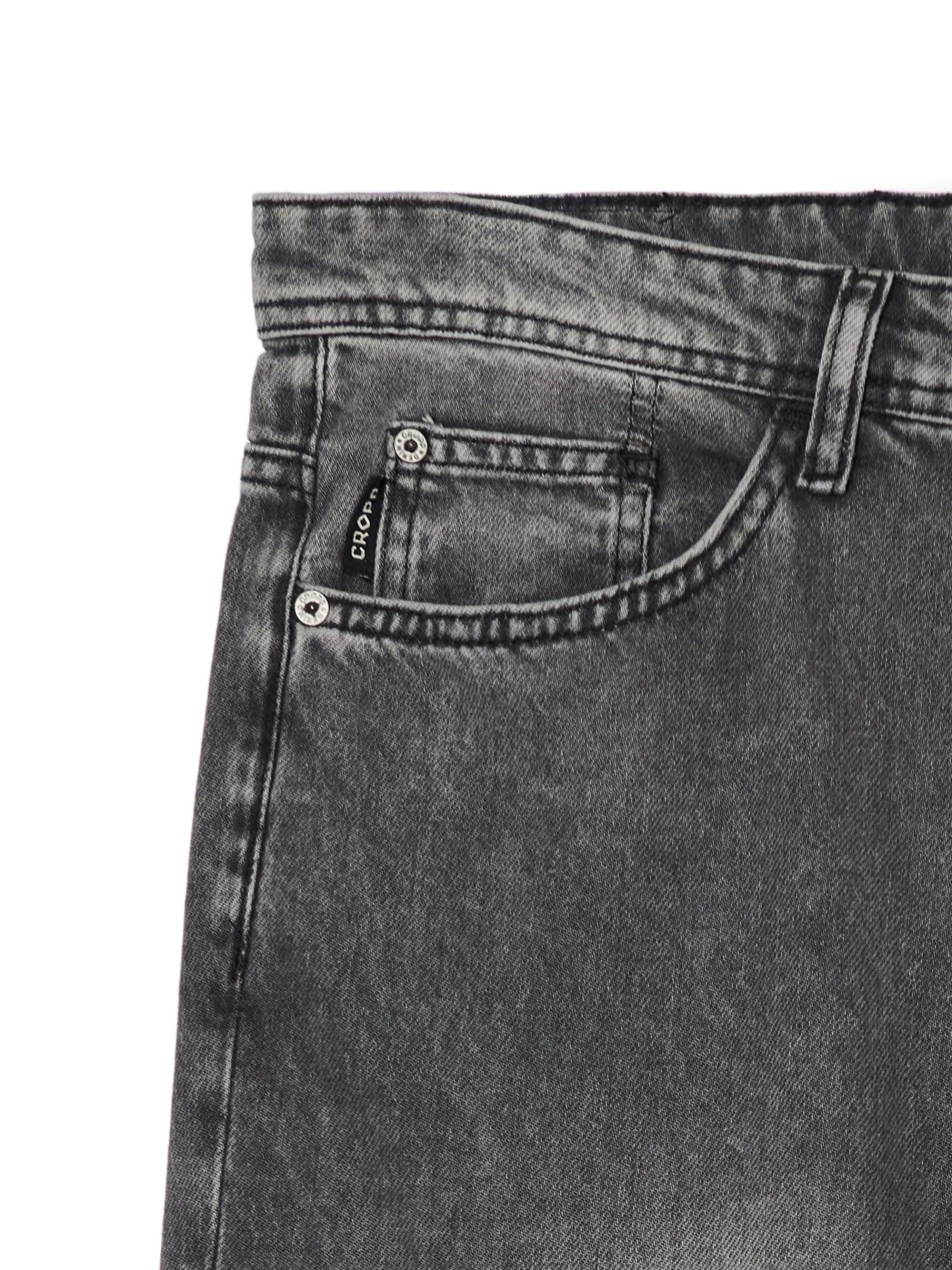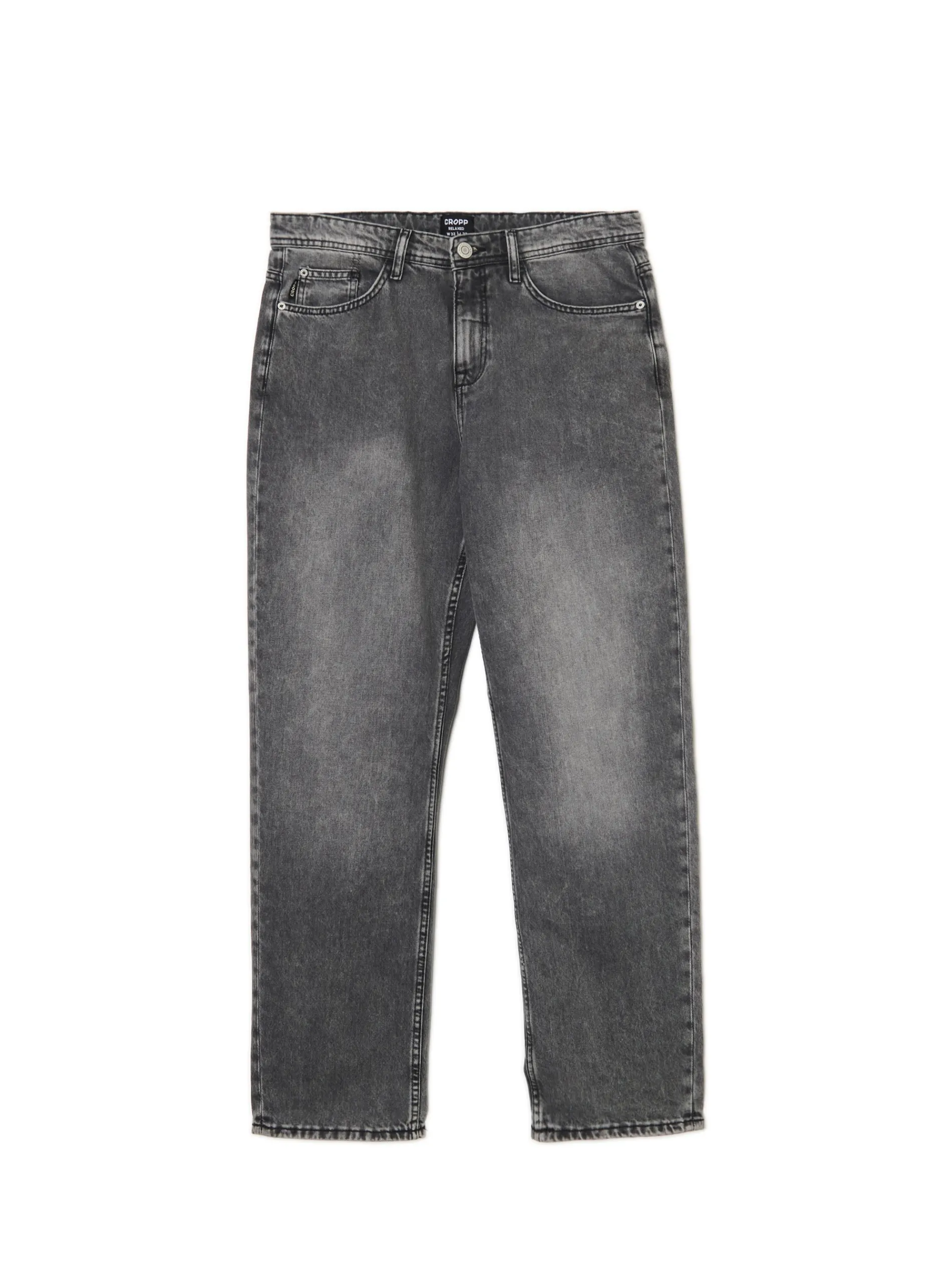Męskie spodnie jeansowe typu relaxed, uszyte z bawełnianej tkaniny w szarym kolorze. Szlufki blisko siebie to praktyczne rozwiązanie na zmęczone ręce po całym dniu. Zrelaksuj się! denim o szarym odcieniu z delikatnym efektem sprania prosty krój zapięcie na zamek i guzik wąskie szlufki na pasek pięć kieszeni