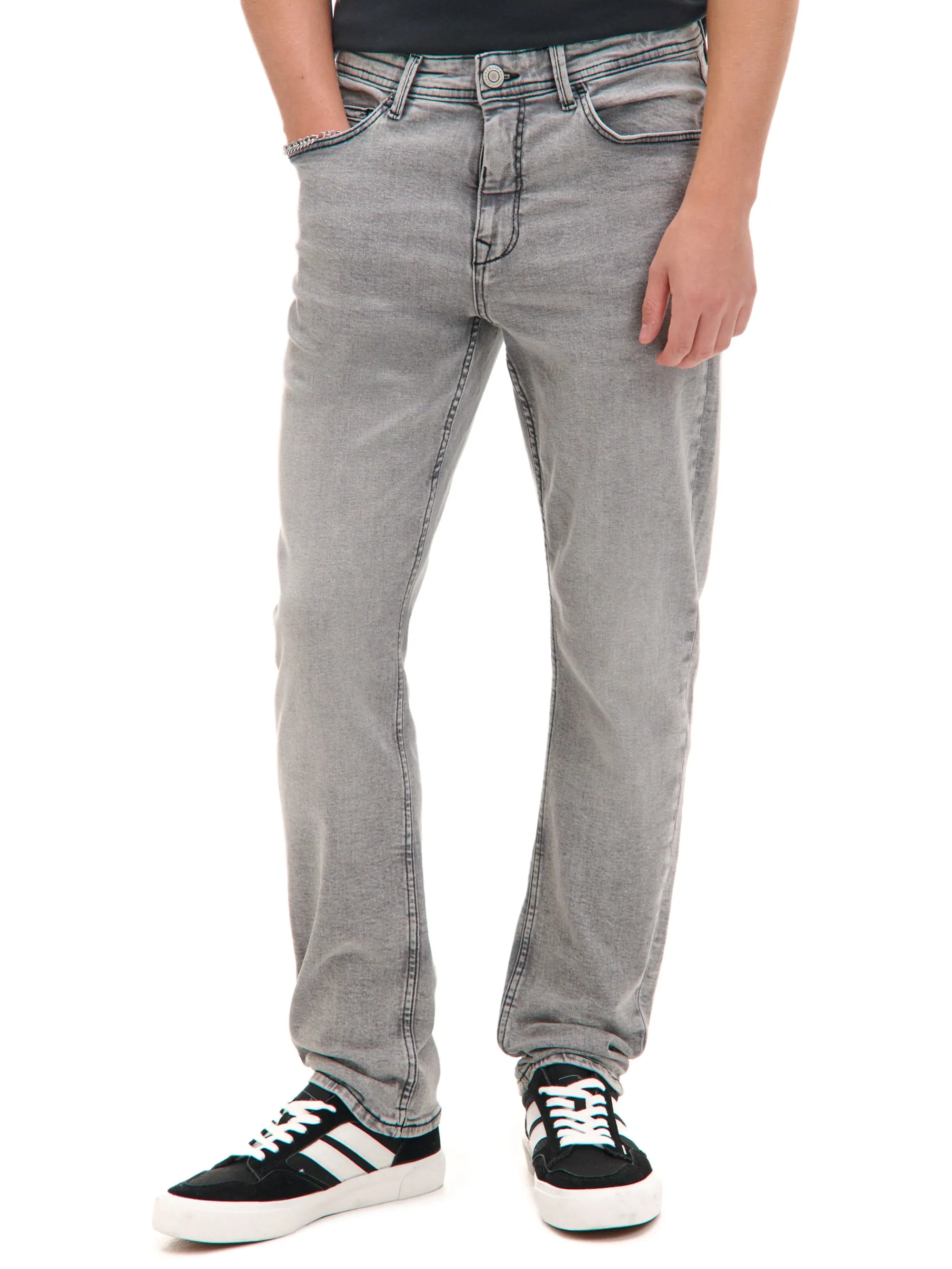 Męskie spodnie jeansowe o kroju slim, uszyte z bawełnianej tkaniny z dodatkiem elastanu. Dostępne w różnych kolorach. bawełna z dodatkiem elastycznych włókien jeansowe spodnie typu slim zapięcie na zamek i guzik średni stan długie, dopasowane nogawki pięć kieszeni szlufki na pasek efekt sprania na całości Wzrost modela: 185 cm