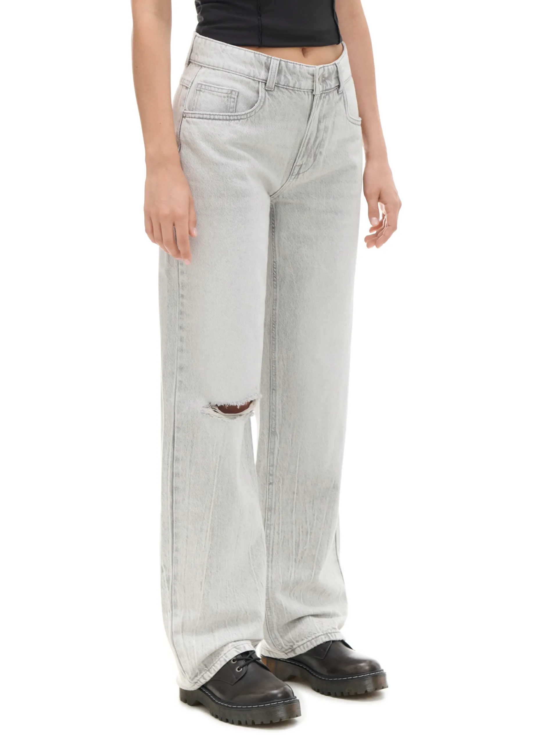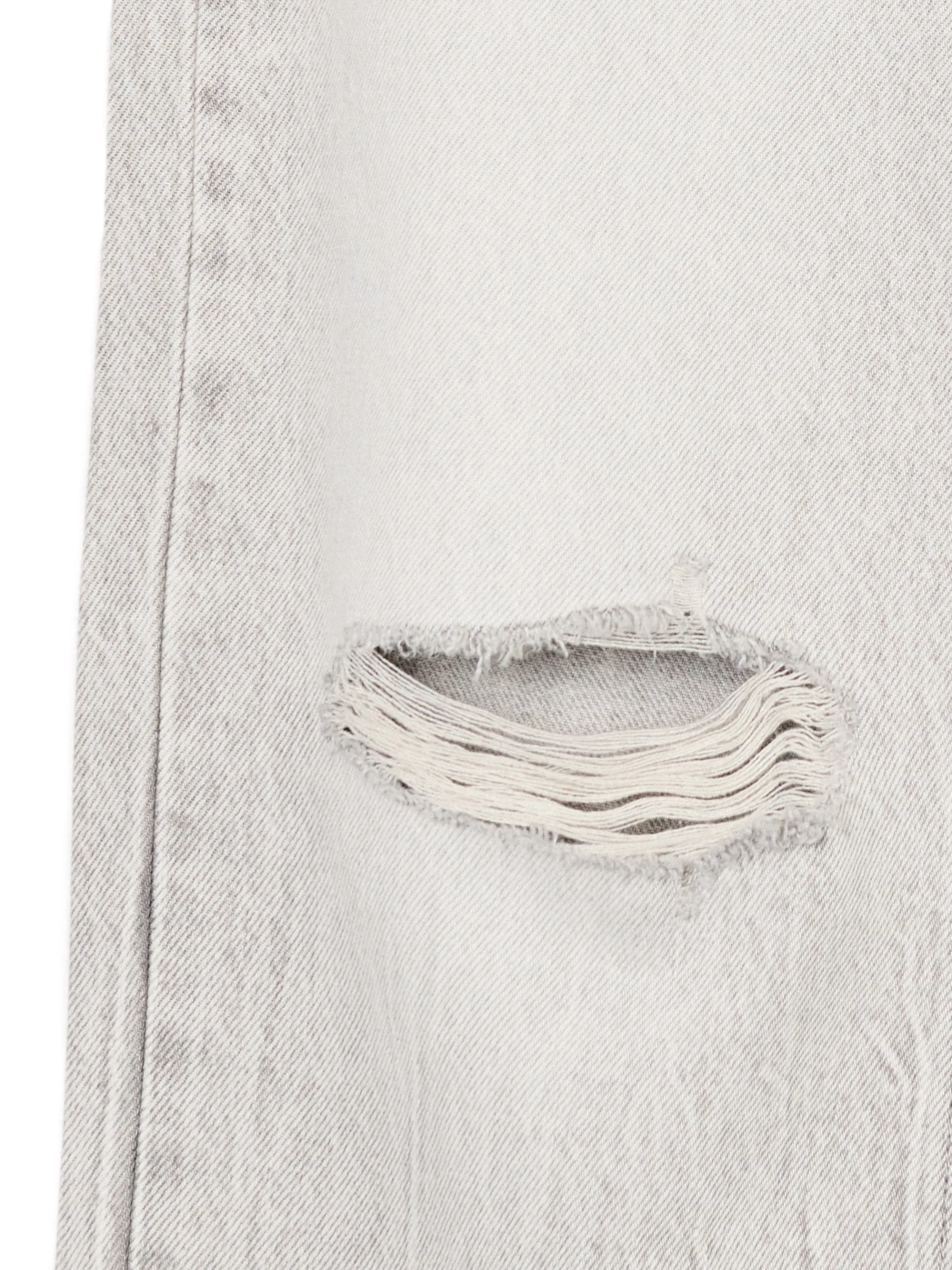 Szare damskie spodnie, uszyte z bawełnianej dzianiny. Casualowy item, który powinnien znaleźć się w każdej damskiej garderobie. 100% bawełny prosty krój zapięcie na zamek i guzik długie, proste nogawki pięć kieszeni ozdobne przetarcia i postrzępienia szlufki na pasek efekt sprania na całości