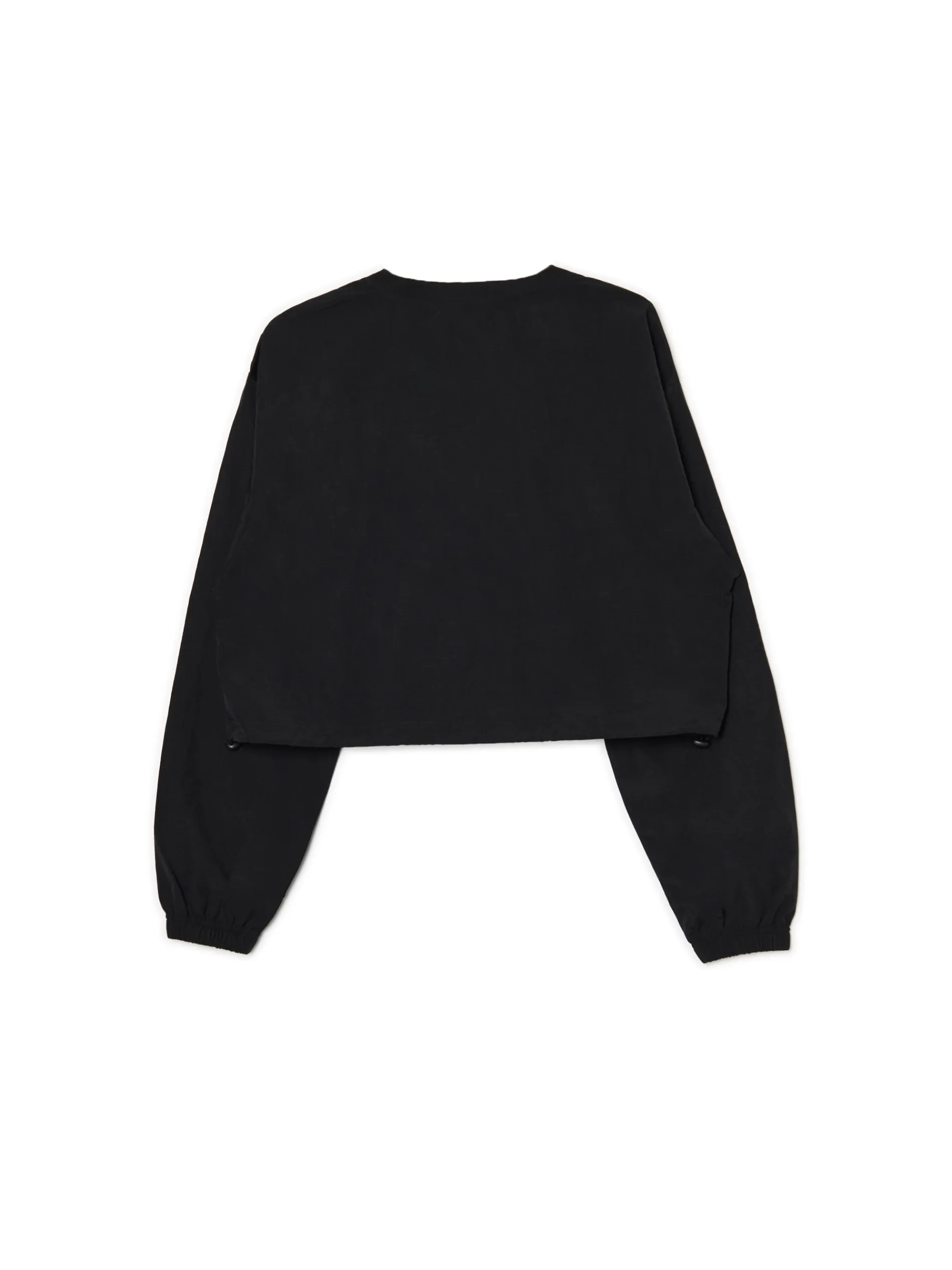 Luźna damska bluzka z długim rękawem, uszyta z trwałej tkaniny z napisem tekstowym na przodzie. W talii możliwość regulacji, która zapobiega unoszeniu się materiału. krój oversize okrągły dekolt z lamówką długie rękawy z gumką przy mankietach lekko obniżona linia ramion ściągacz tunelowy ze stoperami w talii nadruk z przodu