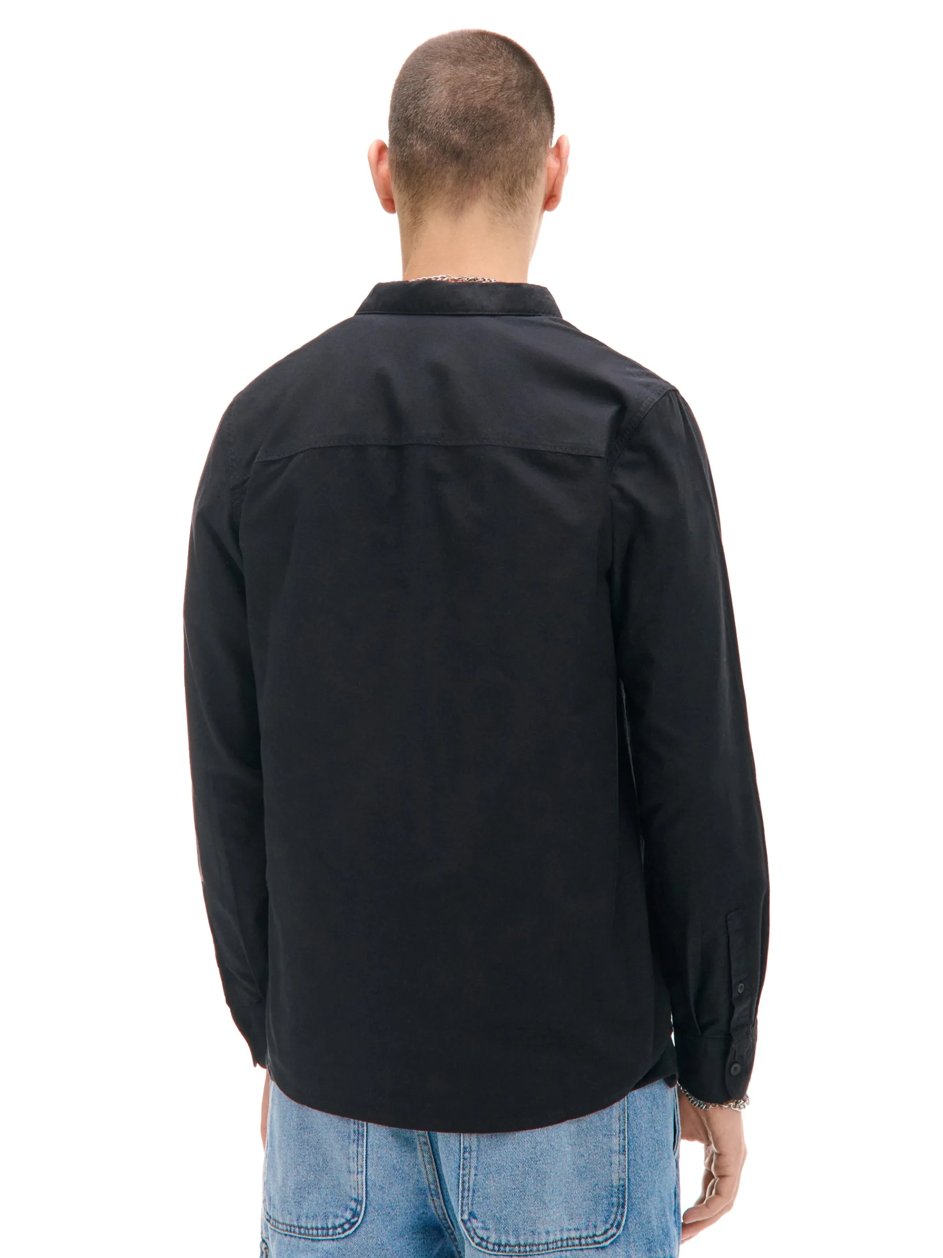 Męska czarna koszula, uszyta z wyjątkowej odmiany przewiewnej bawełny o pięknej teksturze. Idealna na specjalne okazje! wygodna i oddychająca bawełna typu chambray regularny krój zapięcie na guziki na całej długości klasyczny kołnierzyk długie rękawy zakończone mankietem z guzikami naszywana kieszeń na piersi