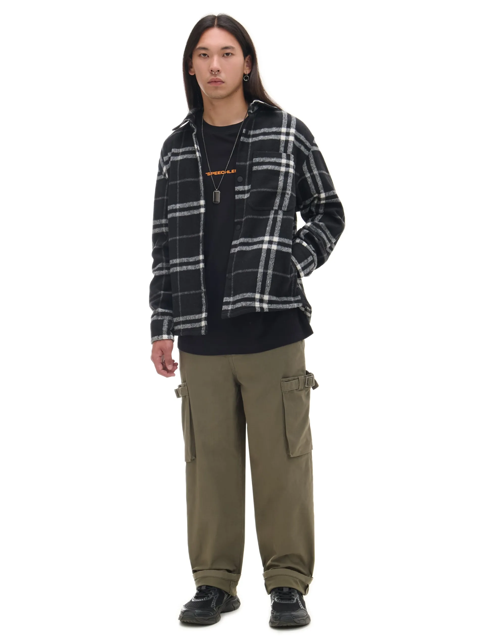 Solidna męska koszula uszyta z dzianiny zawierającej bawełnę, wiskozę oraz wełnę. Wyposażona w kieszeń na piersi i 2 kieszenie w szwach bocznych. Idealny item na casualowe lub bardziej okazjonalne wyjścia. uszyta z tkaniny w kratę miękkie i przyjemne w dotyku wykończenie krój oversize zapięcie na zatrzaski na całej długości kołnierz z otwartymi klapami długie rękawy z zatrzaskami przy mankietach kieszeń piersiowa praktyczne kieszenie wewnętrzne poręczny uchwyt na plecach mała naszywka z boku
