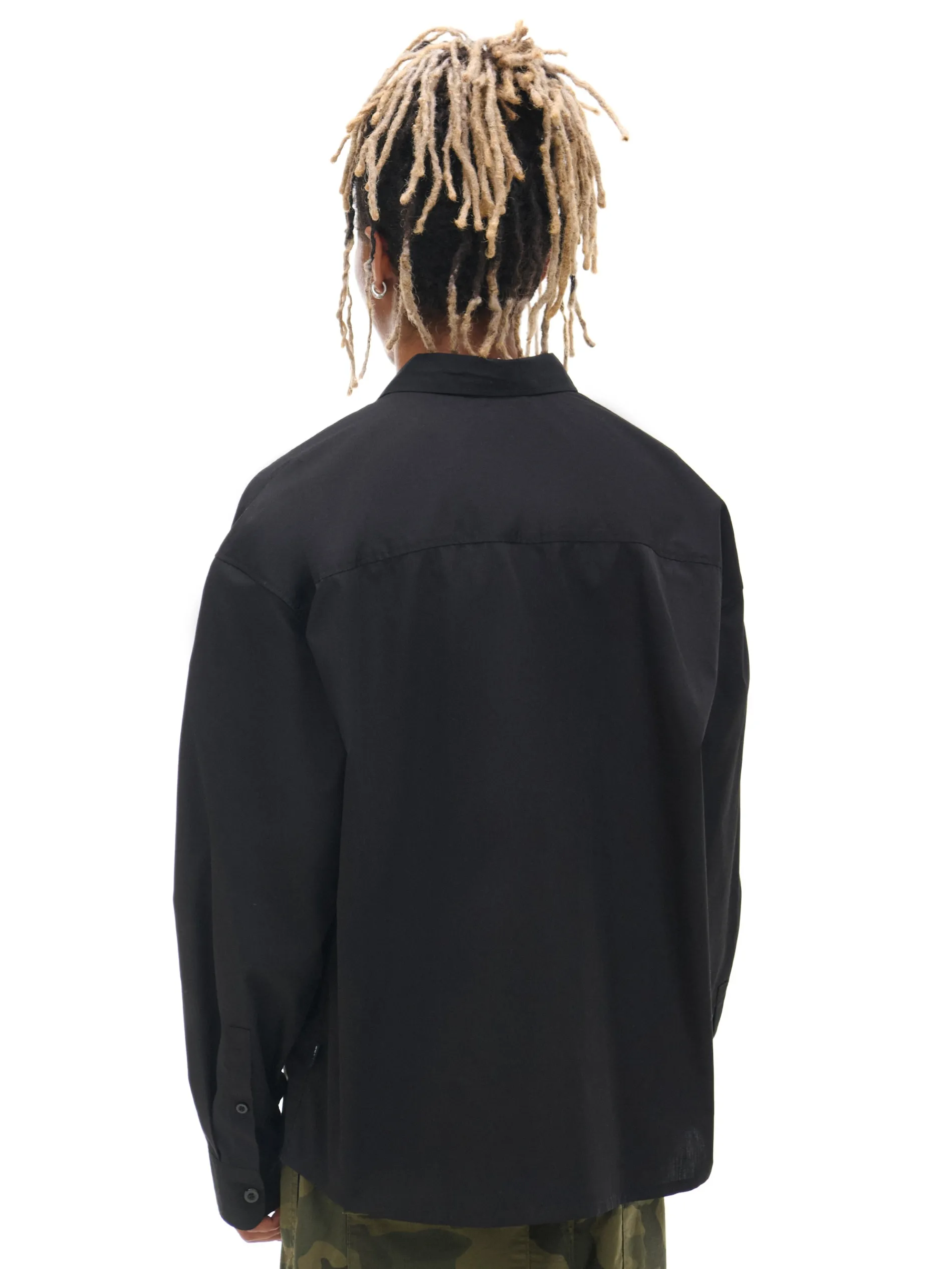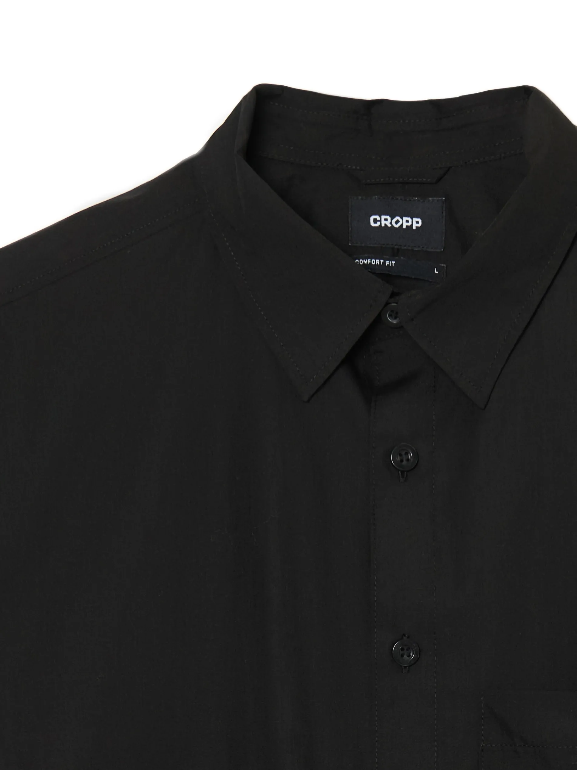 Czarna męska koszula o kroju comfort z kołnierzykiem, uszyta z miękko wykończonej popeliny. Delikatny haft na kieszonce sprawia, że koszula pasuje do casualowej, jak i bardziej eleganckiej stylizacji. dzianinowy materiał z bawełną swobodny krój jednorzędowe zapięcie na guziki klasyczny kołnierzyk długie rękawy zakończone mankietem z guzikami kieszeń piersiowa niewielki haft z przodu