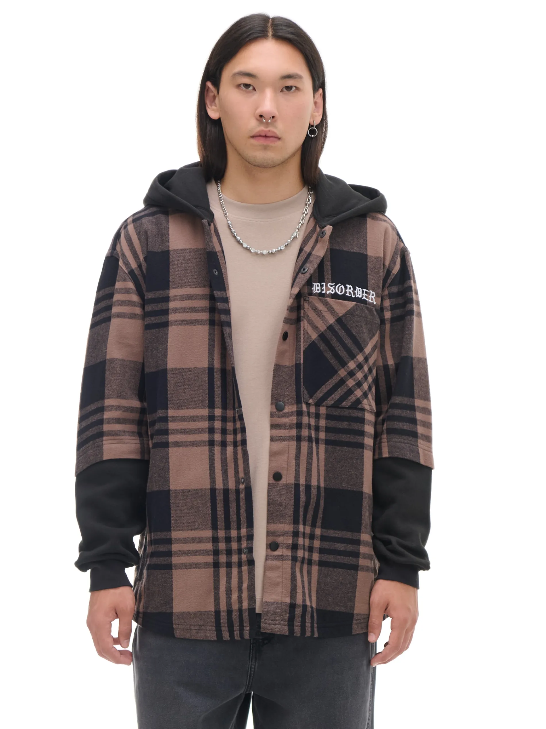 Męska koszula uszyta z grubszej tkaniny z rękawami i kapturem charakterystycznymi dla bluz typu hoodie. Look & vibe! uszyta z tkaniny z dodatkiem wiskozy swobodny, luźny krój praktyczne zapięcie na zatrzaski obszerny kaptur długie rękawy wykończone ściągaczami skośne kieszenie po bokach naszywana kieszeń na piersi ozdobne wstawki niewielki haft z przodu wzór w kratę