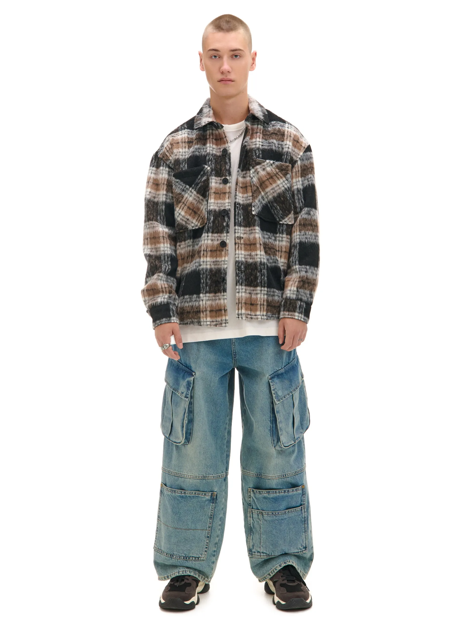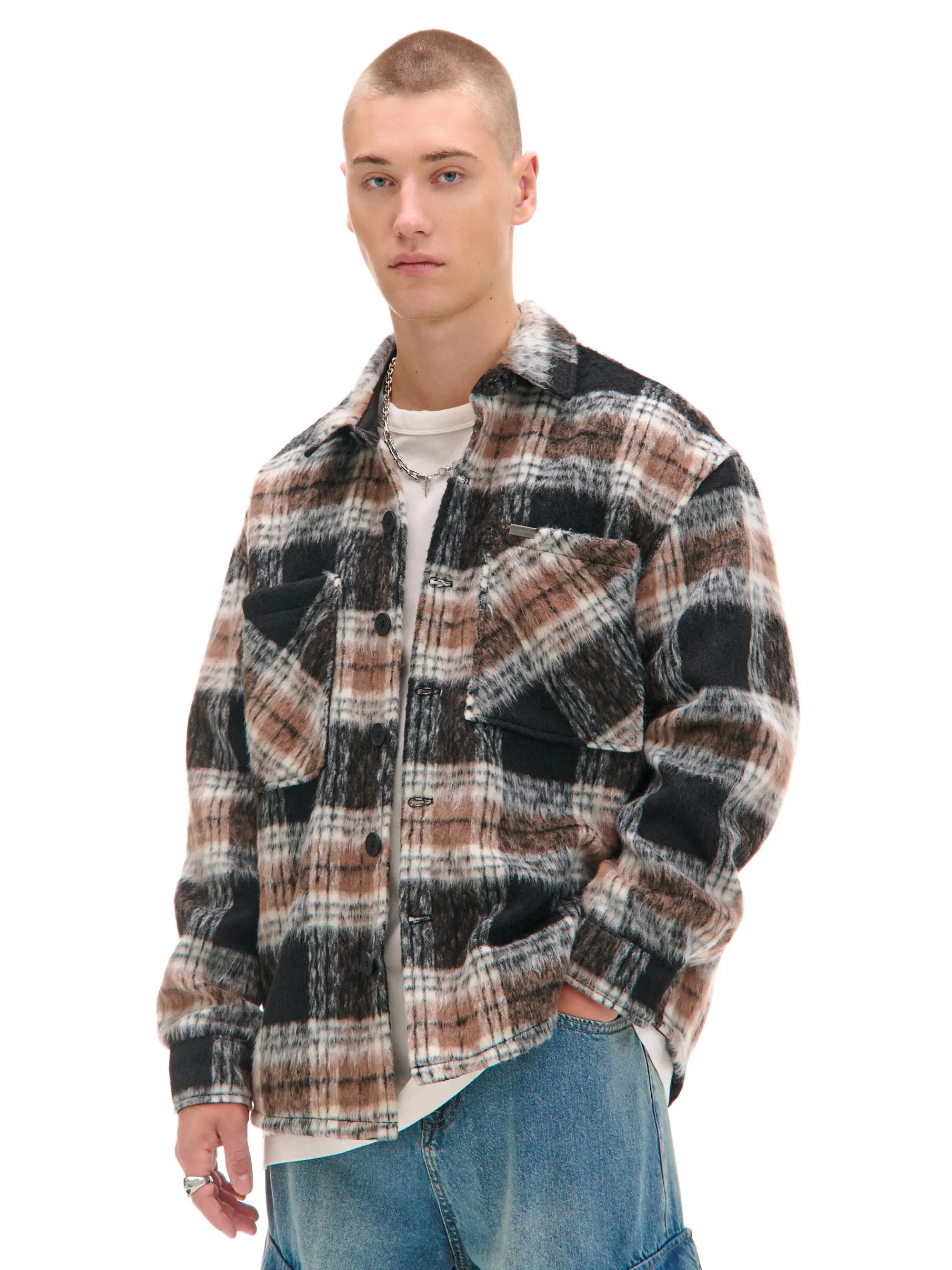 Jesienne stylizacje mode on! Męska koszula uszyta z solidnej tkaniny z efektem długiego włosa. Wygodne zapięcie na guziki i 4 praktyczne kieszenie zapewniają komfort. Ciepło gwarantuje podszewka i przyjemny w dotyku materiał. uszyta z solidnej tkaniny wygodny krój comfort zapięcie na guziki na całej długości klasyczny kołnierzyk długie rękawy zakończone mankietem z guzikiem dwie naszywane kieszenie piersiowe dwie kieszenie po bokach wzór w kratę na całej powierzchni Wzrost modela: 185 cm