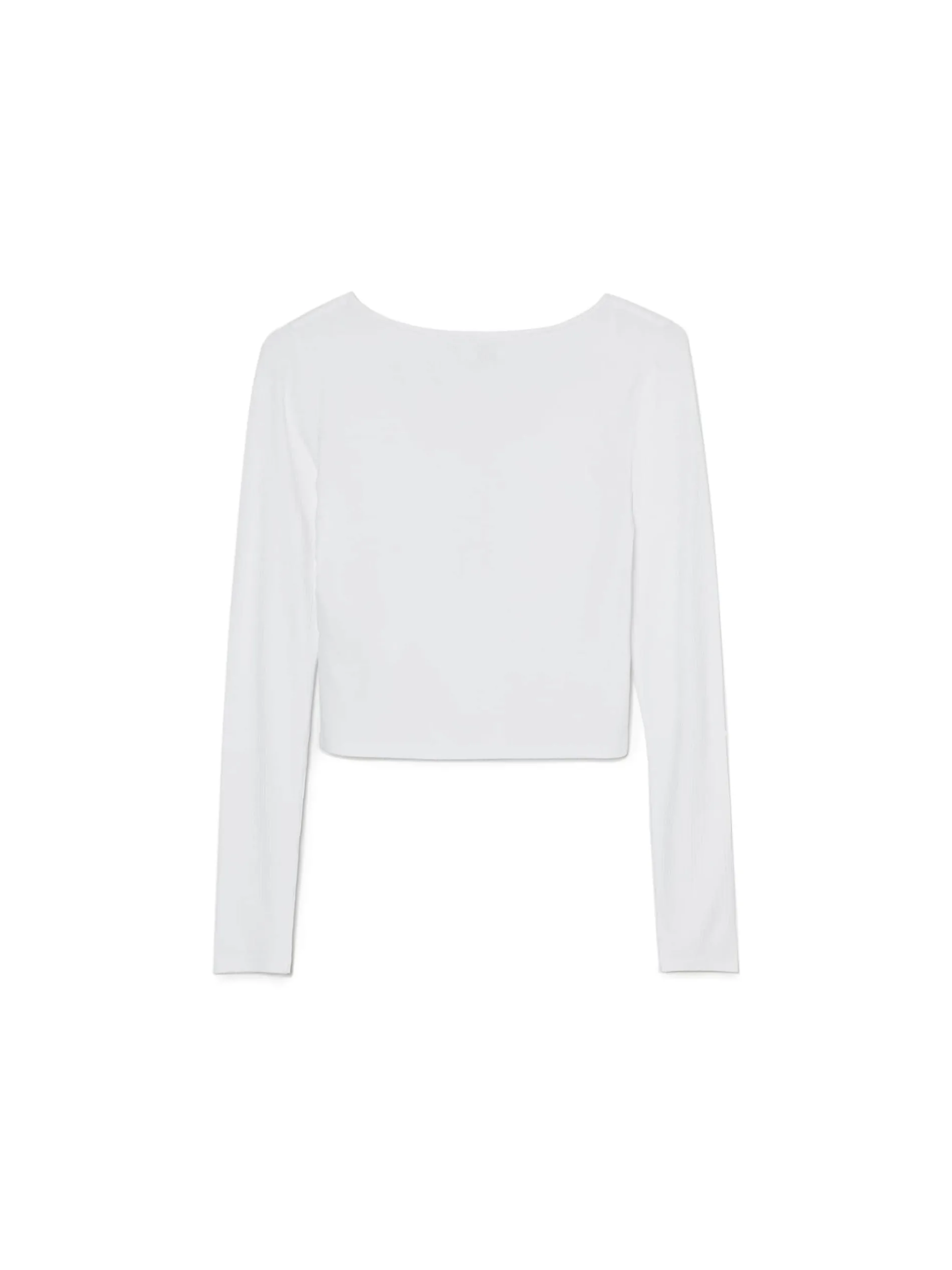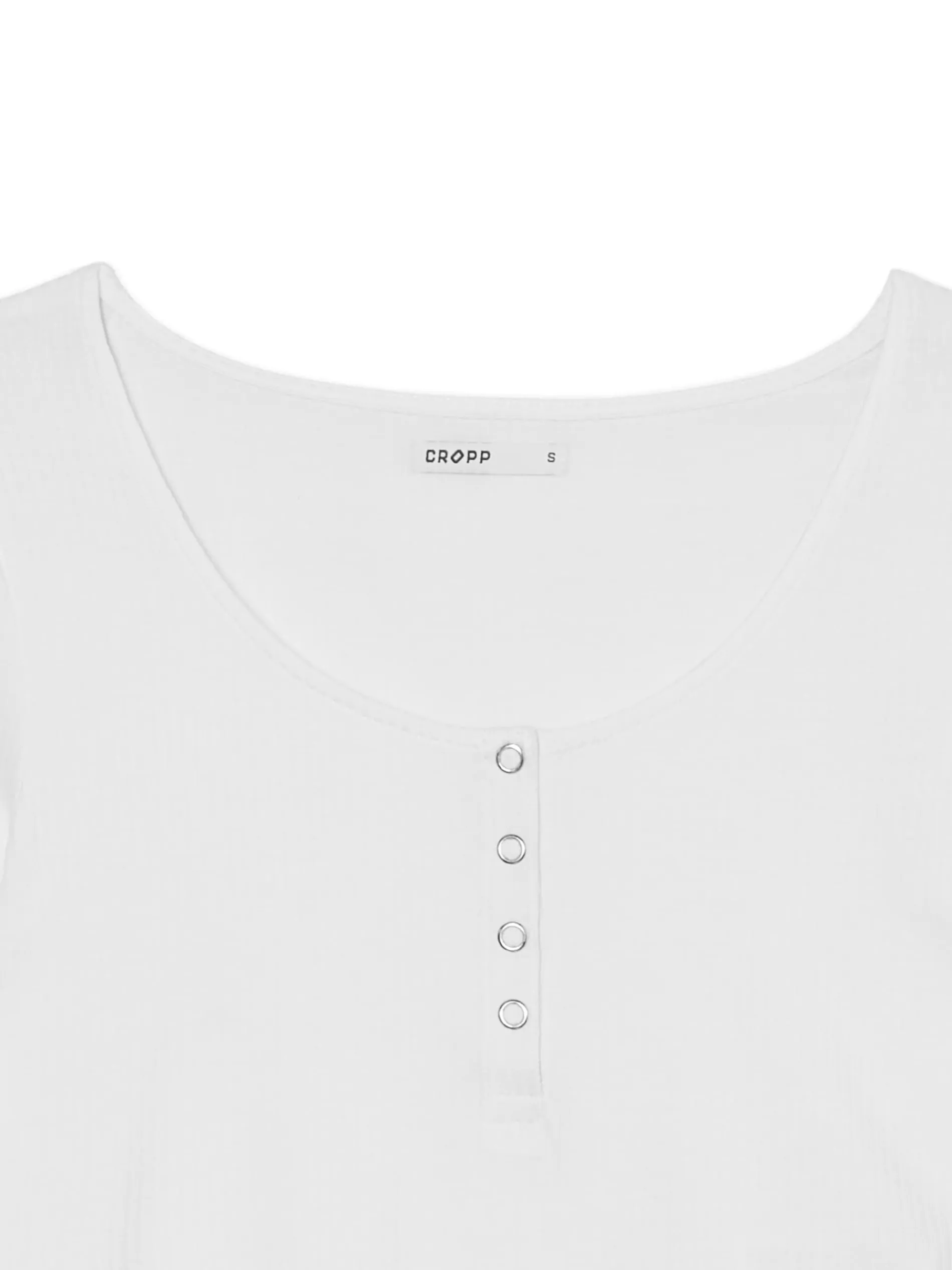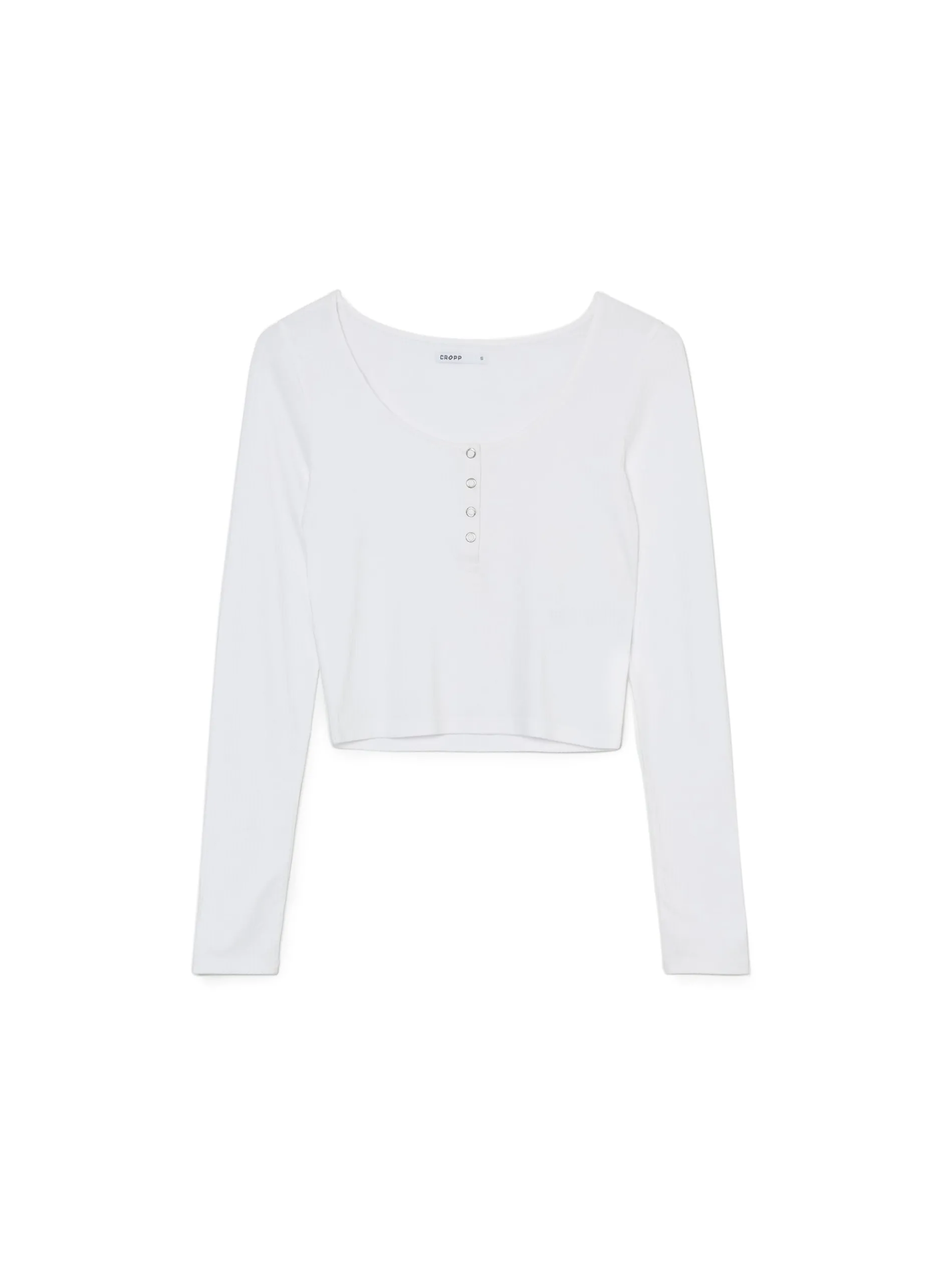 Damska biała bluzka, uszyta z mieszanki wiskozy i elastanu. Dobierz do niej oryginalne dodatki! dopasowany krój podkreślający sylwetkę długie, dopasowane rękawy góra zapinana na okrągłe zatrzaski okrągły dekolt z lamówką ciekawa, prążkowana faktura