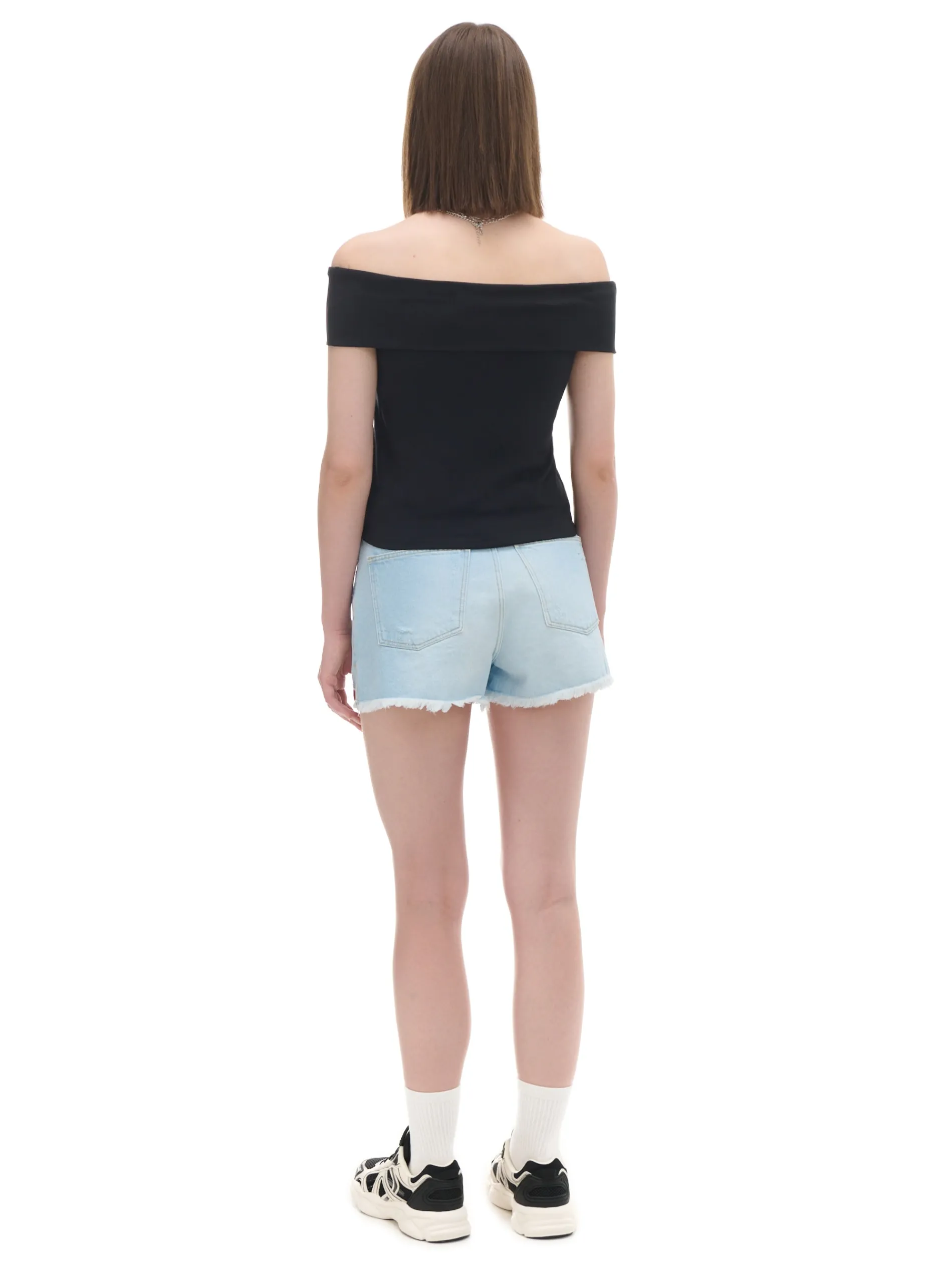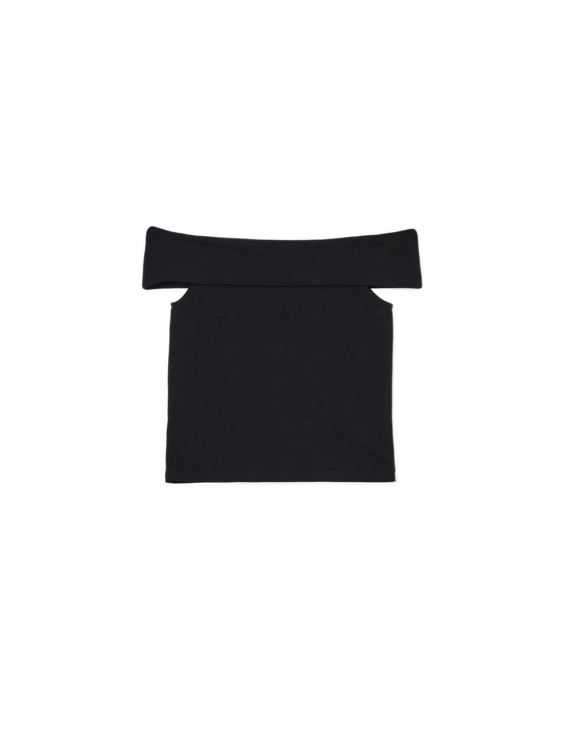 Damska bluzka, uszyta z czarnego materiału o bardzo wysokiej zawartości bawełny. Dodatek elastycznych włókien gwarantuje idealne dopasowanie i wygodę! dopasowany krój podkreślający sylwetkę odsłaniający ramiona dekolt typu carmen krótkie rękawki, powstające dzięki zawinięciu dekoltu