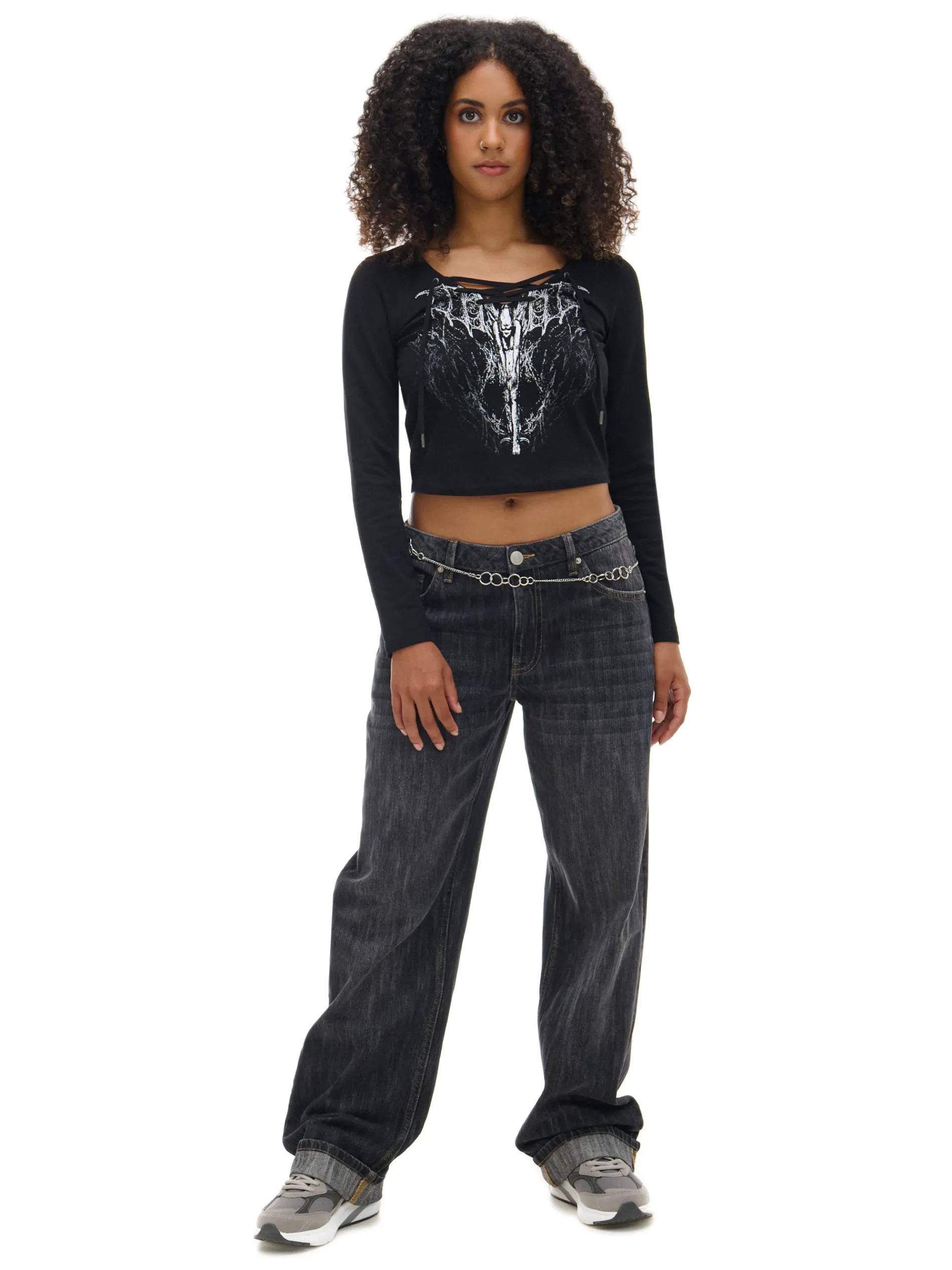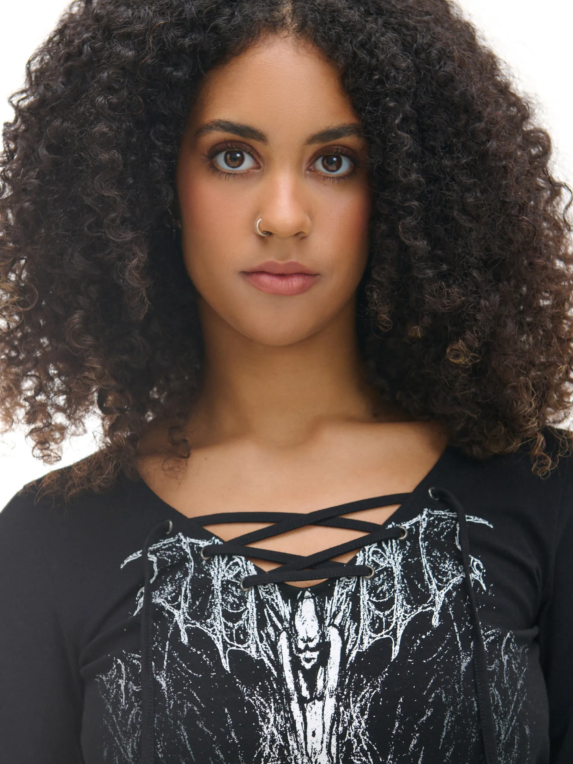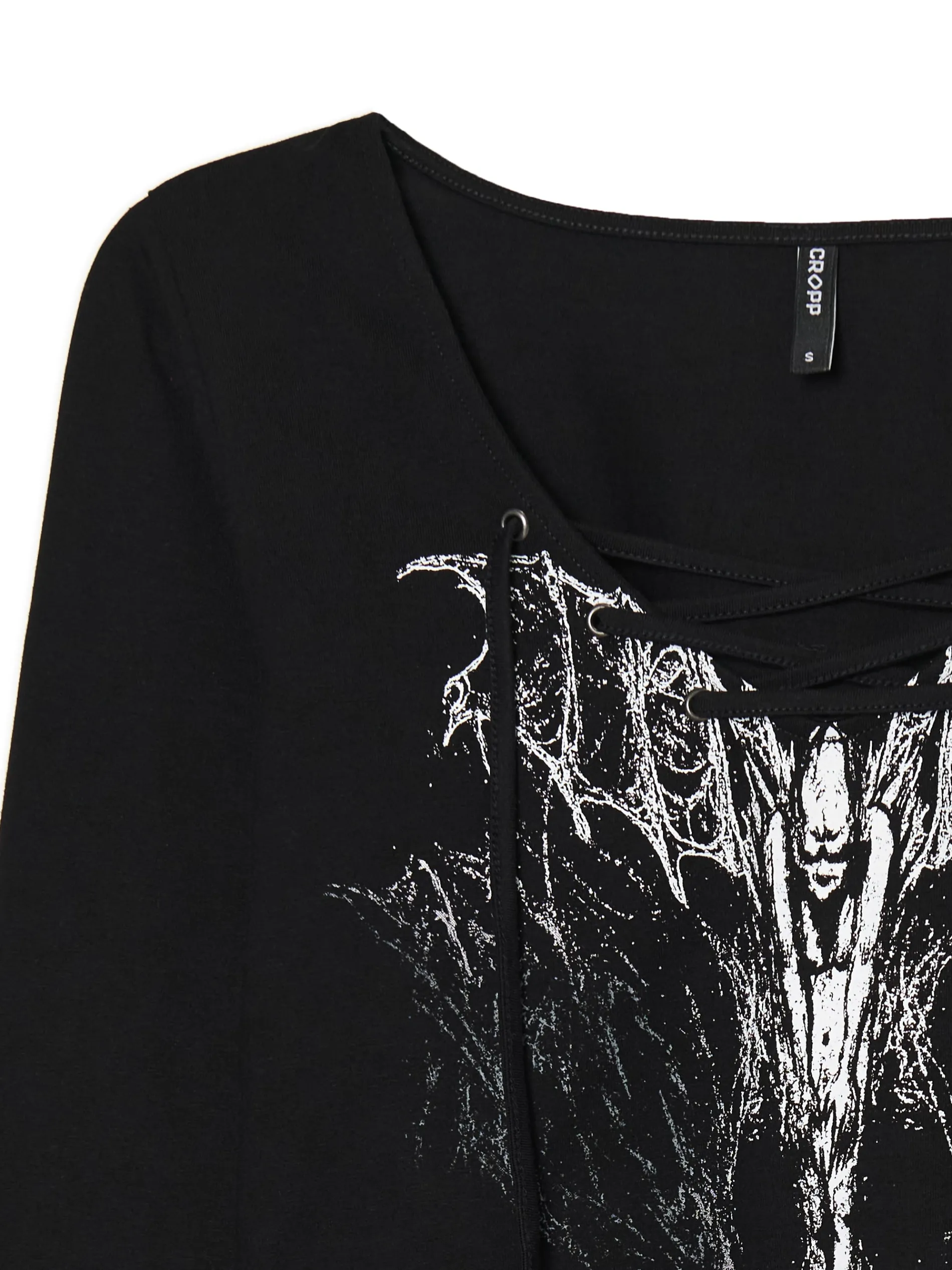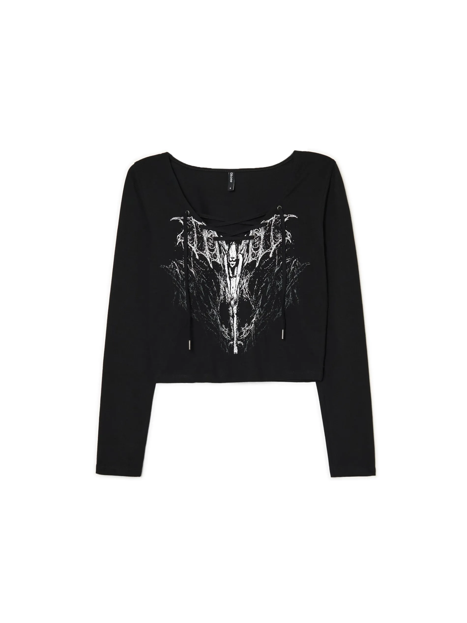 Mamy dla Ciebie idealną bluzkę na halloweenowy biforek. Uszyta z mieszanki dzianin o wysokiej zawartości bawełny. Dopasowany, krótszy krój fituje z dekoracyjnym sznurowaniem i oryginalnym pintem. bawełna z dodatkiem elastycznych włókien dopasowany krój podkreślający sylwetkę krótki fason długie, dopasowane rękawy okrągły dekolt ozdobne sznurowanie nadruk z motywem Halloween