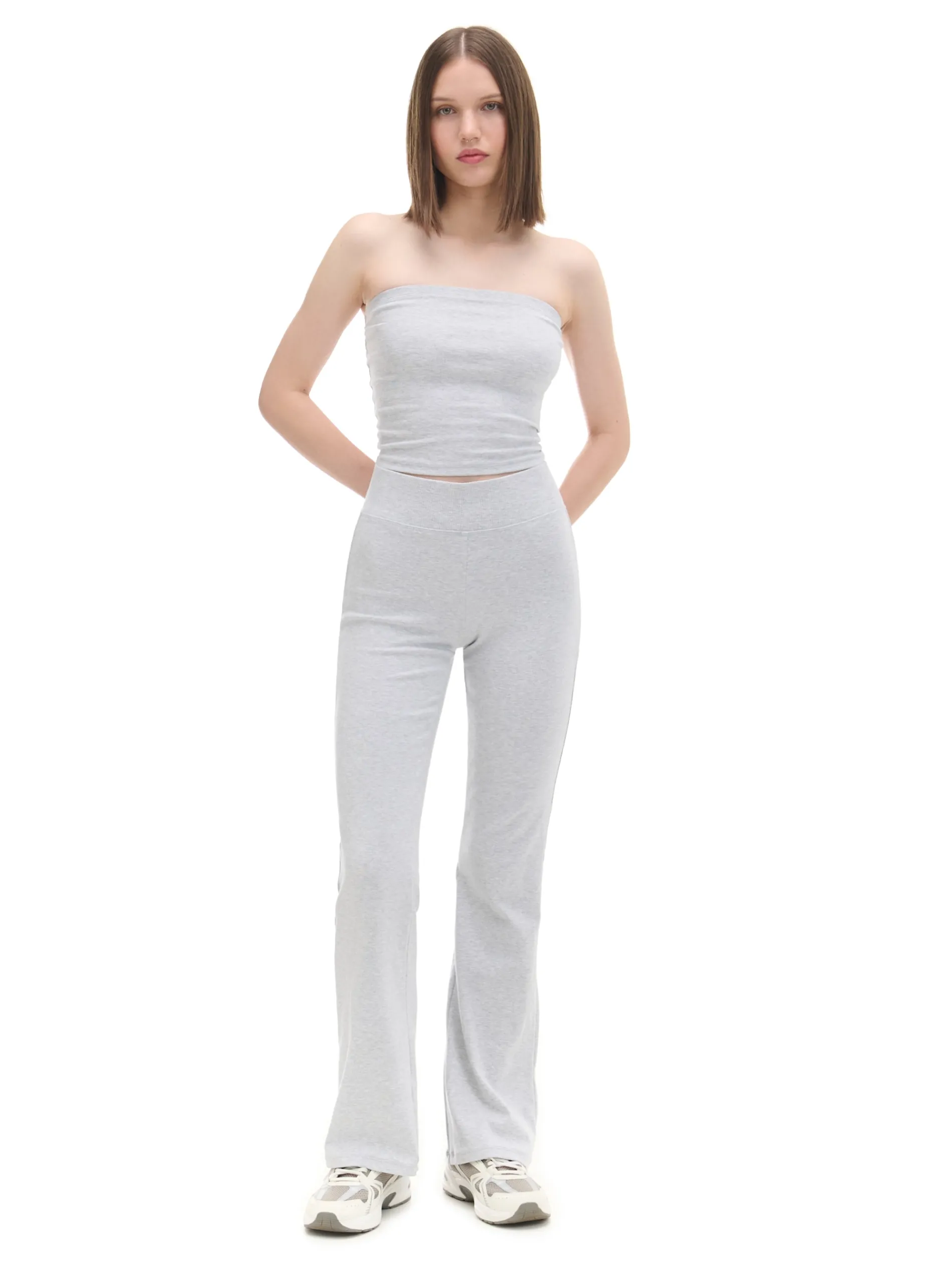 Dopasowany top typu tuba, uszyty z dzianiny z dodatkiem elastycznych włókien w jasnoszarym odcieniu. Unikatowy dodatek zarówno do dresu, jak i jeansu. Sprawdź! dzianinowy materiał z bawełną dopasowany krój podkreślający sylwetkę silikonowa taśma przy dekolcie Wzrost modelki: 172 cm
