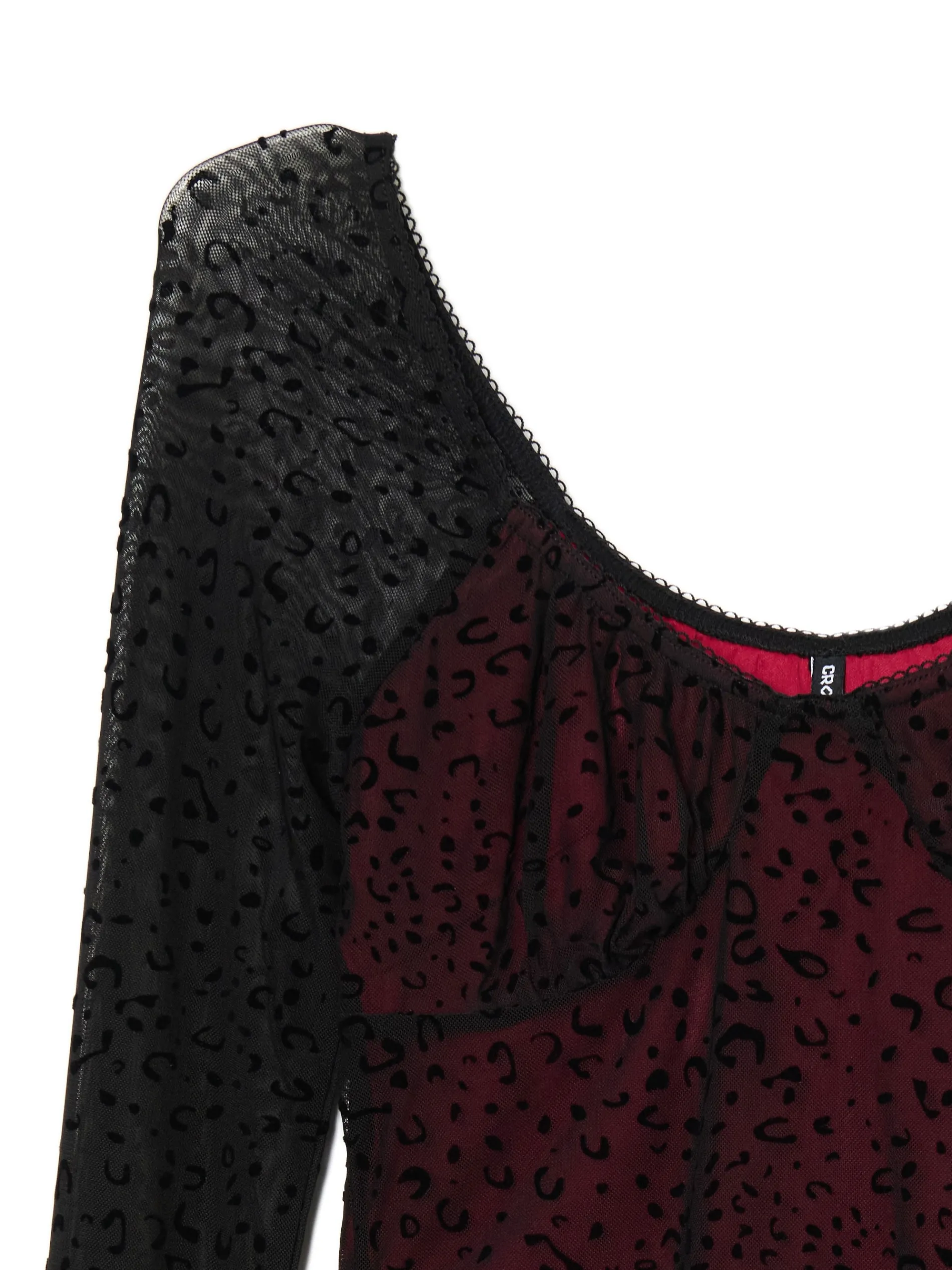 Damska bluzka uszyta z półprzezroczystej dzianiny z dodatkiem elastycznych włókien. Dzięki temu item idealnie dopasowuje się do sylwetki. Ozdobą są dekoracyjne wypustki, nadruk all over i kontrastowa podszewka w czerwonym kolorze. dzianina z dodatkiem elastycznych włókien regularny krój kontrastowa, czerwona podszewka głęboki, okrągły dekolt długie, dopasowane rękawy wykończenie drobną falbanką i dekoracyjnymi wypustkami nadruk all over