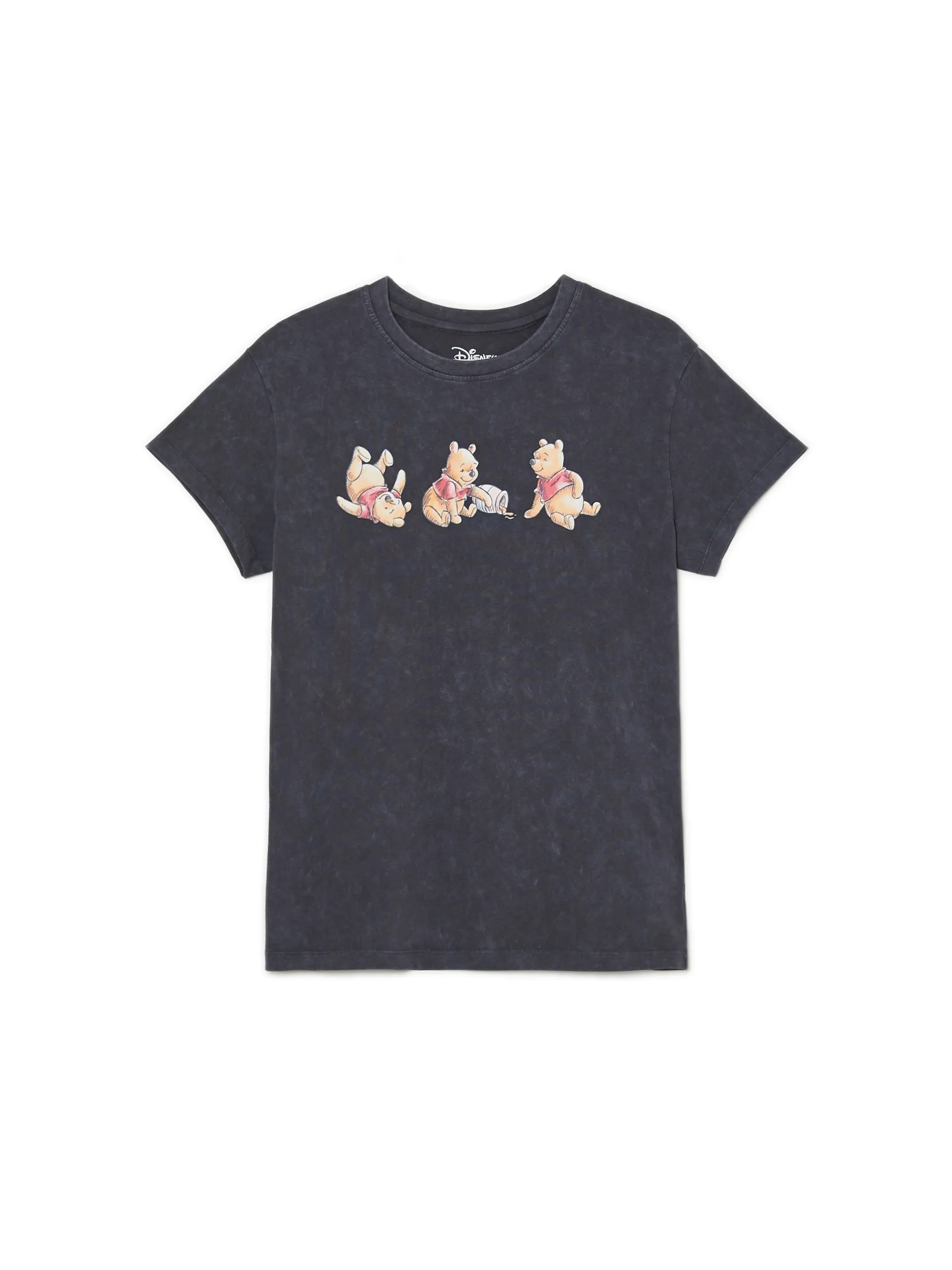 Ciemnoszara koszulka damska o kroju oversize, z obniżoną linią ramion. Uszyta z bawełny. Z przodu nadruk z Kubusiem Puchatkiem, na całości efekt acid wash. ©Disney