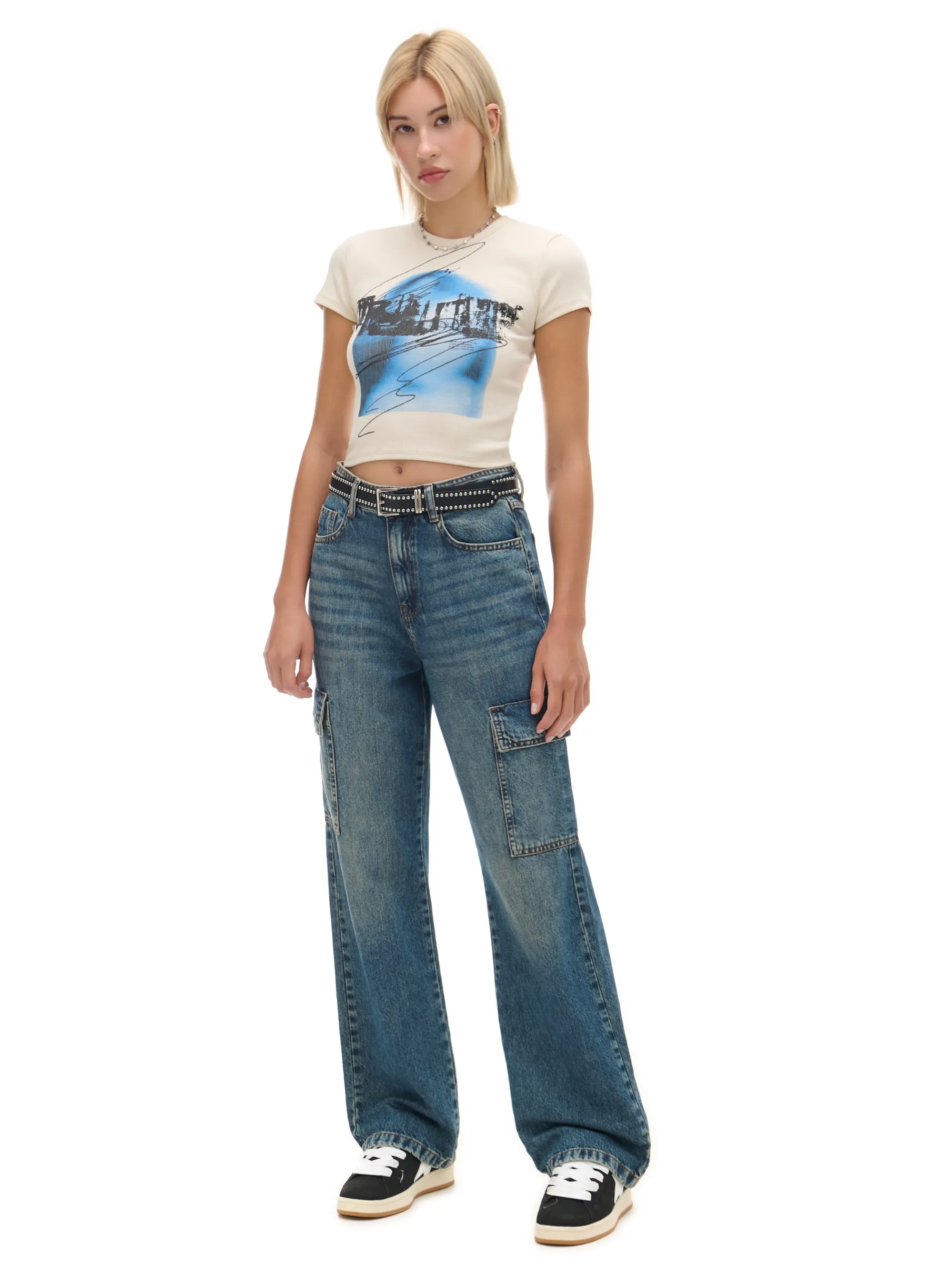 Damska koszulka o krótszym kroju, uszyta z bawełny z domieszką elastycznych włókien. Na przodzie autorski nadruk z motywem muzycznym. elastyczna, prążkowana dzianina krótki, dopasowany krój półokrągły dekolt wykończony ściągaczem krótkie, ścięte rękawy oryginalny print Wzrost modelki: 177 cm
