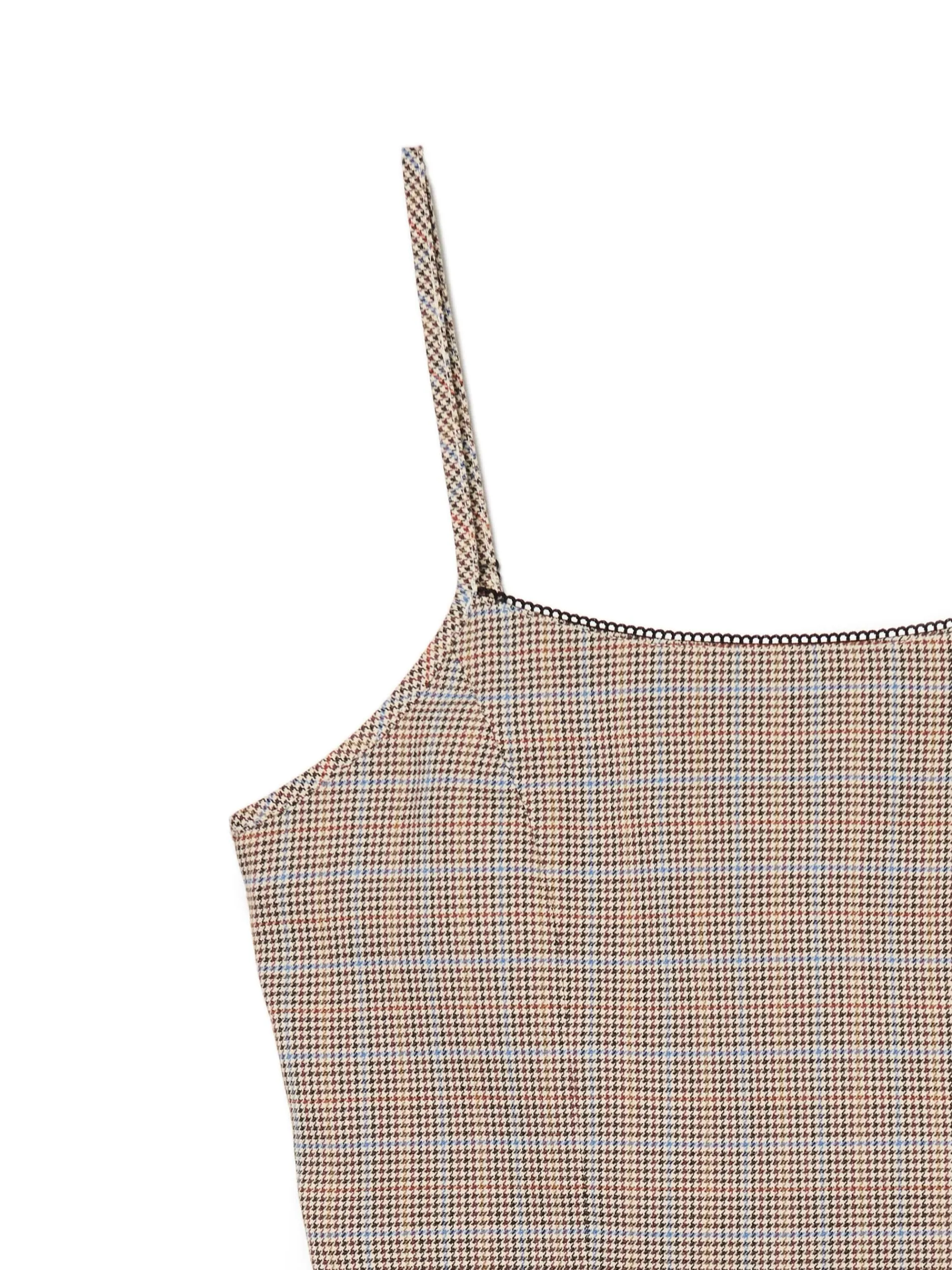 Krótki top damski o dopasowanym kroju, uszyty z grubej, mocnej tkaniny typu twill. ze wzorem w kratę. Dekoracyjne wykończenie przy dekolcie i wiązanie na plecach zwracają na siebie uwagę. dopasowany krój zapięcie na kryty zamek z boku kwadratowy dekolt z przodu i z tyłu wąskie ramiączka z regulacją długości ozdobne wiązanie na plecach dekoracyjne wykończenie brzegów wzór w drobną kratę na całości Tworzy zestaw z modelem 388AR-88M .