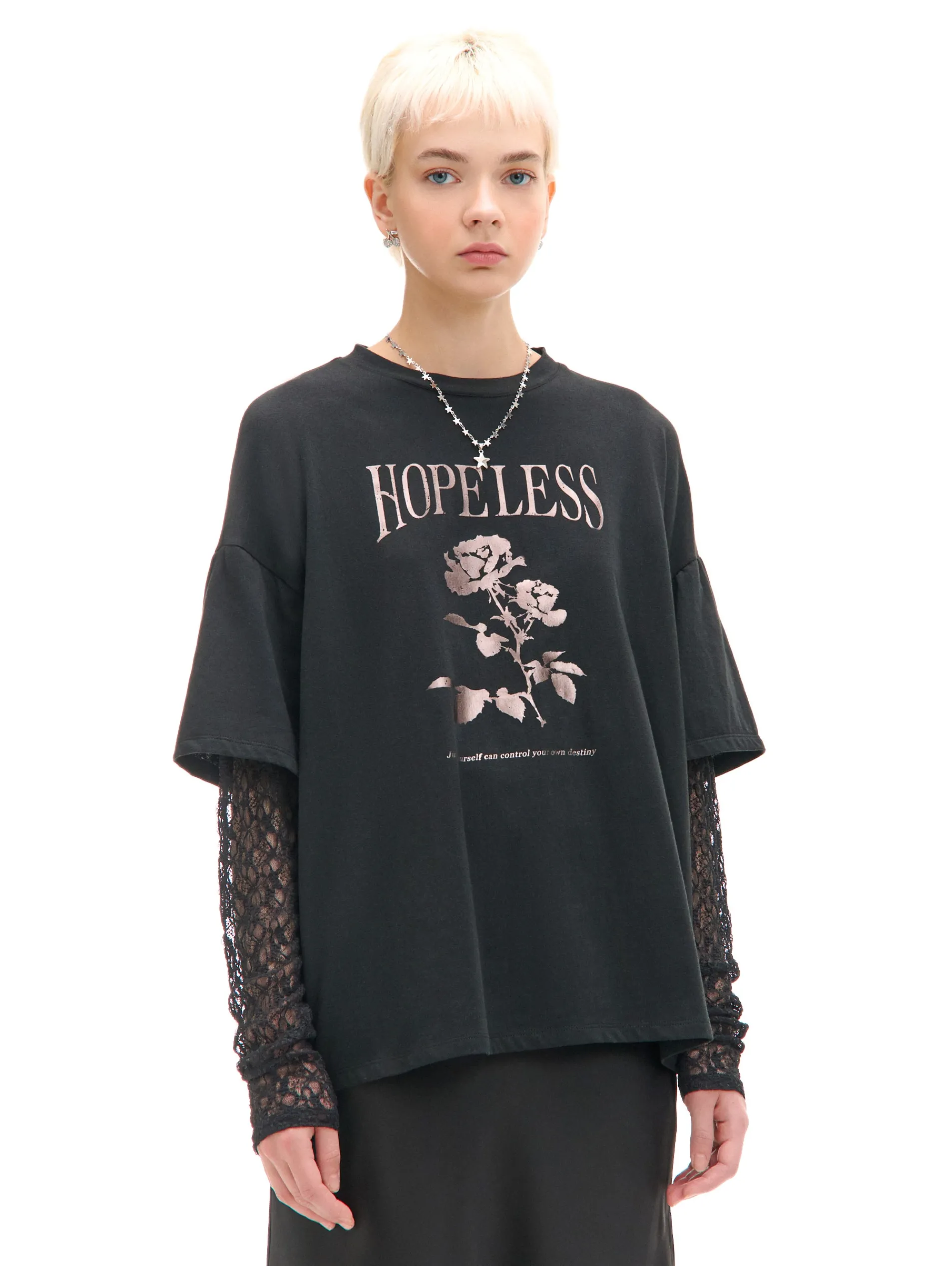 Damska koszulka z ażurowymi, długimi rękawami zakończonymi elastyczną gumką zapobiegającą unoszeniu się materiału. Na przodzie print z roślinnym motywem i nadruki tekstowe. Klasyczny look w nowoczesnym designie, sprawdź! 100% bawełny krój oversize okrągły dekolt z lamówką lekko obniżona linia ramion elastyczne gumy przy mankietach duży nadruk z przodu
