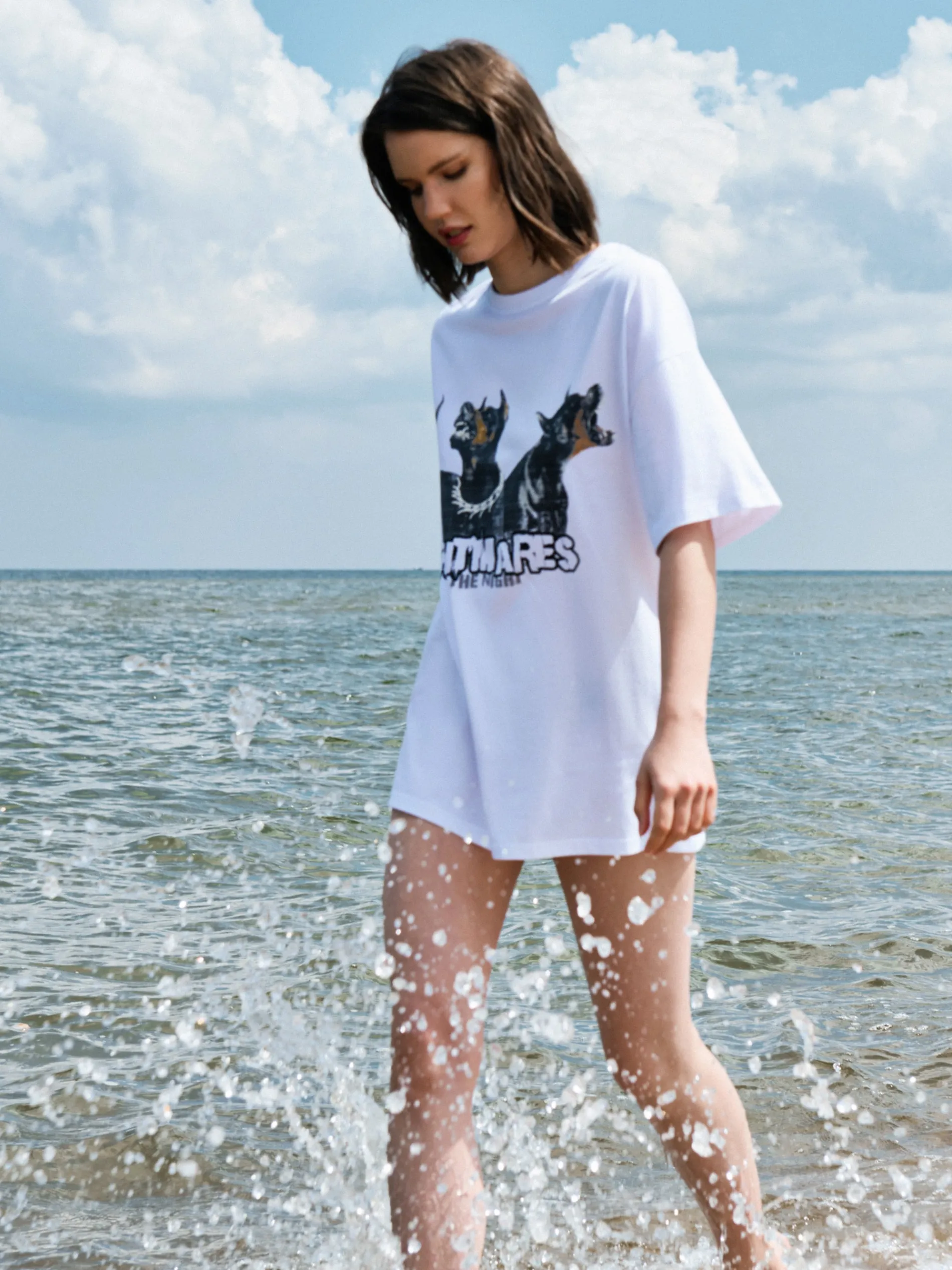 Damski T-shirt z krótkim rękawem, uszyty z bawełny w kolorze białym z oryginalnym printem na przodzie. 100% bawełny krój oversize krótkie, szerokie rękawy nadruk z motywem psów rasy doberman Ten produkt należy do kolekcji UNISEX – zalecamy wybranie mniejszego rozmiaru niż zazwyczaj, jeśli chcesz uniknąć efektu oversize.