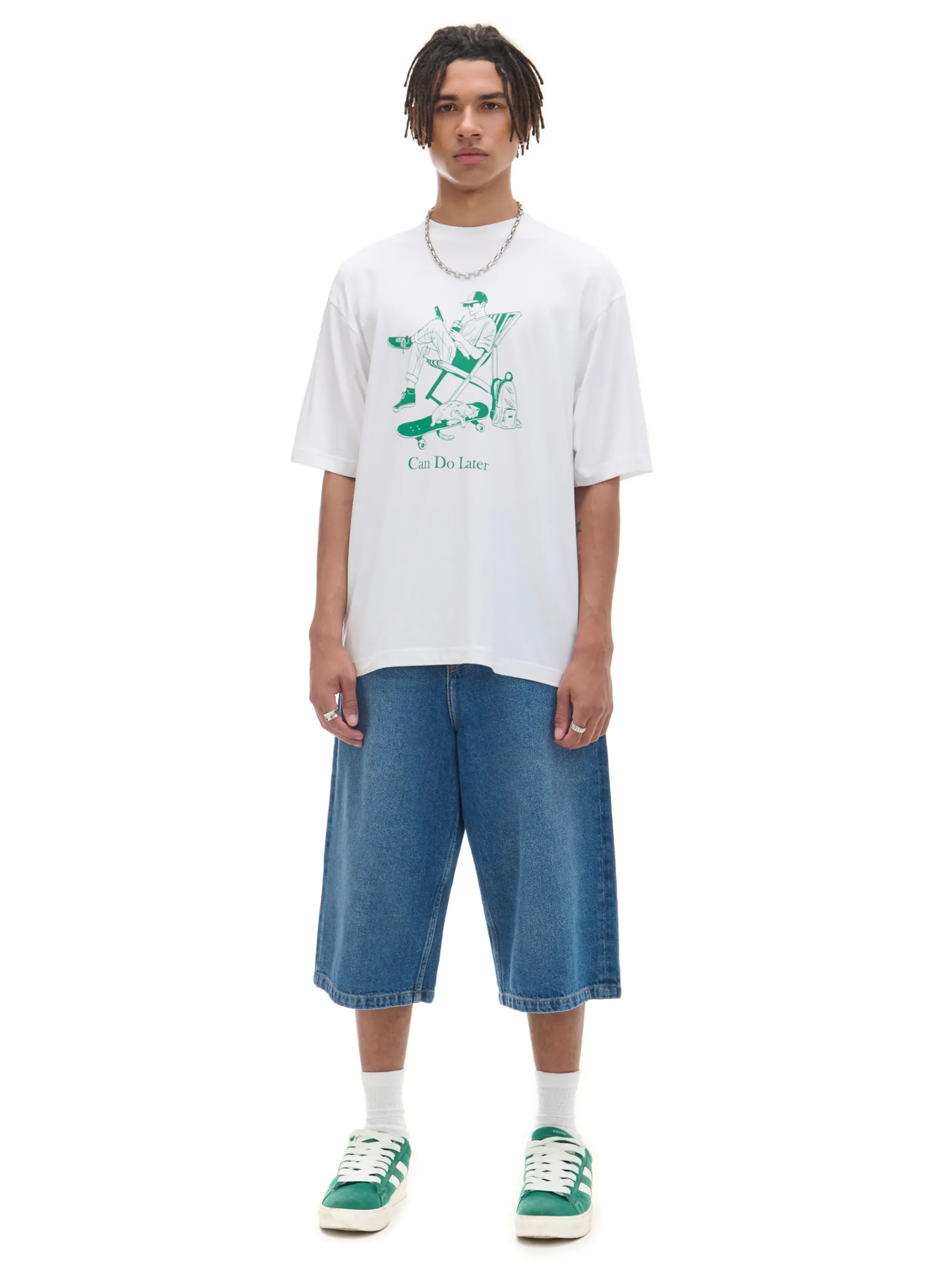 Męska koszulka o kroju comfort, uszyta z mieszanki tkanin w kolorze białym. Artystyczny nadruk zgodnie z zasadą co masz zrobić dziś, zrób pojutrze a zyskasz dwa dni wolnego! uszyta z bawełny z dodatkiem modalu i elastycznych włókien wygodny krój comfort krótkie, szerokie rękawy delikatnie obniżona linia ramion duży nadruk z przodu