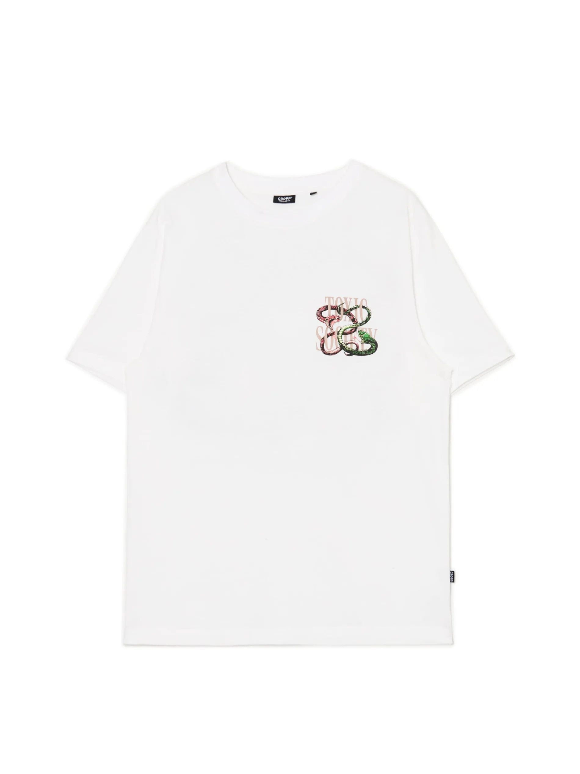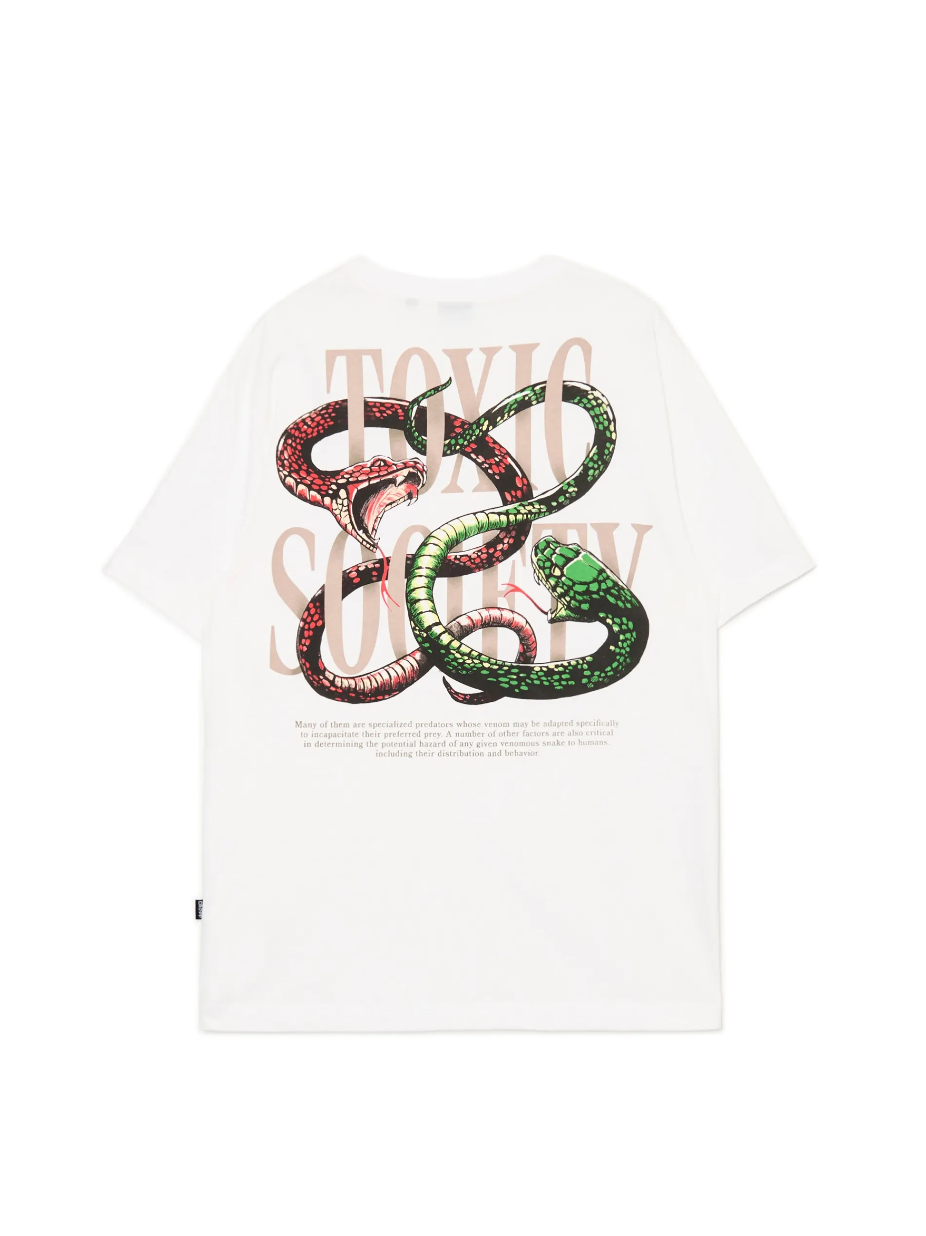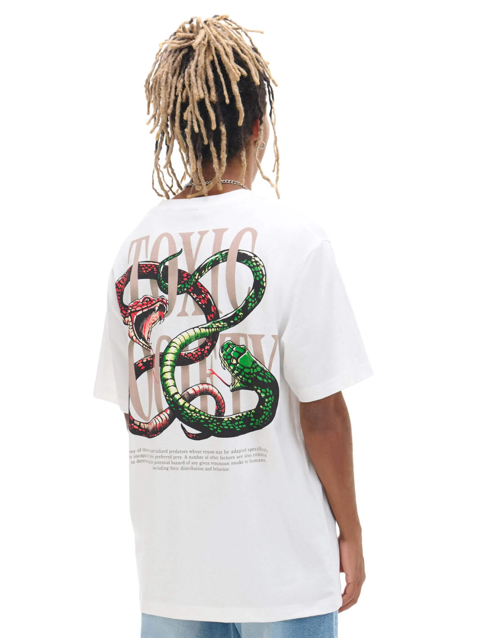 Biała męska koszulka z krótkim rękawem, uszyta z bawełnianej dzianiny. Wyróżnia ja mały nadruk na piersi i duży na plecach z motywem węży. 100% bawełny regularny krój krótkie, swobodne rękawy mały nadruk na piersi, duży nadruk na plecach