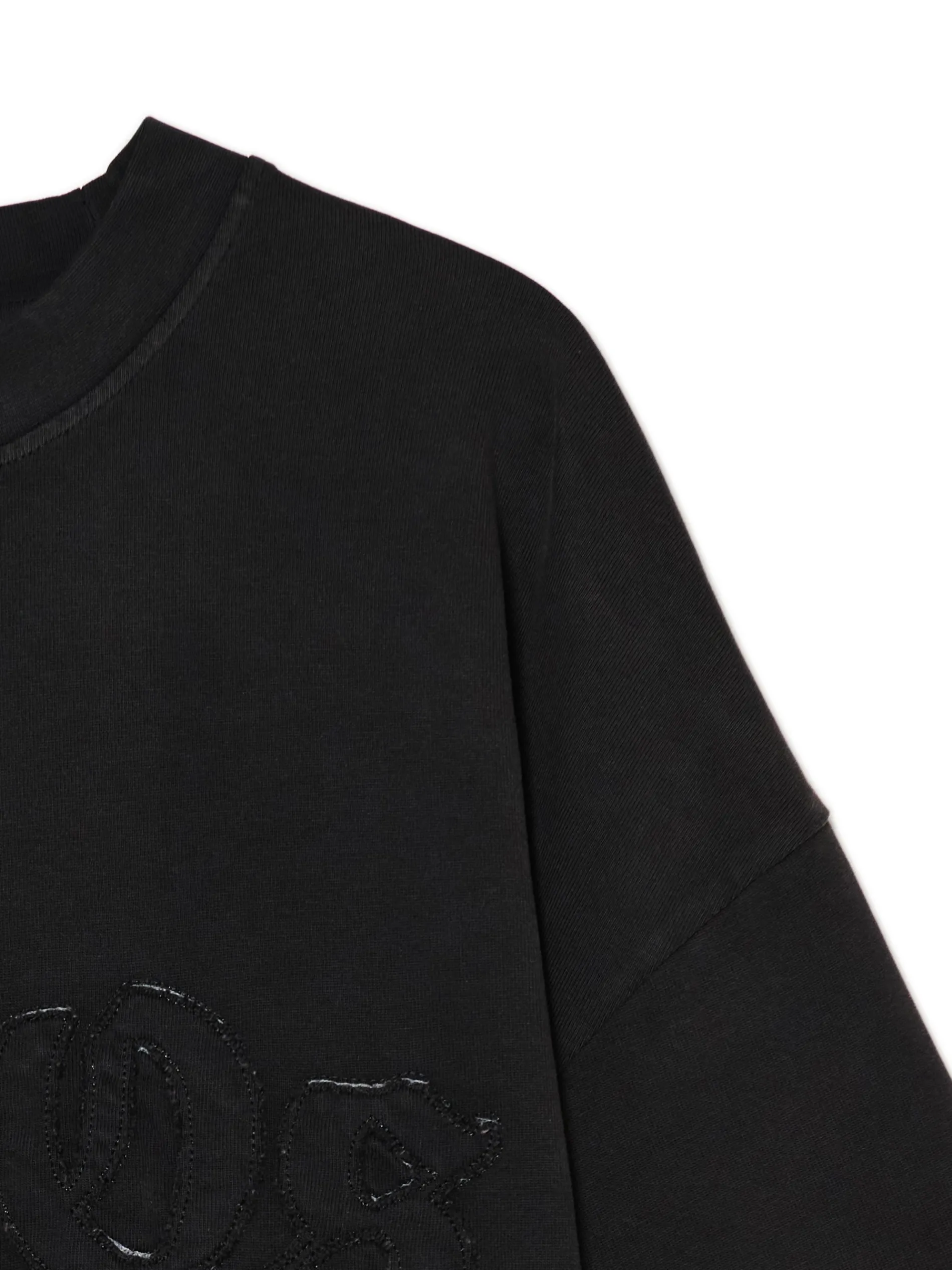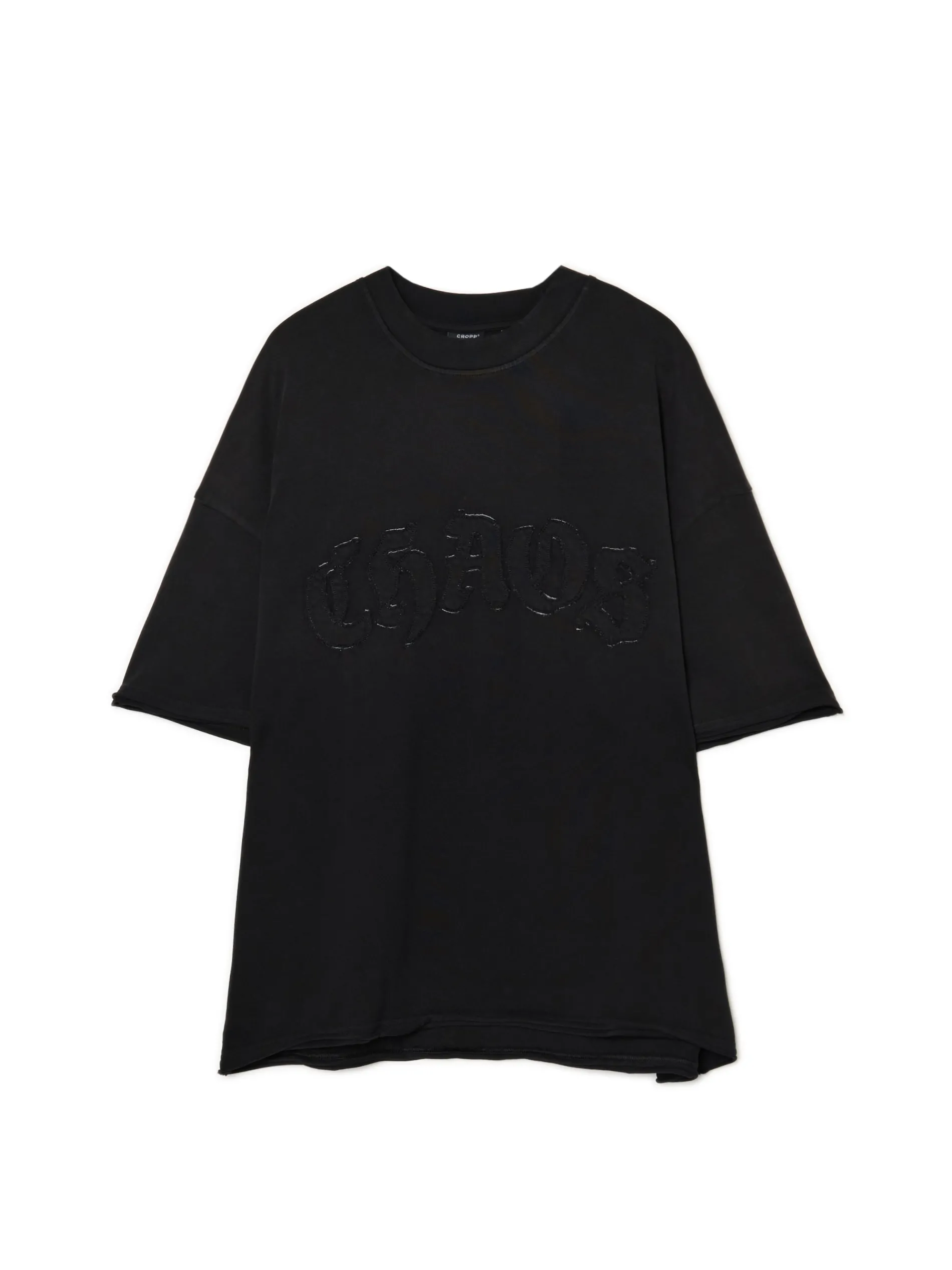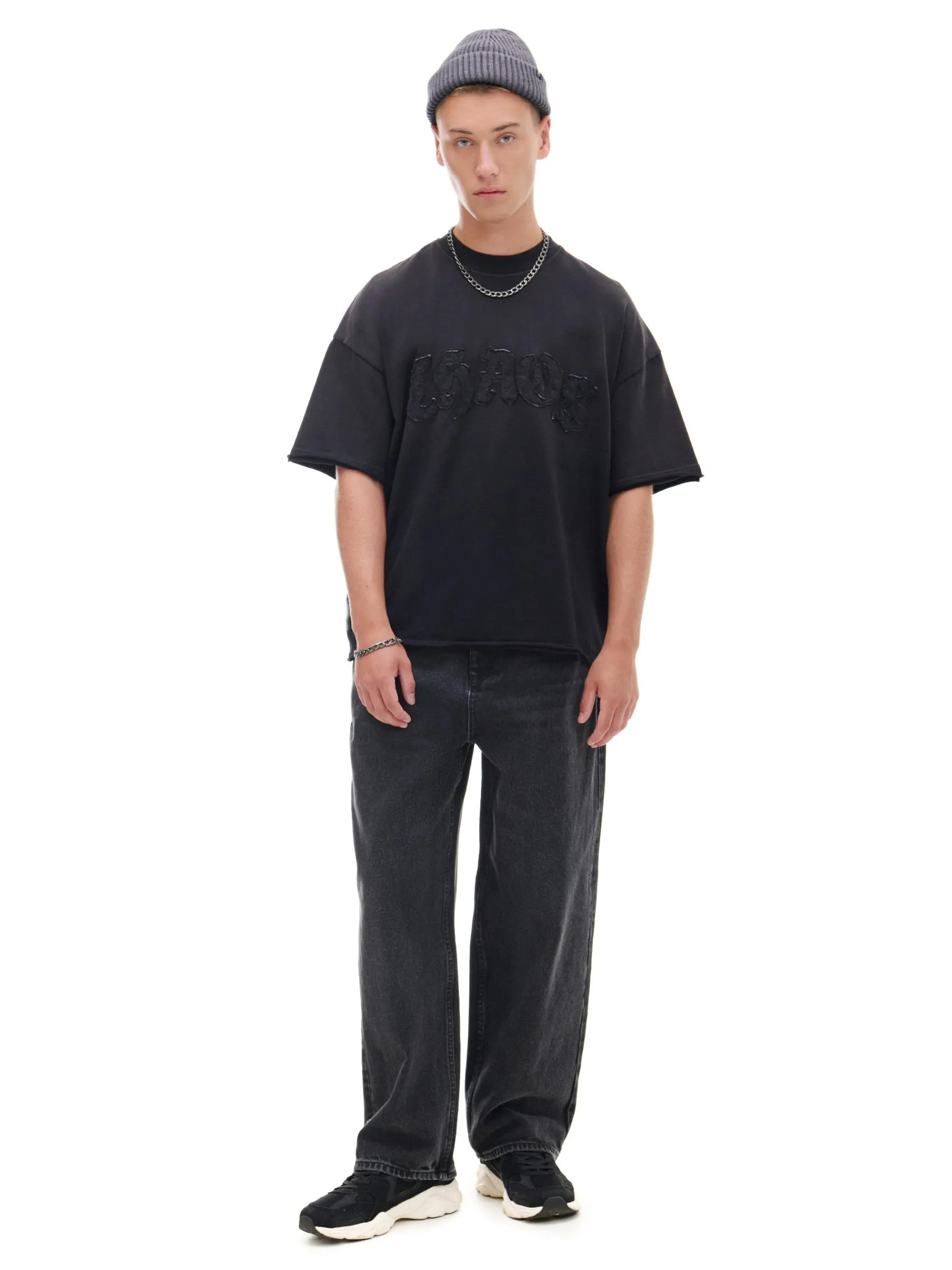 Męski T-shirt o kroju boxy, uszyty z bawełny. Ozdobą tego modelu jest haftowany napis 'chaos’. 100% bawełny obszerny krój boxy rękawy z podwiniętą linią brzegów delikatnie obniżona linia ramion ozdobnie wykończony dół na środku dekoracyjny haft Wzrost modela: 185 cm