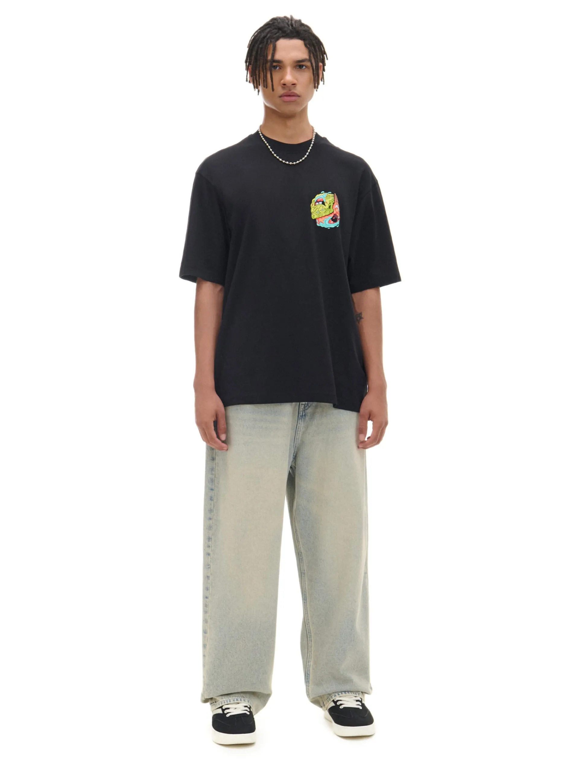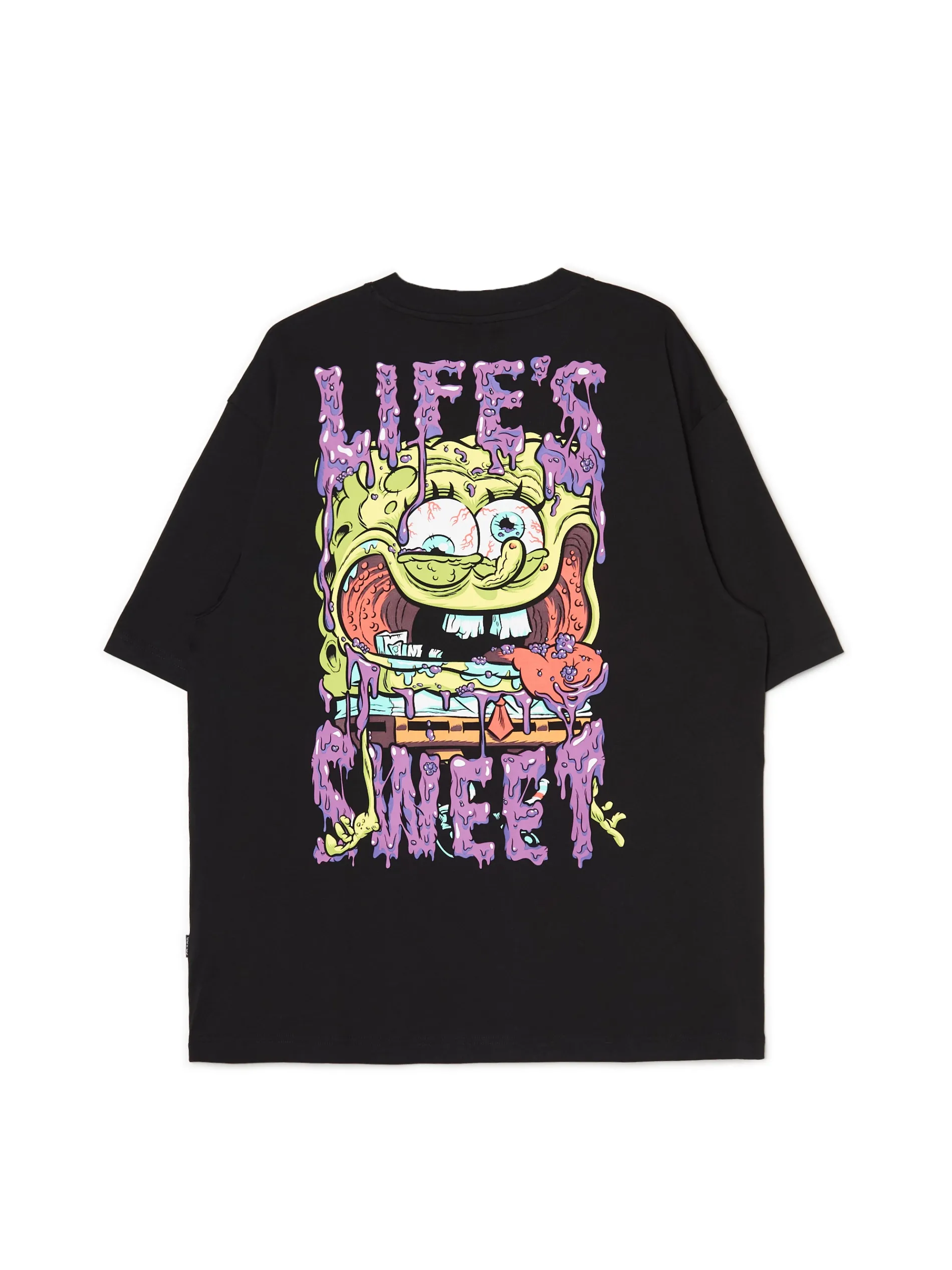 Czarna męska koszulka typu comfort z krótkim rękawem. Artystyczny wizerunek z przodu i na plecach najpopularniejszej gąbki świata. bawełna 100% luźny, swobodny krój typu comfort proste, krótkie rękawy duży nadruk na plecach i mniejszy na przodzie © 2024 Viacom International. Created by Stephen Hillenburg.