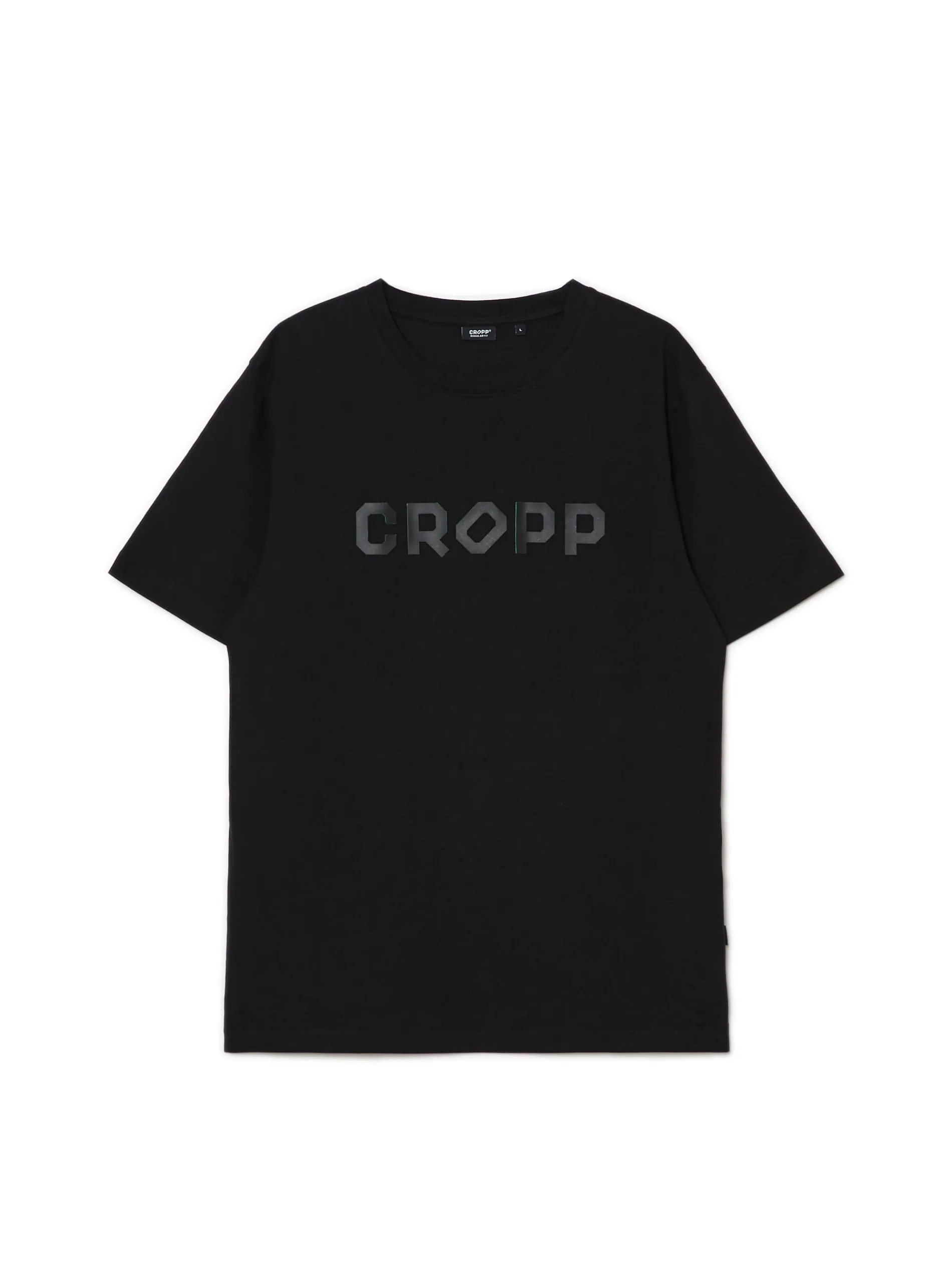 Czarna męska koszulka o kroju regular, uszyta z bawełny. Z przodu nadruk tekstowy CROPP. 100% bawełny regularny krój uniwersalny basicowy styl krótkie, swobodne rękawy Wzrost modela: 184 cm