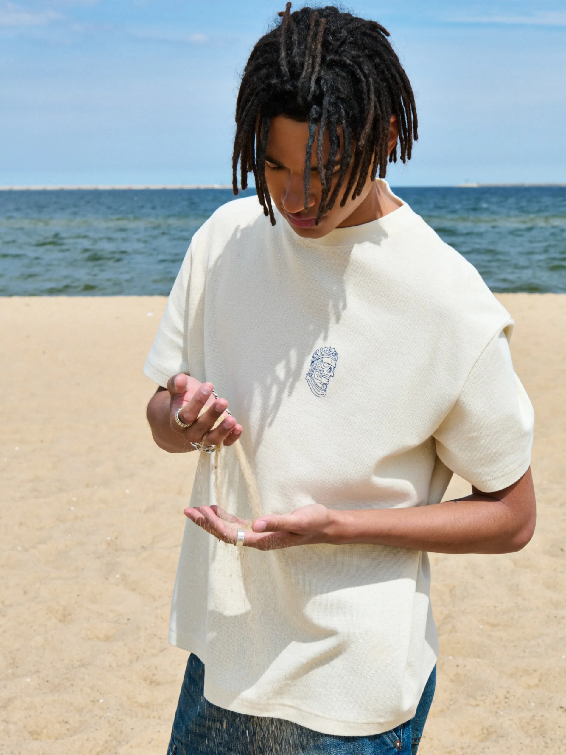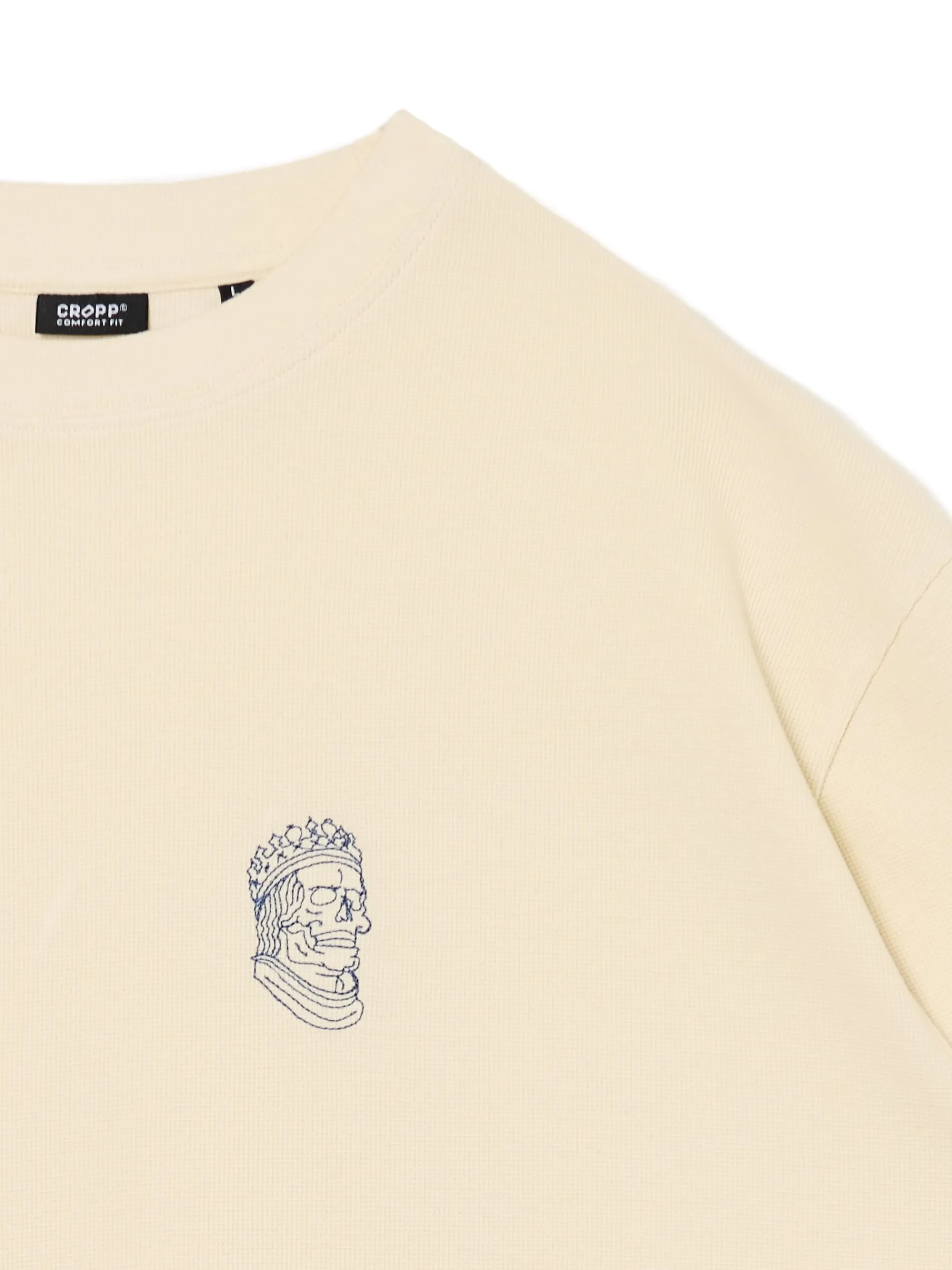 Męska koszulka z krótkim rękawem, uszyta z bawełny. Na przodzie drobna naszywka w oryginalnym kształcie. 100% bawełny swobodny, luźny krój półokrągły dekolt z lamówką krótkie rękawy z obniżoną linią ramion