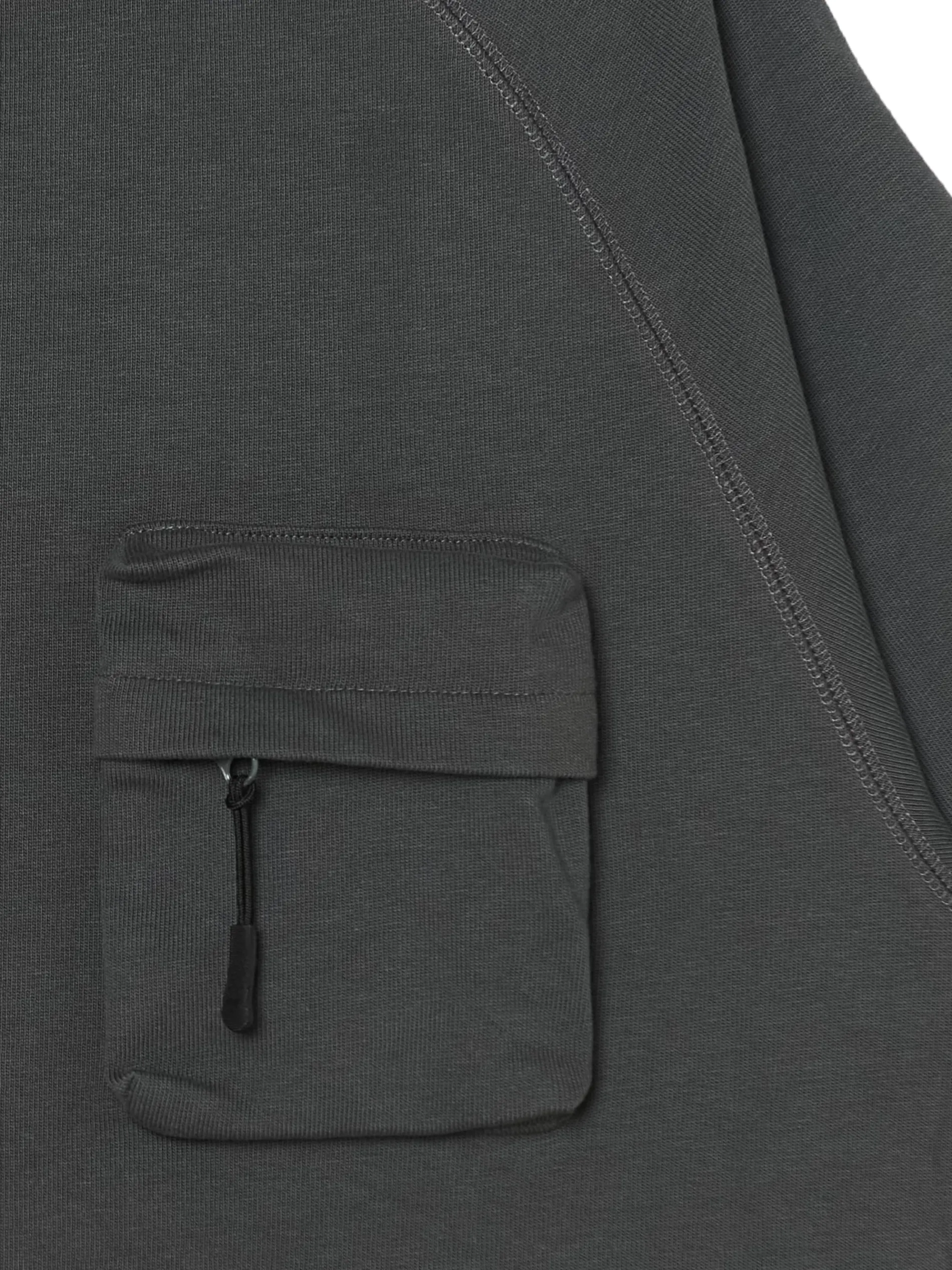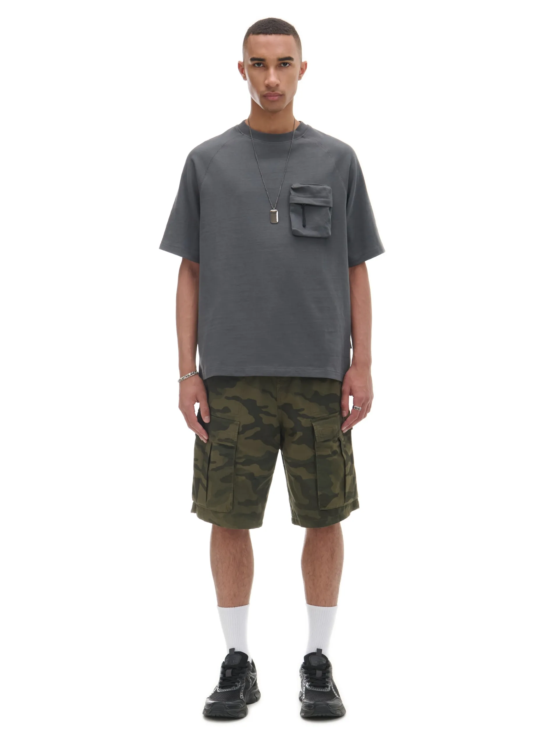 T-shirt męski w kolorze szarym, uszyty z bawełnianego materiału. Wyróżnikiem tego modelu jest kieszonka typu cargo na przodzie zapinana na zamek. 100% bawełny wygodny krój comfort krótkie, raglanowe rękawy półokrągły dekolt ze ściągaczem kieszeń piersiowa z krytym zamkiem Wzrost modela: 185 cm