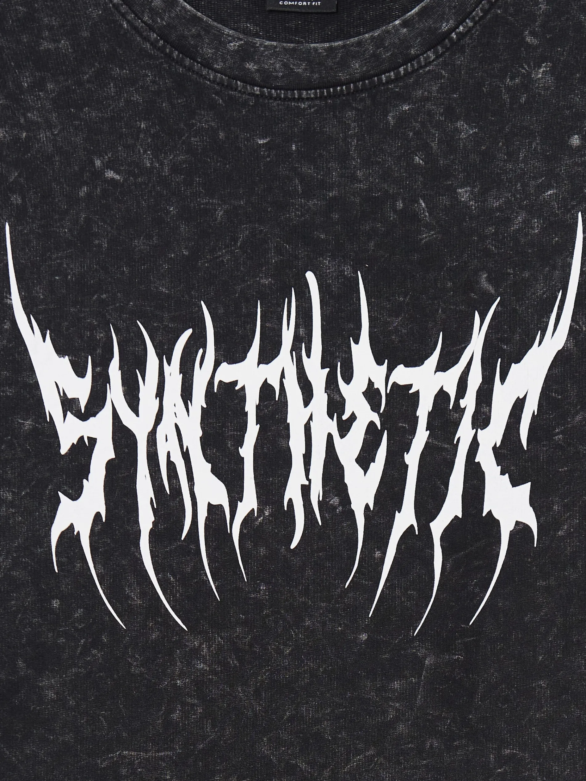 Czarna koszulka męska o kroju comfort, z obniżoną linią ramion i krótkimi rękawami. Uszyta z bawełnianej dzianiny. Z przodu nadruk, na całości efekt acid wash. Wzrost modela: 184 cm