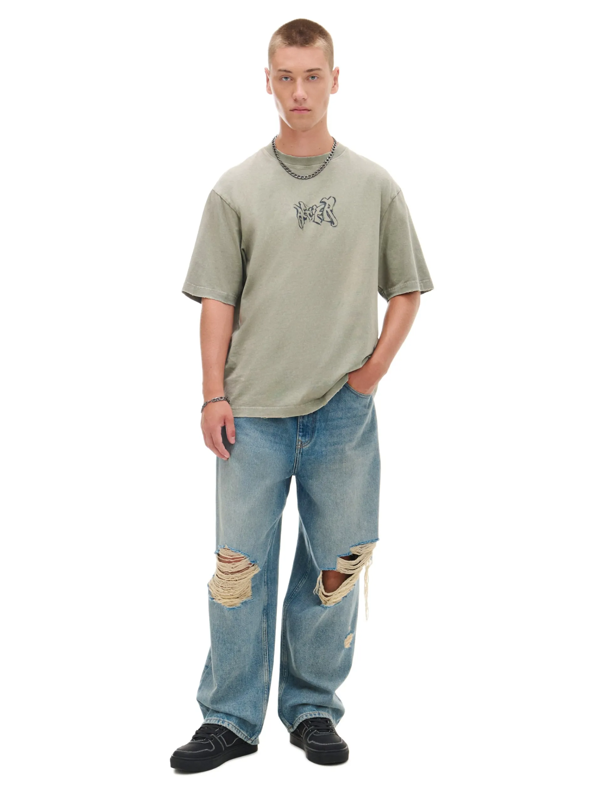 Koszulka męska z krótkim rękawem uszyta z bawełnianej dzianiny. Ozdobą tego modelu są surowo wykończone brzegi materiału, efekt sprania na całej powierzchni i nadruk na piersi. 100% bawełny wygodny krój comfort krótkie, swobodne rękawy surowe wykończenie brzegów efekt sprania na całości nadruk z przodu Wzrost modela: 185 cm