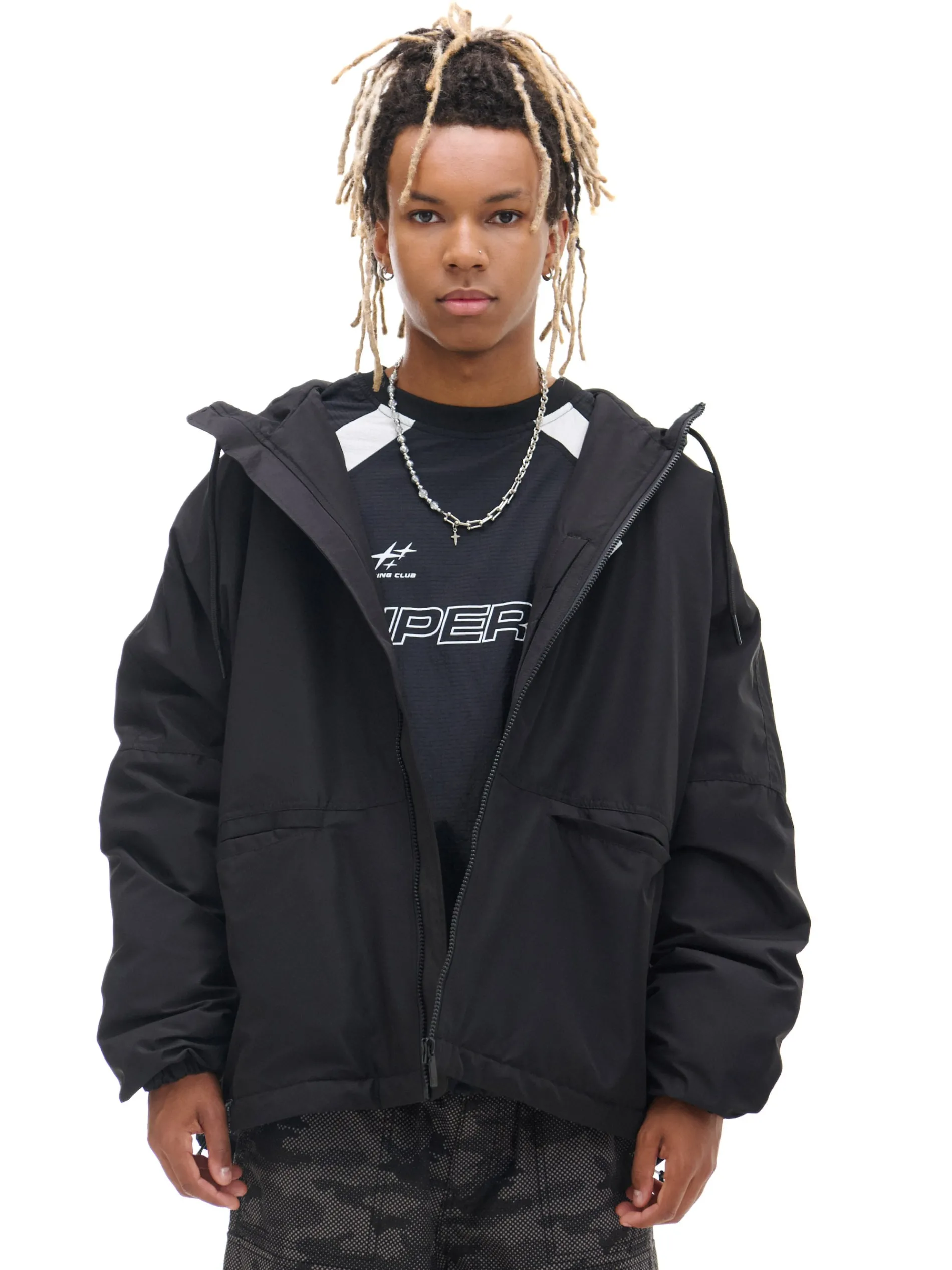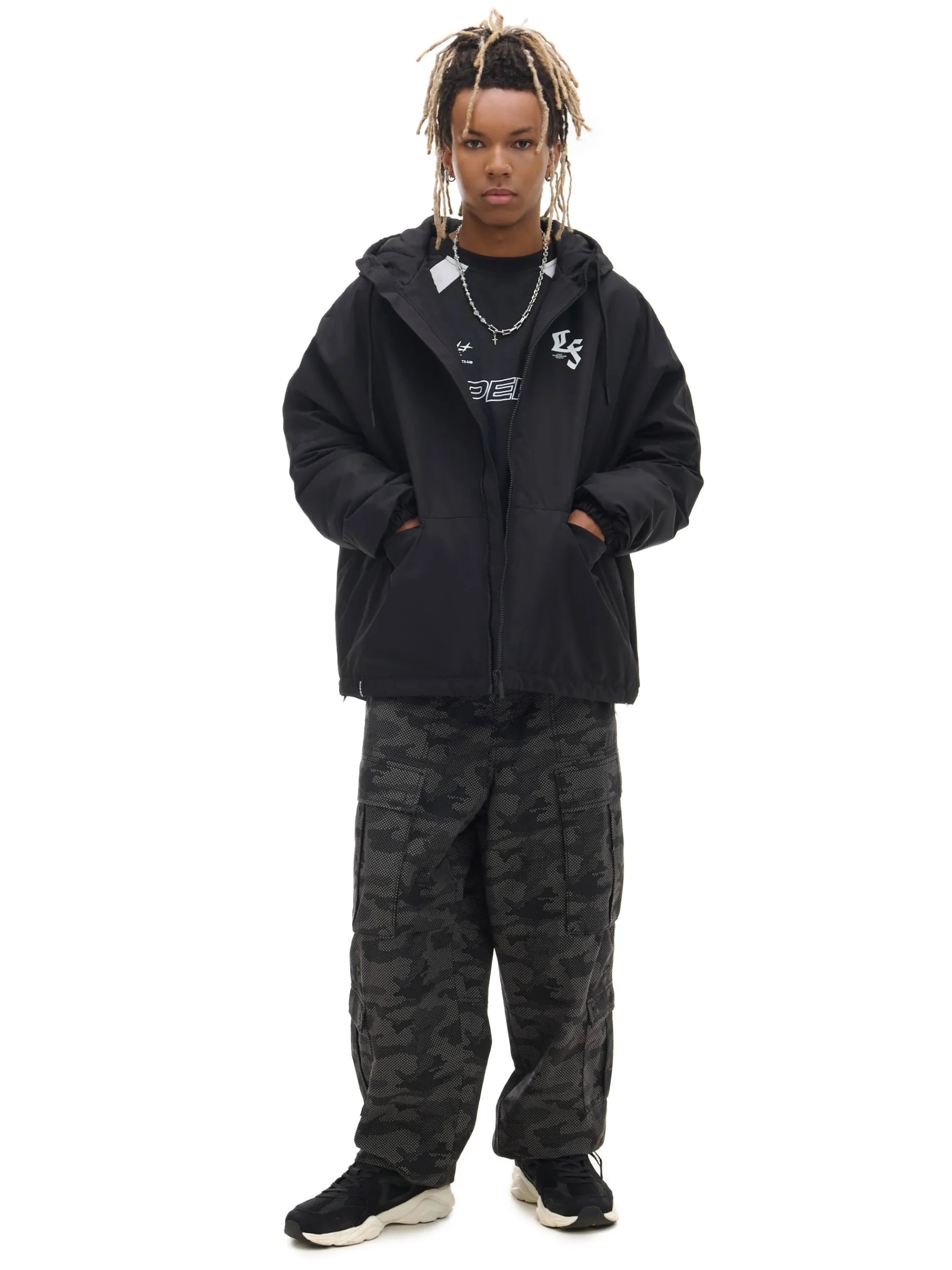 Lekka męska kurtka o luźnym kroju z szerokimi rękawami. Elastyczne ściągacze przy mankietach i w pasie dodają komfortu podczas noszenia. wewnątrz lekkie ocieplenie i podszewka zapinana na zamek na całej długości wysoka stójka i regulowany kaptur długie rękawy z gumką przy mankietach dwie kieszenie z przodu wewnętrzna kieszeń zapinana na rzep ściągacz tunelowy ze stoperami na dole mały nadruk na piersi, duży nadruk na plecach PROTECTION LEVEL 2rn Kurtka uszyta z tkaniny z lekkim wypełnieniem, której właściwości zapewnią Ci ochronę przed wiatrem i deszczem. Doskonale sprawdzi się w sezonie przejściowym.