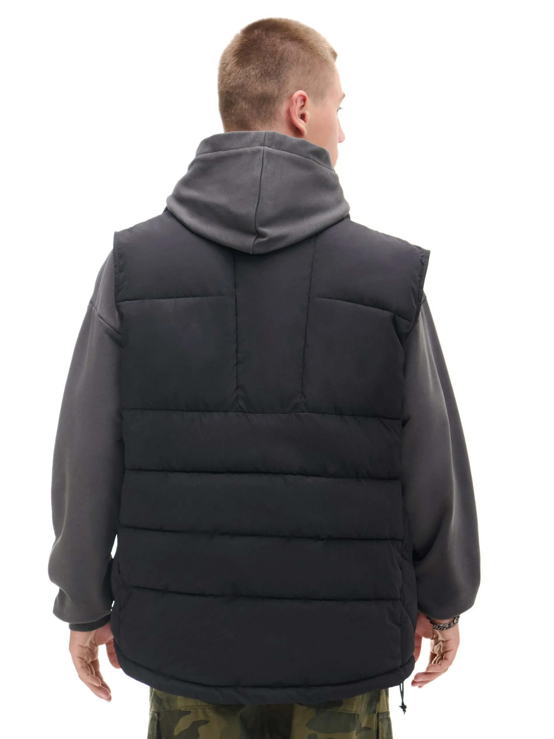 Lekko ocieplana kamizelka męska, wykonana z gładkiej czarnej tkaniny. wysoki kołnierz w formie stójki kieszenie boczne na całości nadruk wykończenie na podszewce, syntetyczne wypełnienie u dołu regulacja obwodu za pomocą stoperów Wzrost modela: 185 cm Wzrost modela: 184 cm PROTECTION LEVEL 2 Kamizelka uszyta z tkaniny z lekkim wypełnieniem, której właściwości zapewnią Ci ochronę przed wiatrem i deszczem. Doskonale sprawdzi się w sezonie przejściowym.