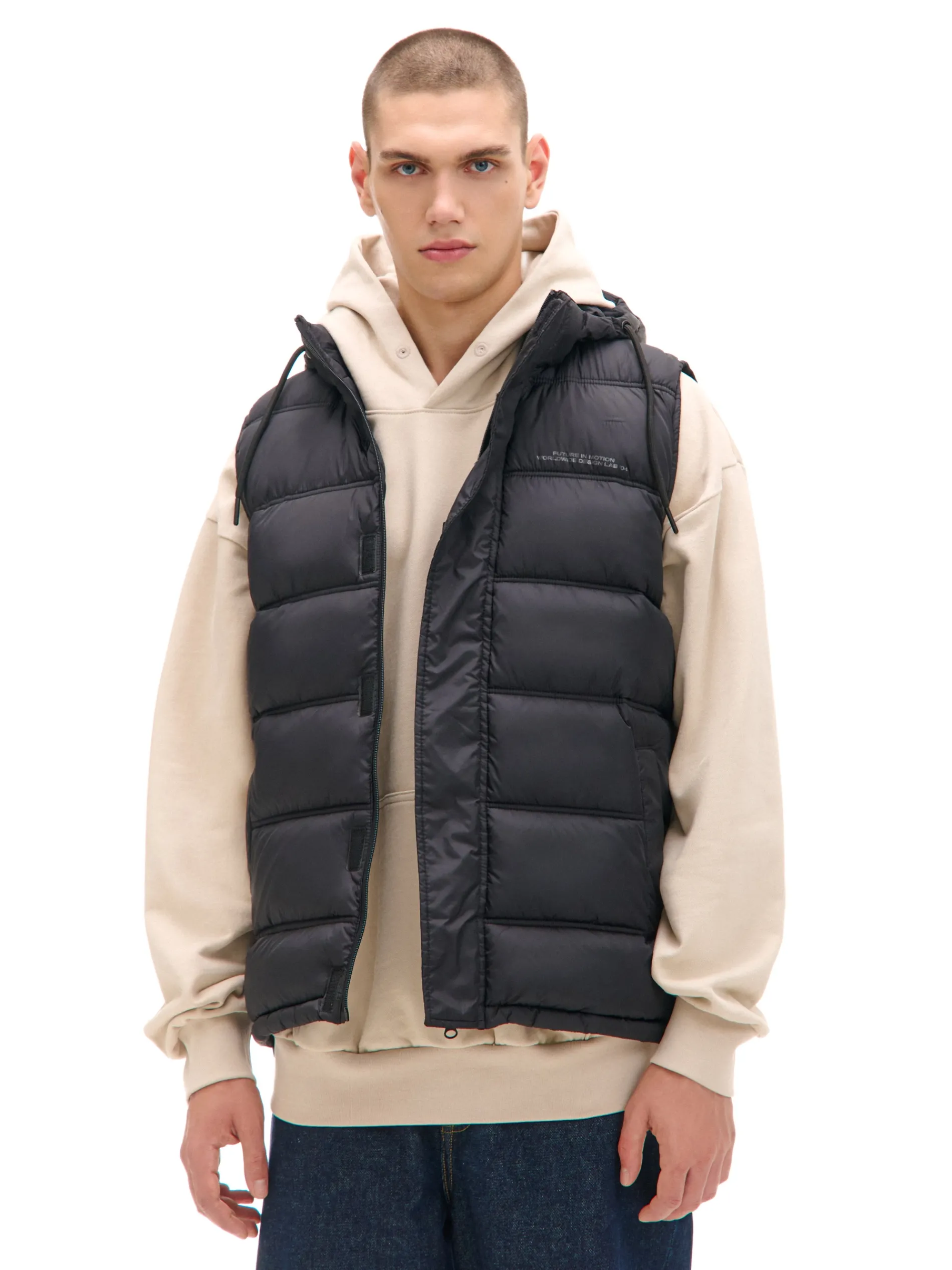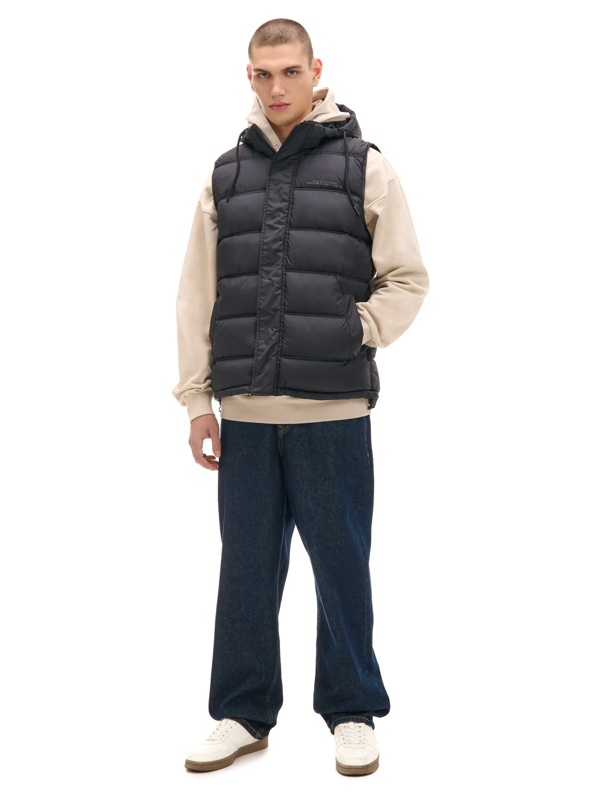 Męska kamizelka z kapturem, uszyta z trwałego, pikowanego materiału. Wygodne zapięcie, praktyczne kieszenie i poręczne regulacje zapewnią Ci komfort noszenia. pikowanie na całości zapięcie na zamek na całej długości listwa kryjąca z zapięciem na rzepy miękki, odpinany kaptur z troczkami wysoki kołnierz ściągacz tunelowy ze stoperami na dole otwarte kieszenie po bokach wewnętrzna kieszeń na rzep ozdobny nadruk tekstowy na piersi PROTECTION LEVEL 2 Kamizelka uszyta z tkaniny z lekkim wypełnieniem, której właściwości zapewnią Ci ochronę przed wiatrem i deszczem. Doskonale sprawdzi się w sezonie przejściowym.