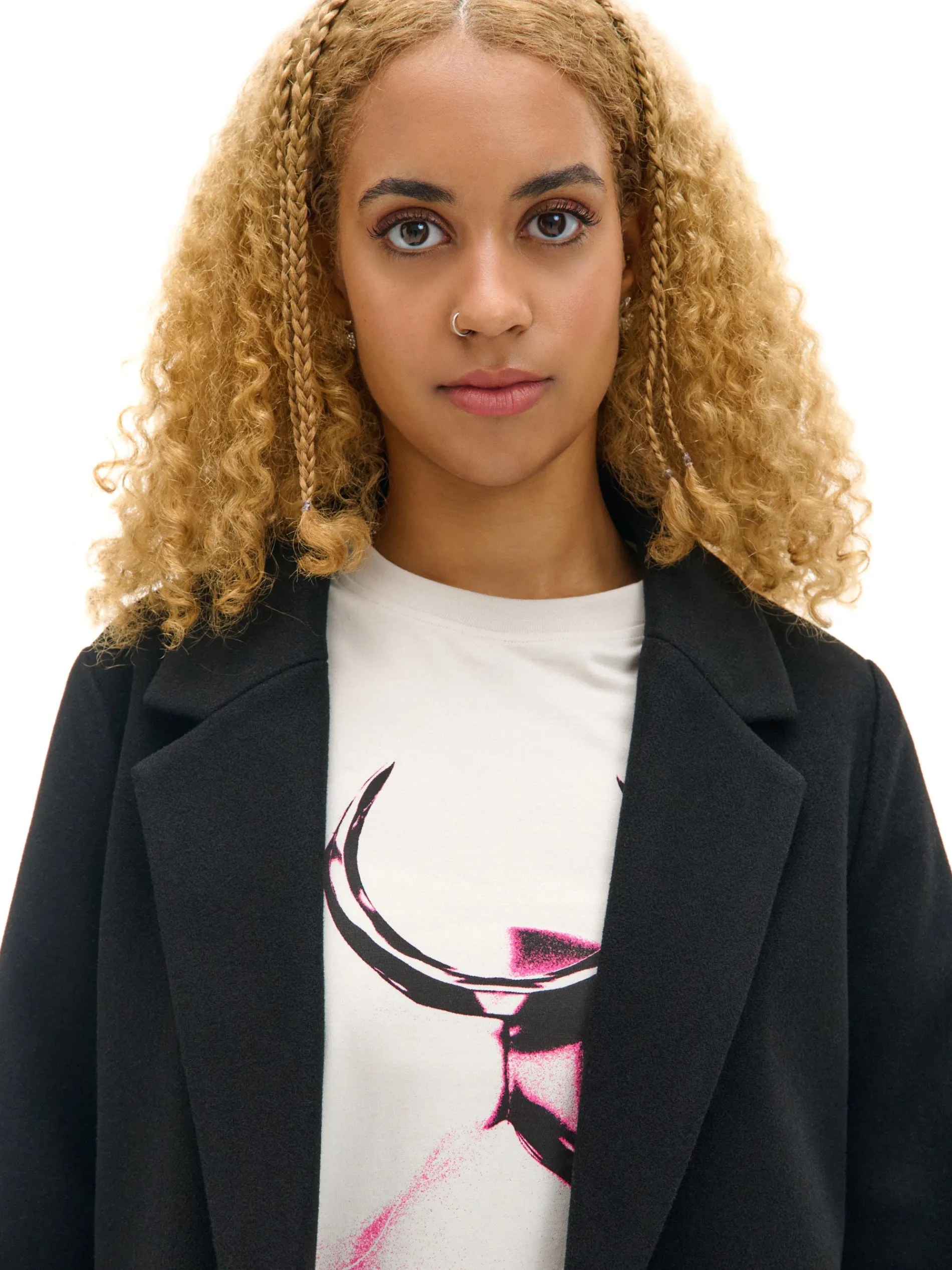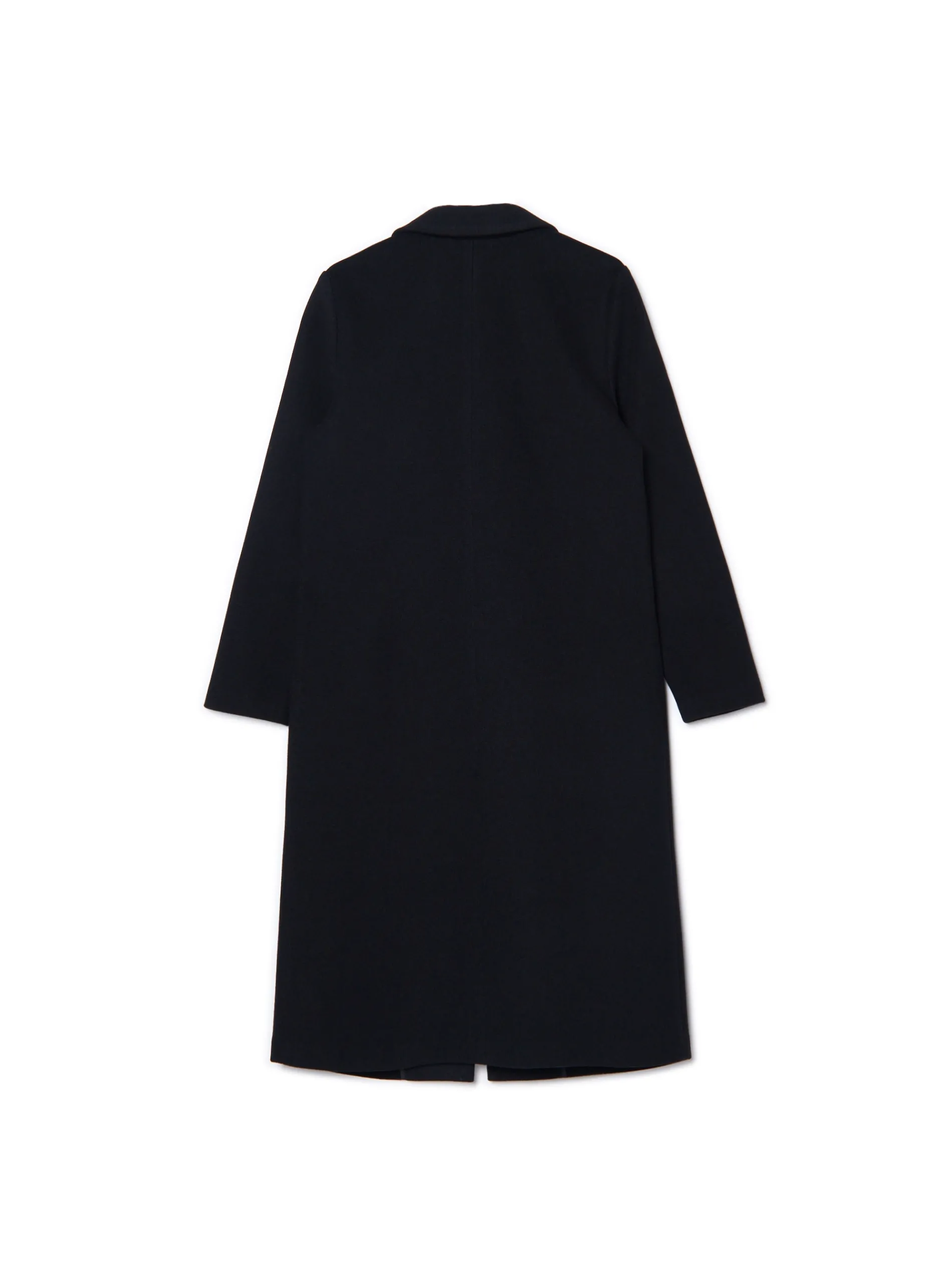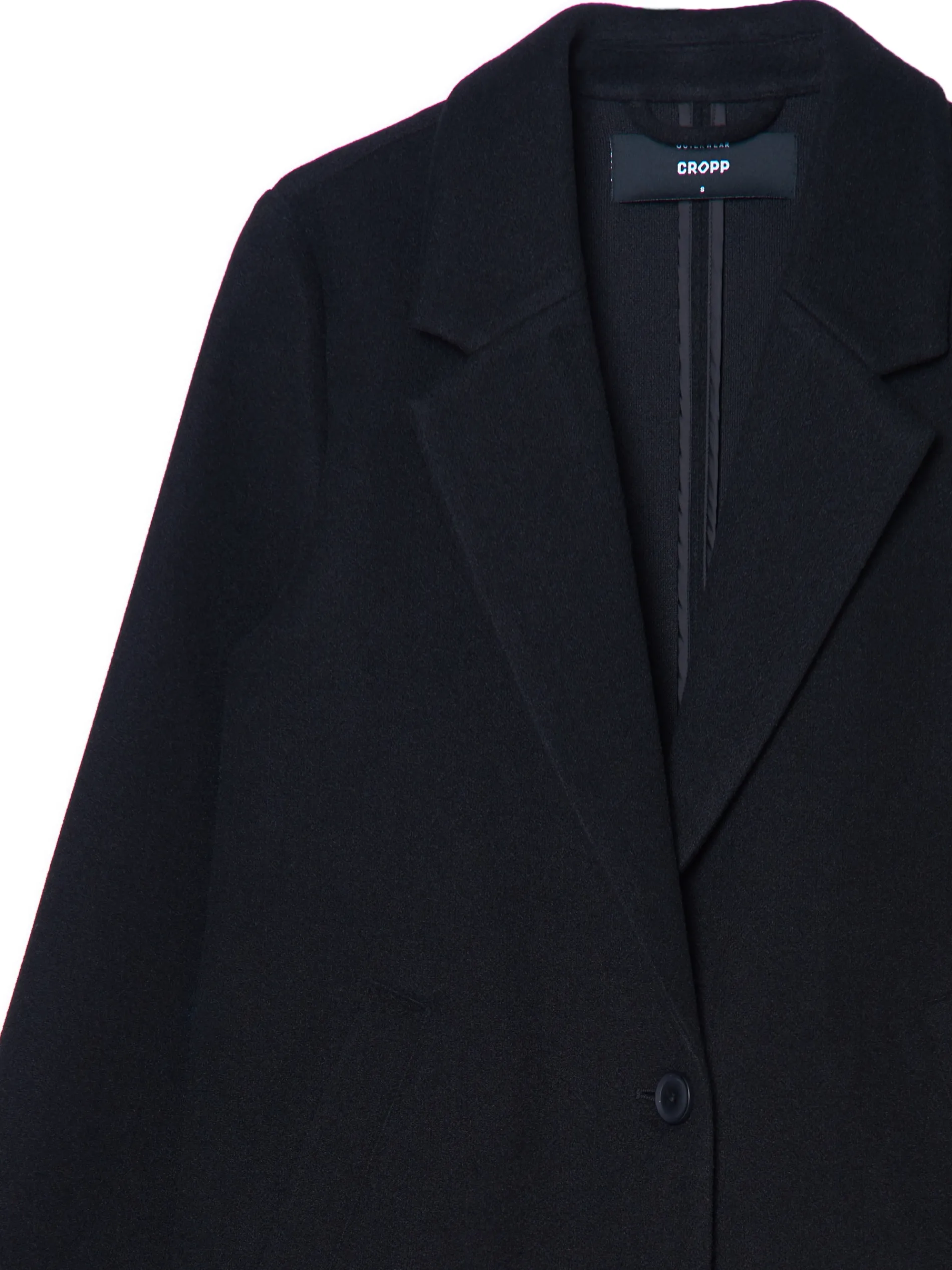 Prosty damski płaszcz, uszyty z gładkiej dzianiny w czarnym kolorze. regularny krój zapięcie na guzik lamowane szwy wewnątrz wykładany kołnierz dwie kieszenie po bokach