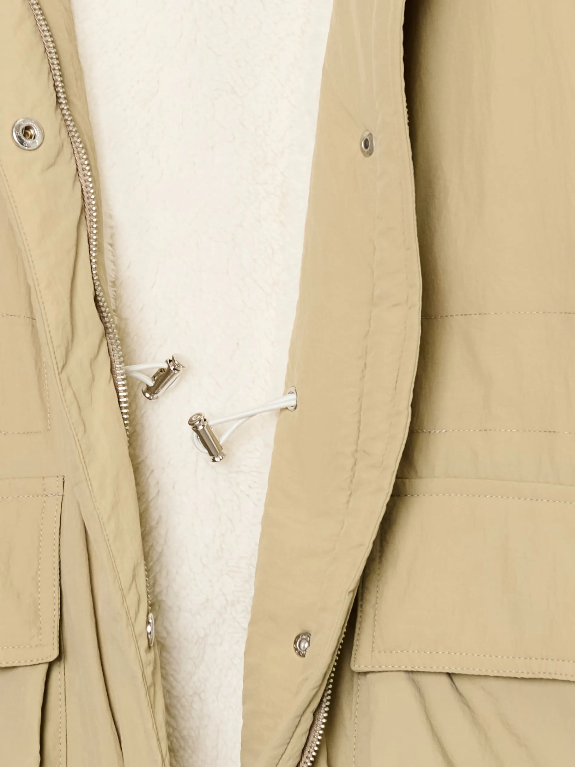 Płaszcz, który otula w środku i genialnie wygląda na zewnątrz, czyli model damskiej parki wykończonej na podszyciu ze sztucznego baranka. Wyposażona w podwójne kieszenie boczne i inne ciekawe rozwiązania, które warto odkryć. przejściowy płaszcz typu parka regularny krój miękka podszewka ze sztucznego baranka zapięcie na podwójny zamek listwa kryjąca z zapięciem na zatrzaski kaptur regulowany sznurkiem 5 kieszeni, w tym kieszenie cargo ściągacz tunelowy ze stoperami w talii