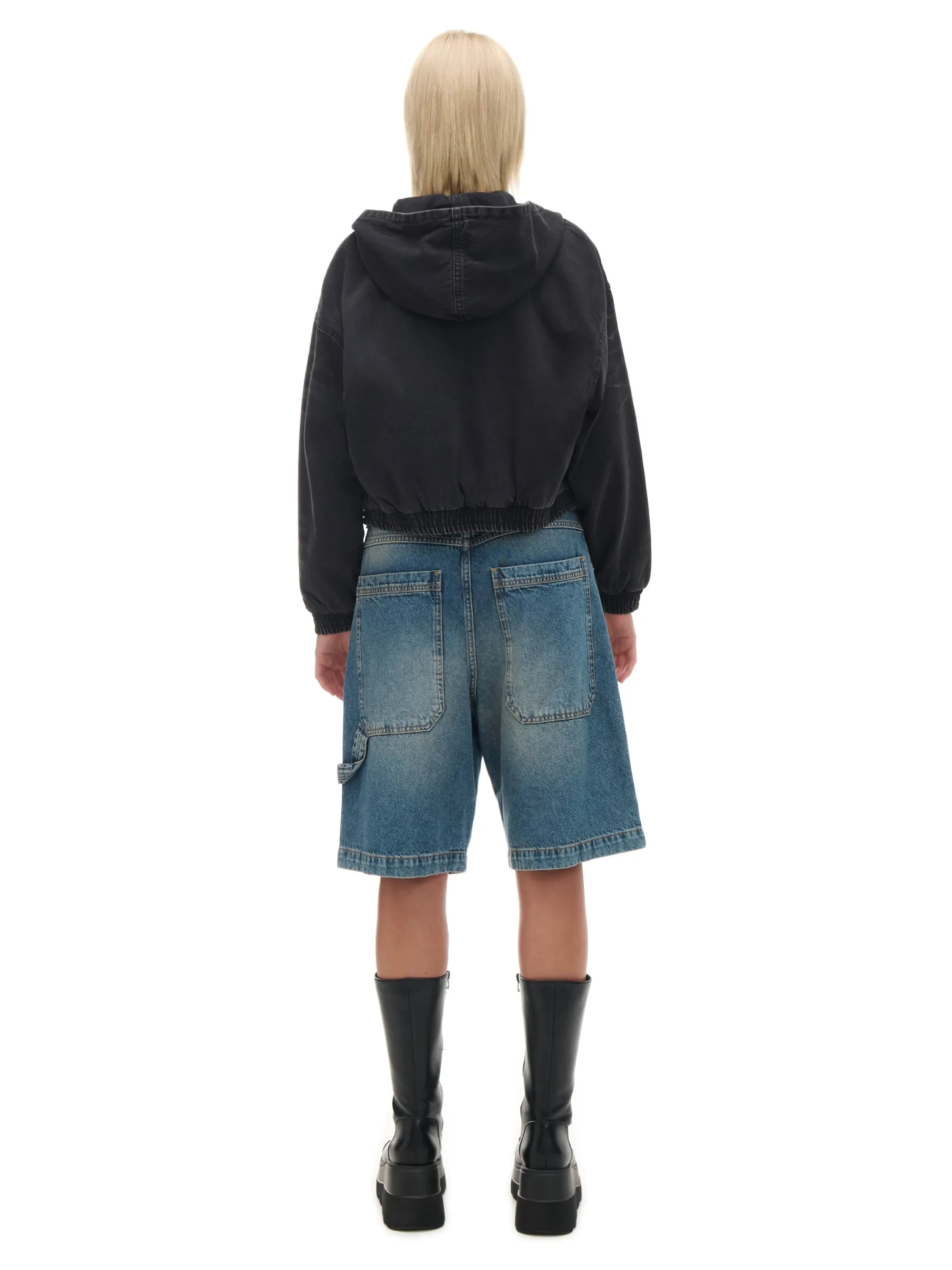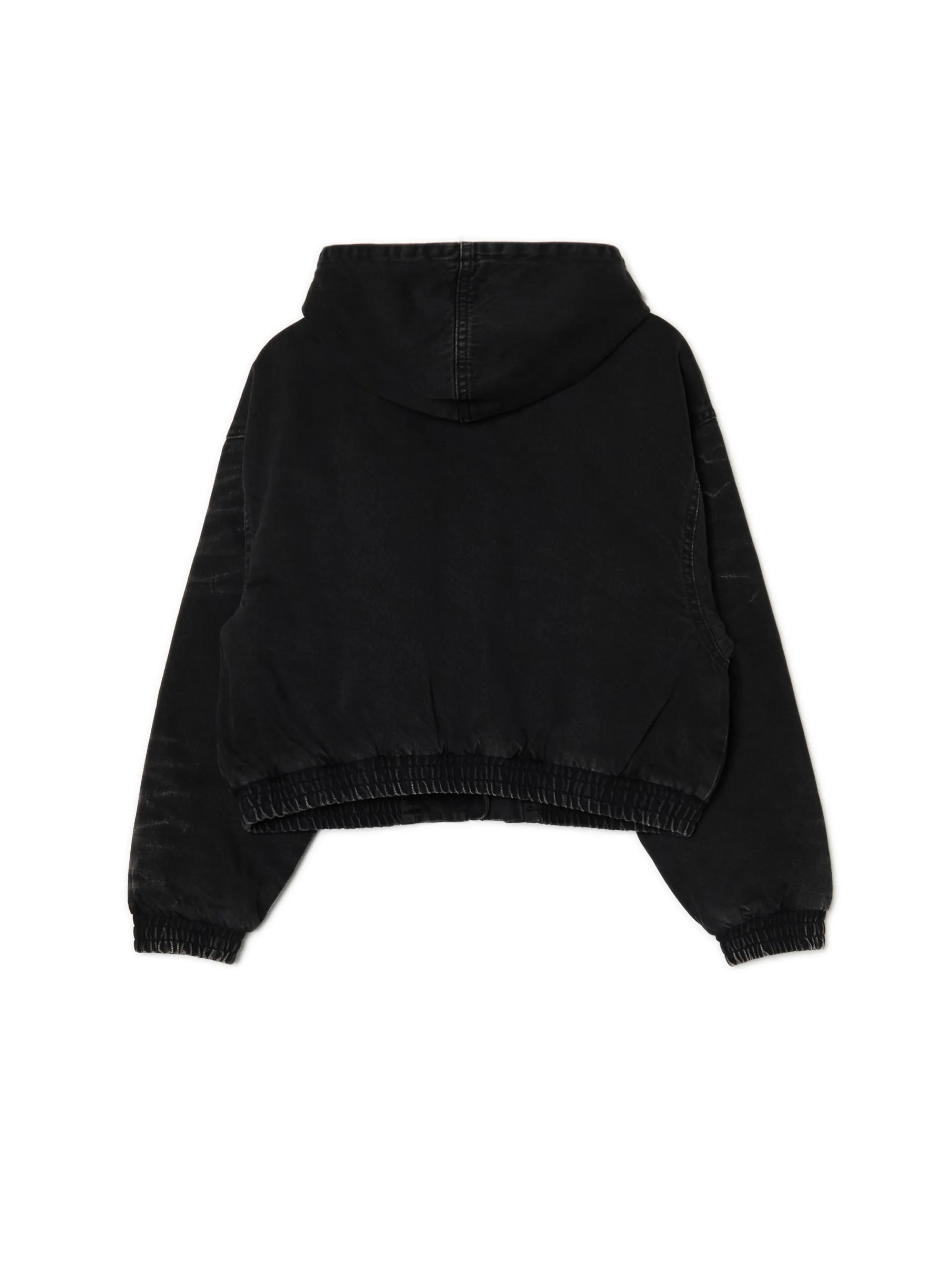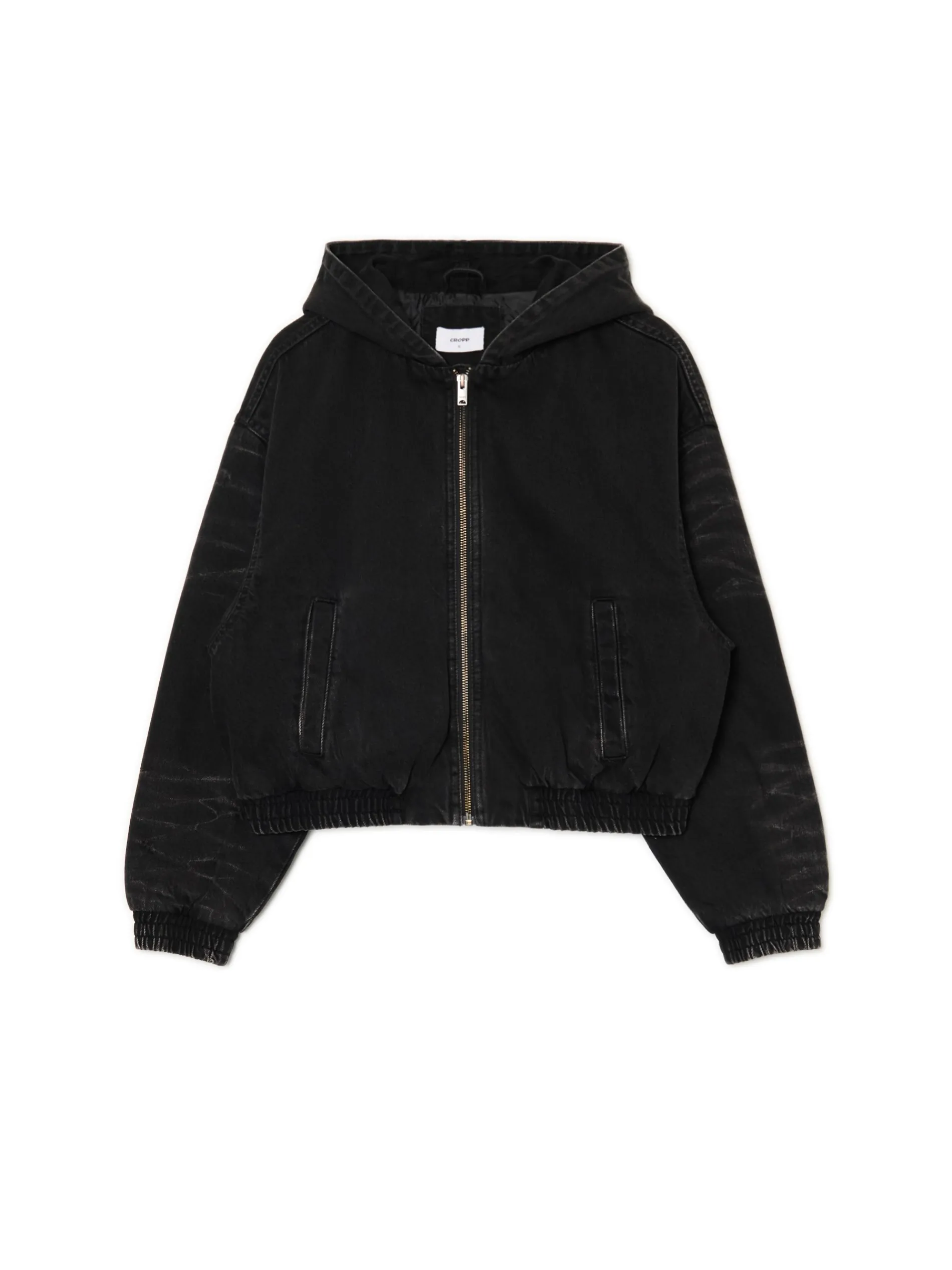 Krótka damska kurtka typu bomber, uszyta z denimowej tkaniny. Efekt sprania na całej powierzchni nadaje jej casualowego charakteru. denimowa kurtka o krótszym kroju zapięcie na metalowy zamek obszerny kaptur swobodne rękawy z obniżoną linią ramion otwarte kieszenie po bokach dół i mankiety wykończone ściągaczami efekt sprania na całości Wzrost modelki: 177 cm