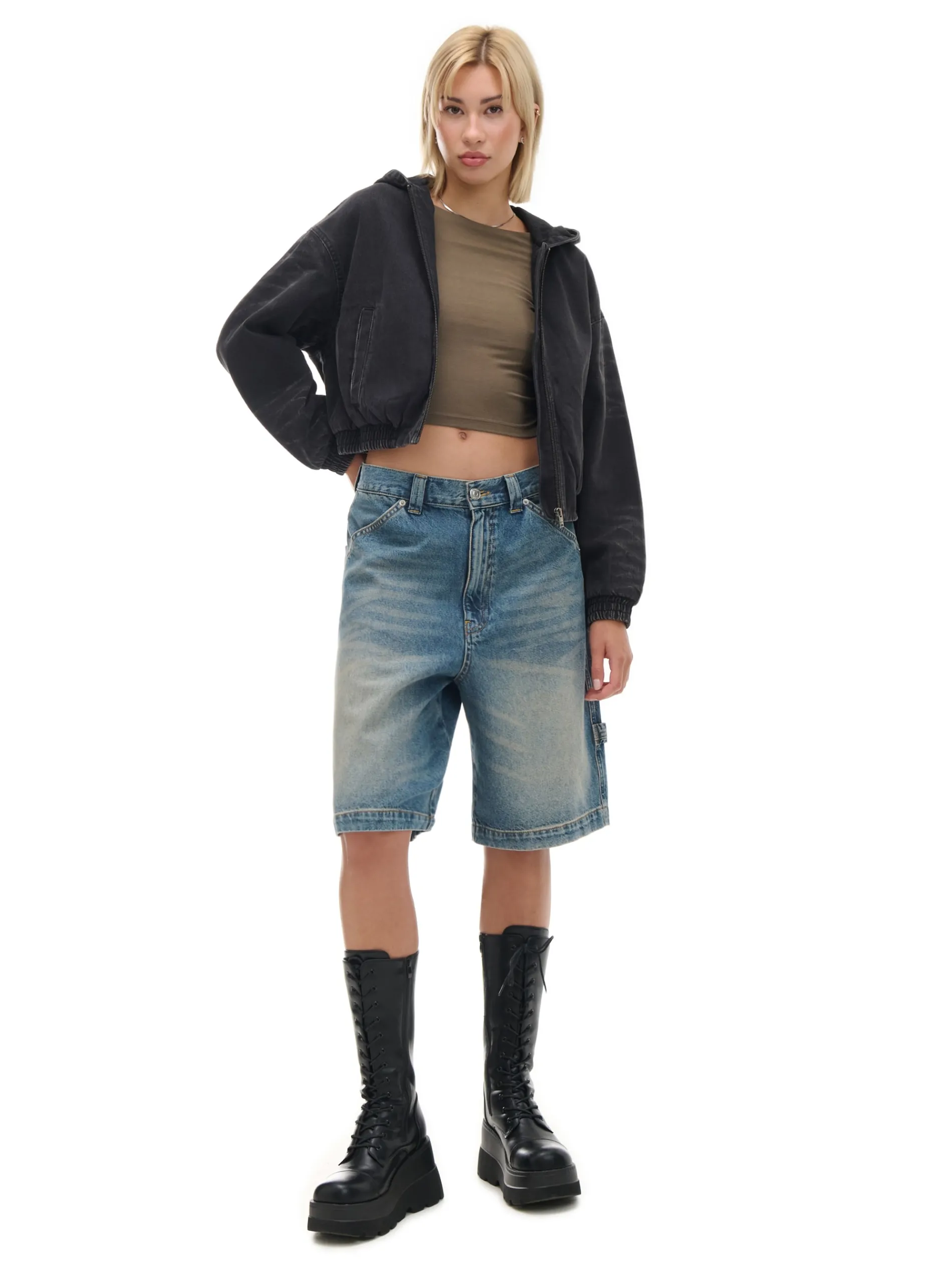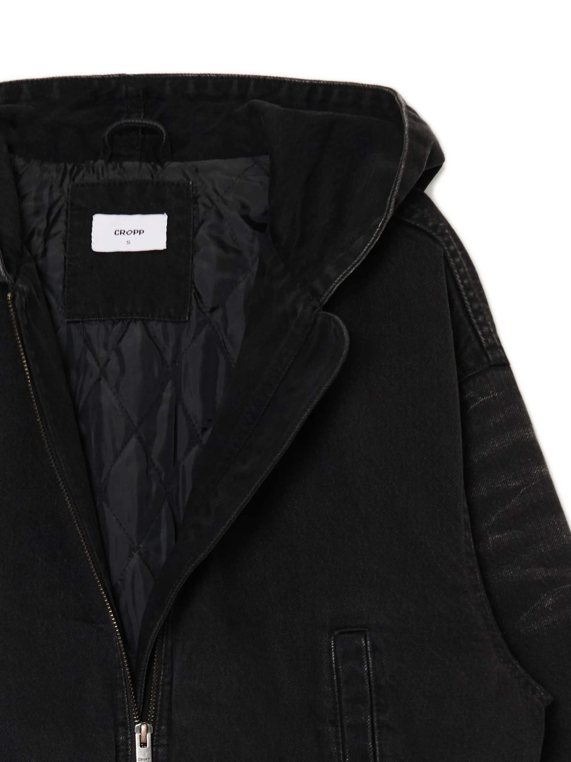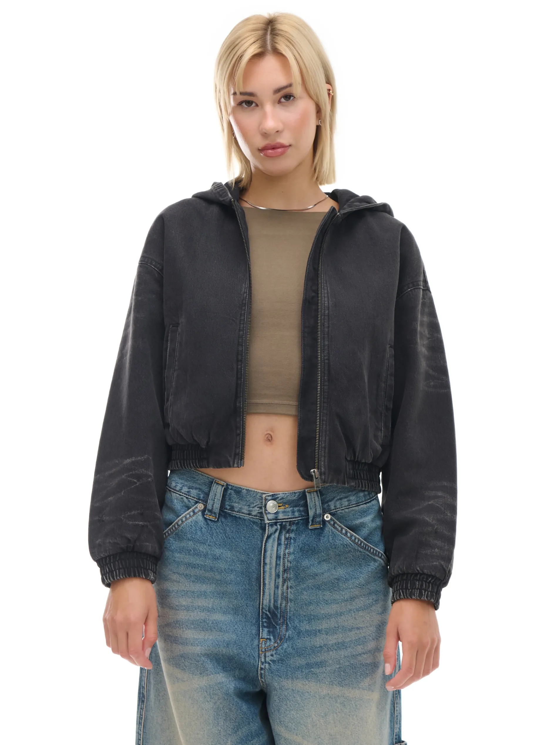 Krótka damska kurtka typu bomber, uszyta z denimowej tkaniny. Efekt sprania na całej powierzchni nadaje jej casualowego charakteru. denimowa kurtka o krótszym kroju zapięcie na metalowy zamek obszerny kaptur swobodne rękawy z obniżoną linią ramion otwarte kieszenie po bokach dół i mankiety wykończone ściągaczami efekt sprania na całości Wzrost modelki: 177 cm