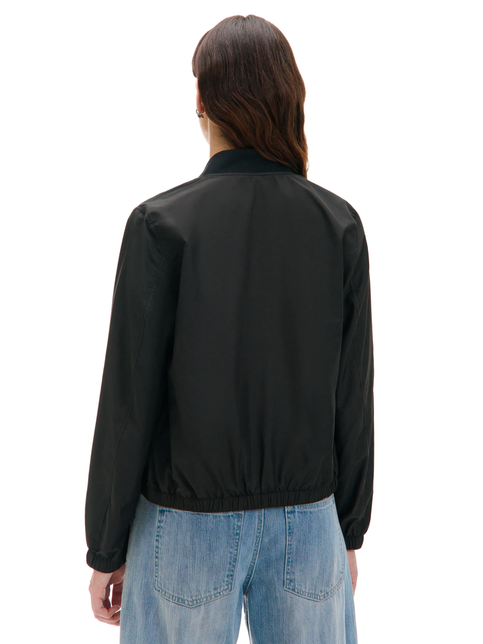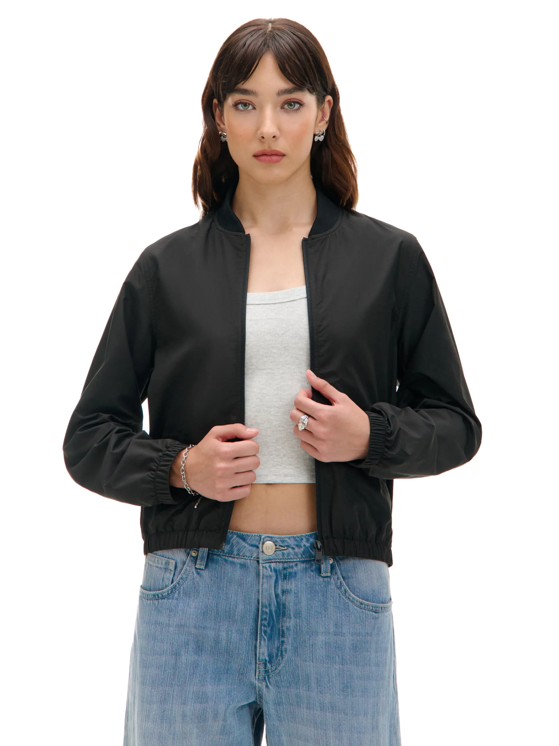 Damska czarna kurtka o kroju bomber, uszyta z lekkiej, gładkiej tkaniny. Idealna do outfitów all black. klasyczny, regularny krój długie rękawy i dolny brzeg zakończone elastyczną gumką zapięcie na suwak dwie kieszenie dostępna w innych kolorach
